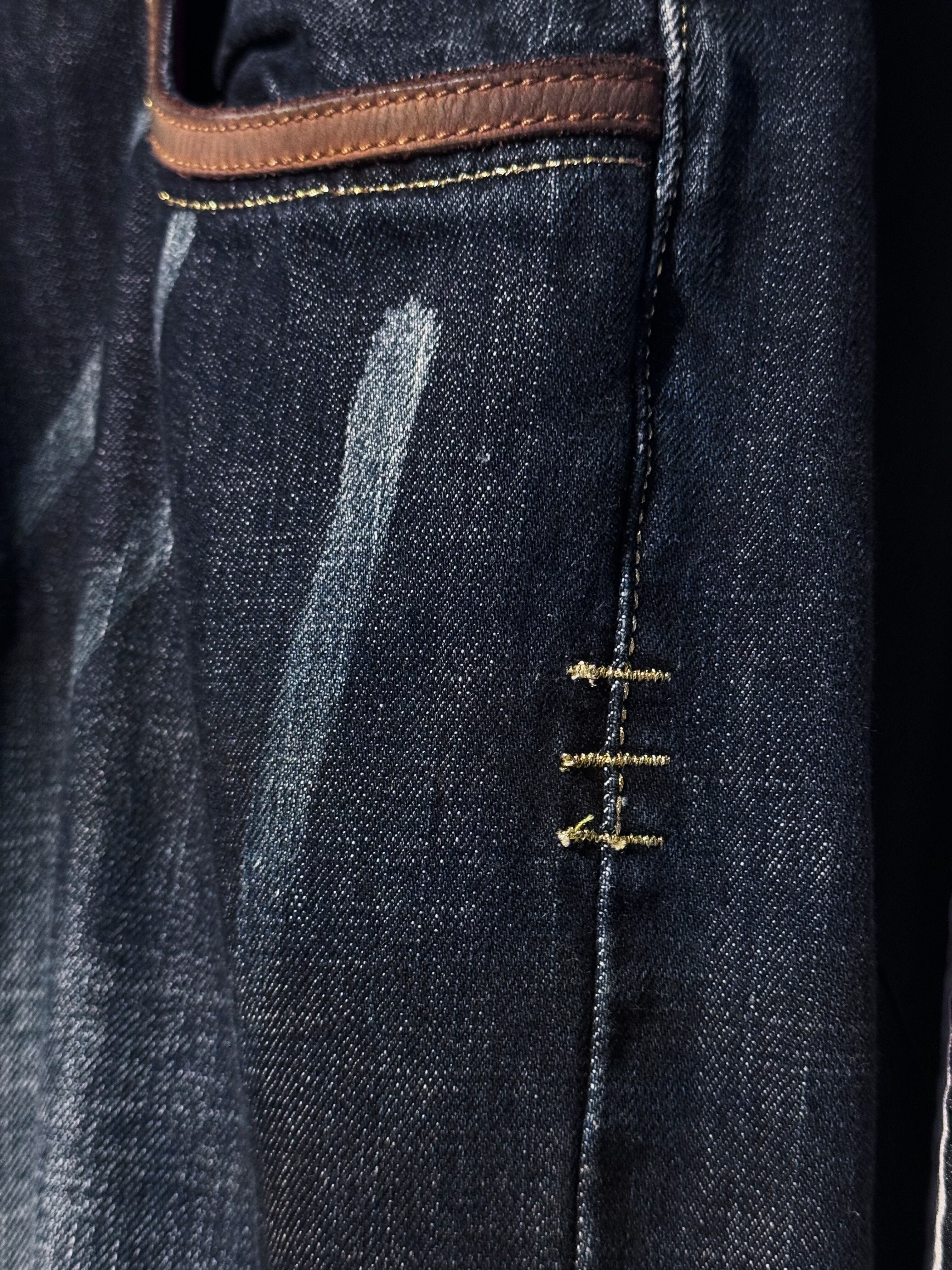 黄金に光り輝くウォレットチェーンの刺繍をデニムに施した他に類を見ないデザイン性を持ったアイテム。