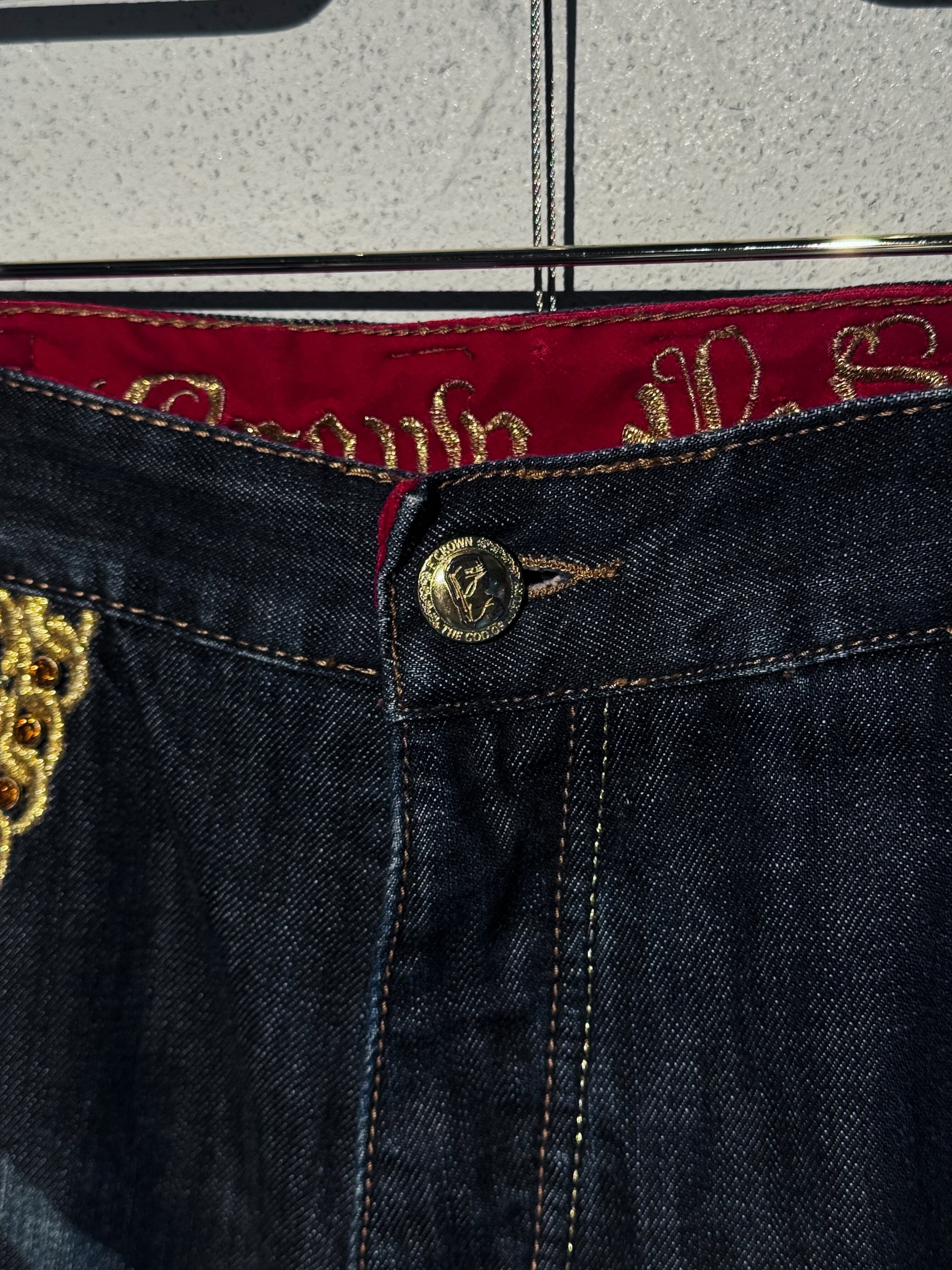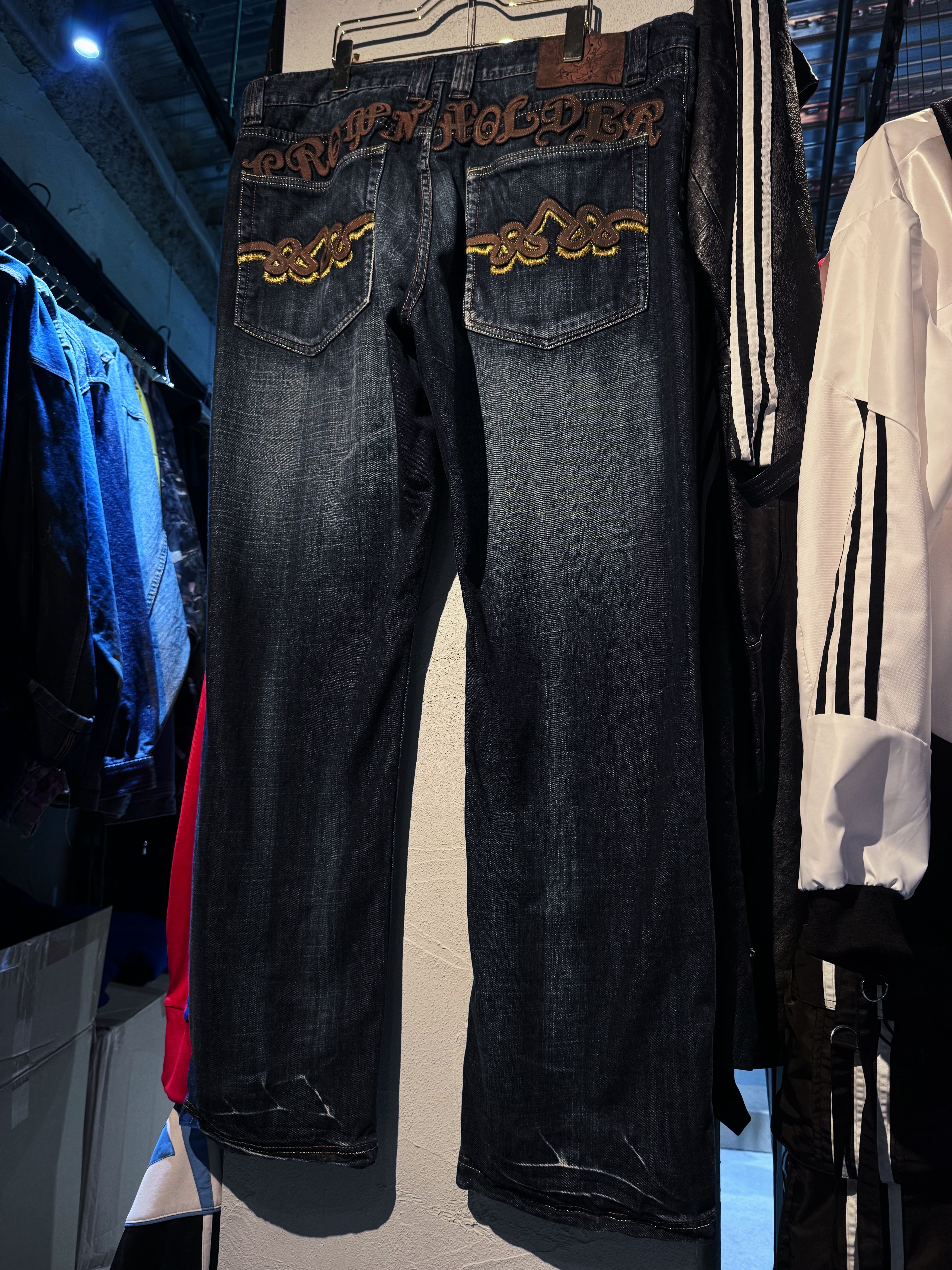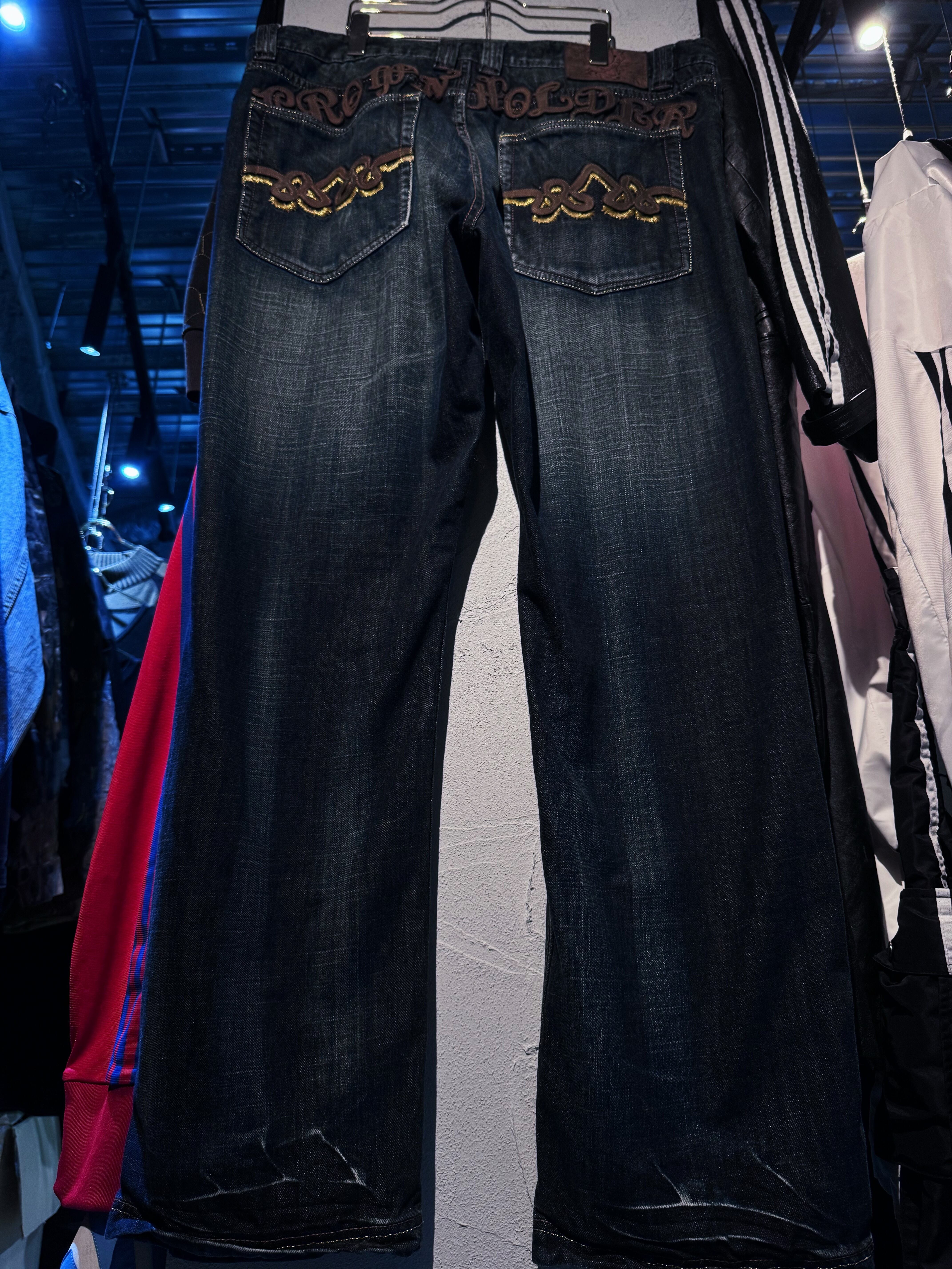 vintage gold wallet chain embroidery design fade buggy denim pants