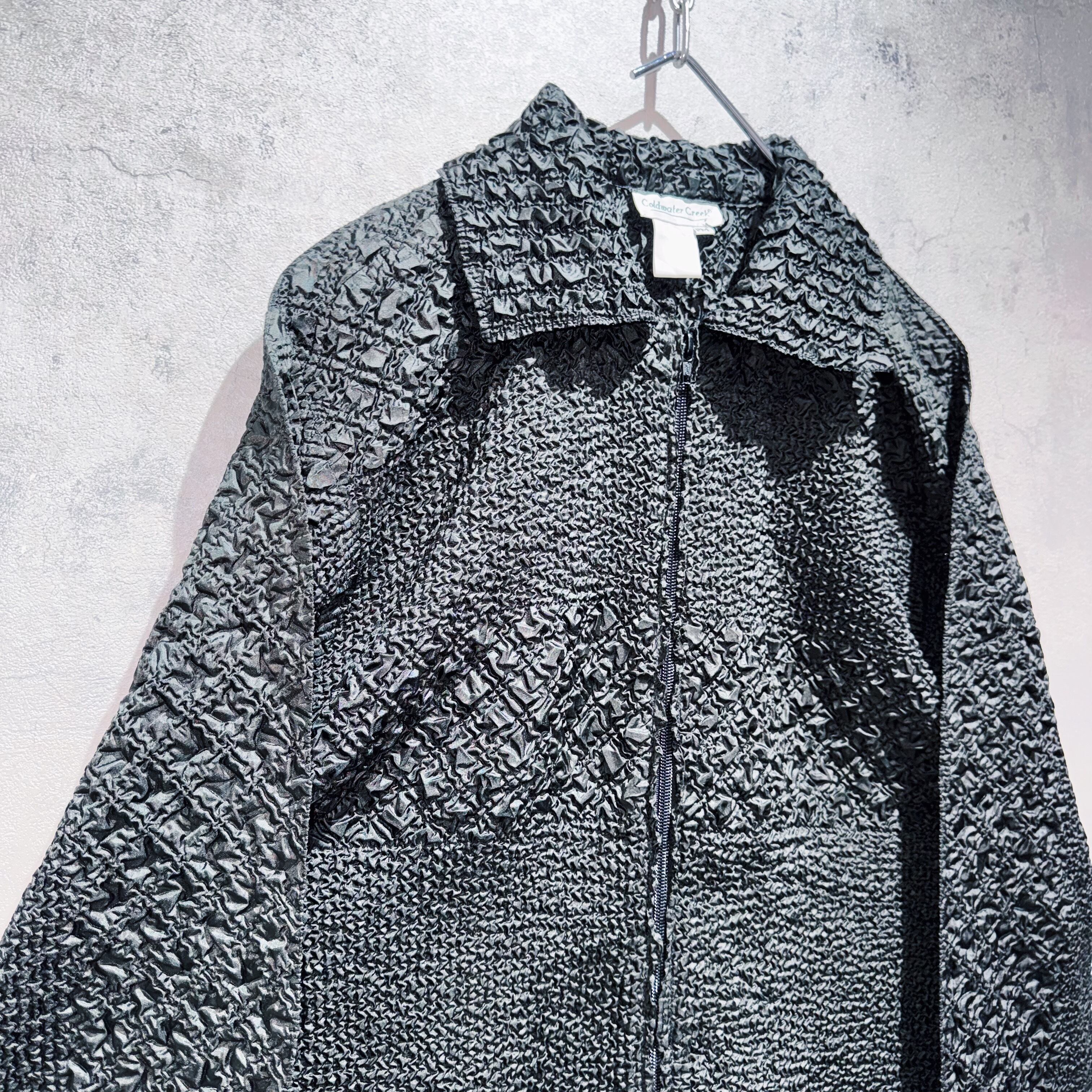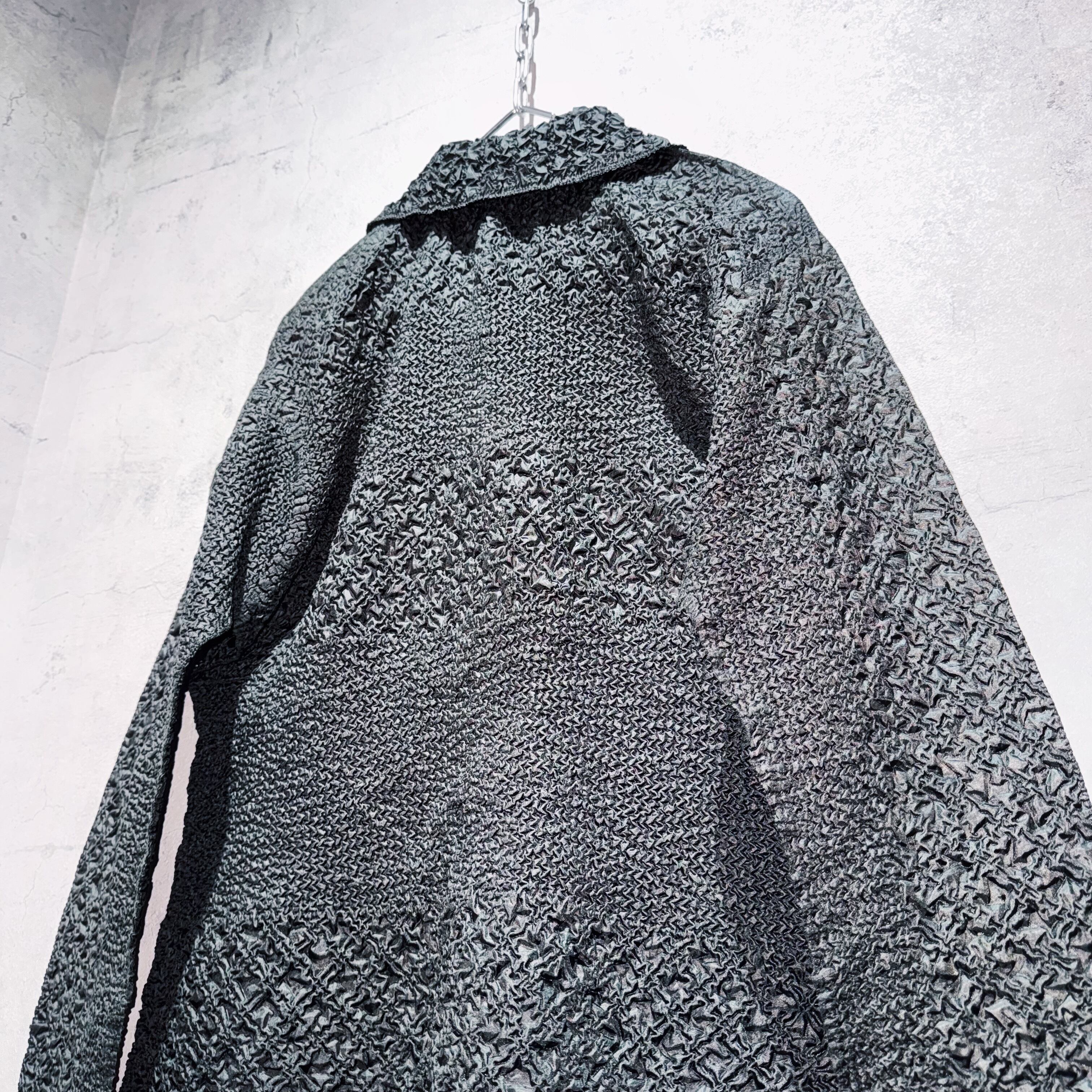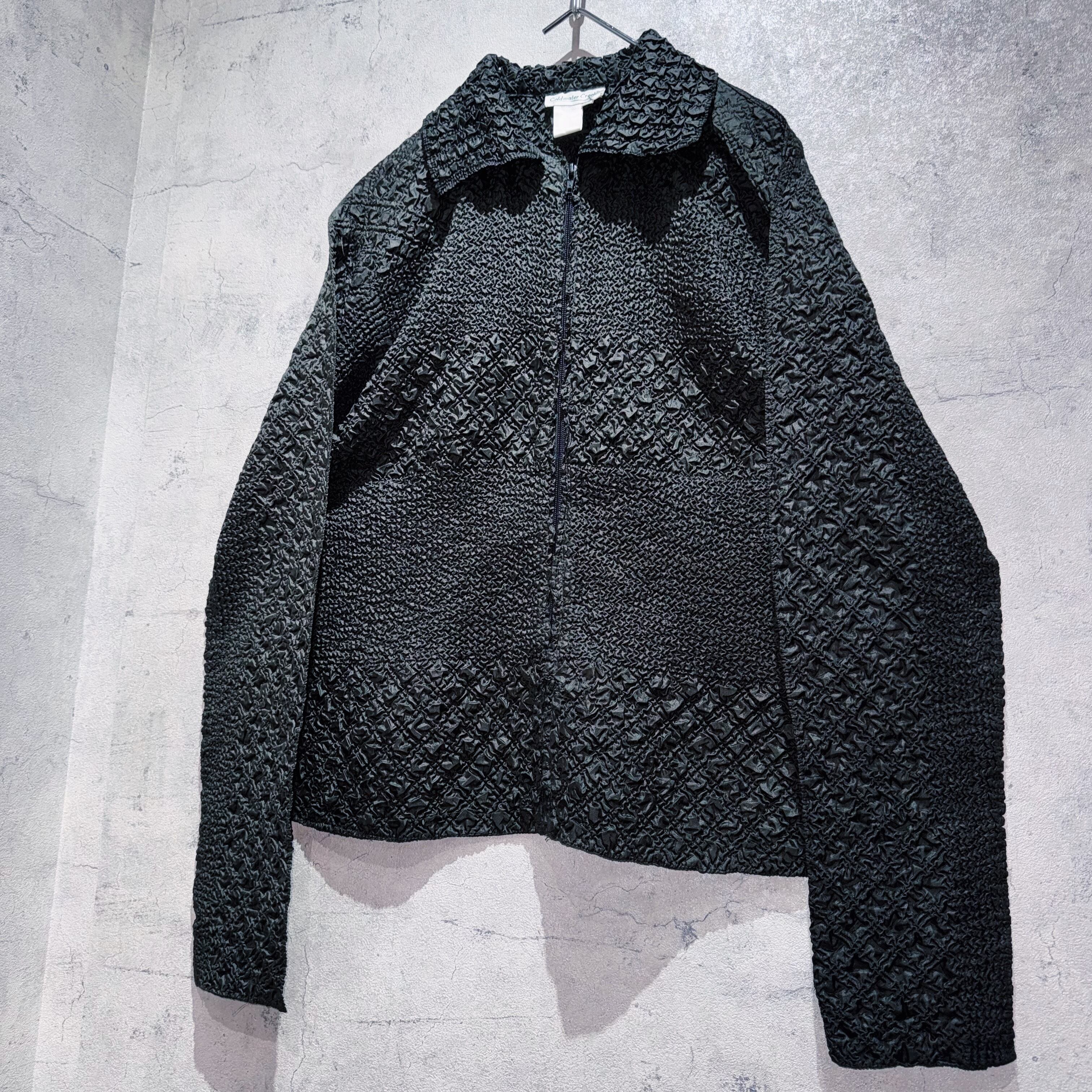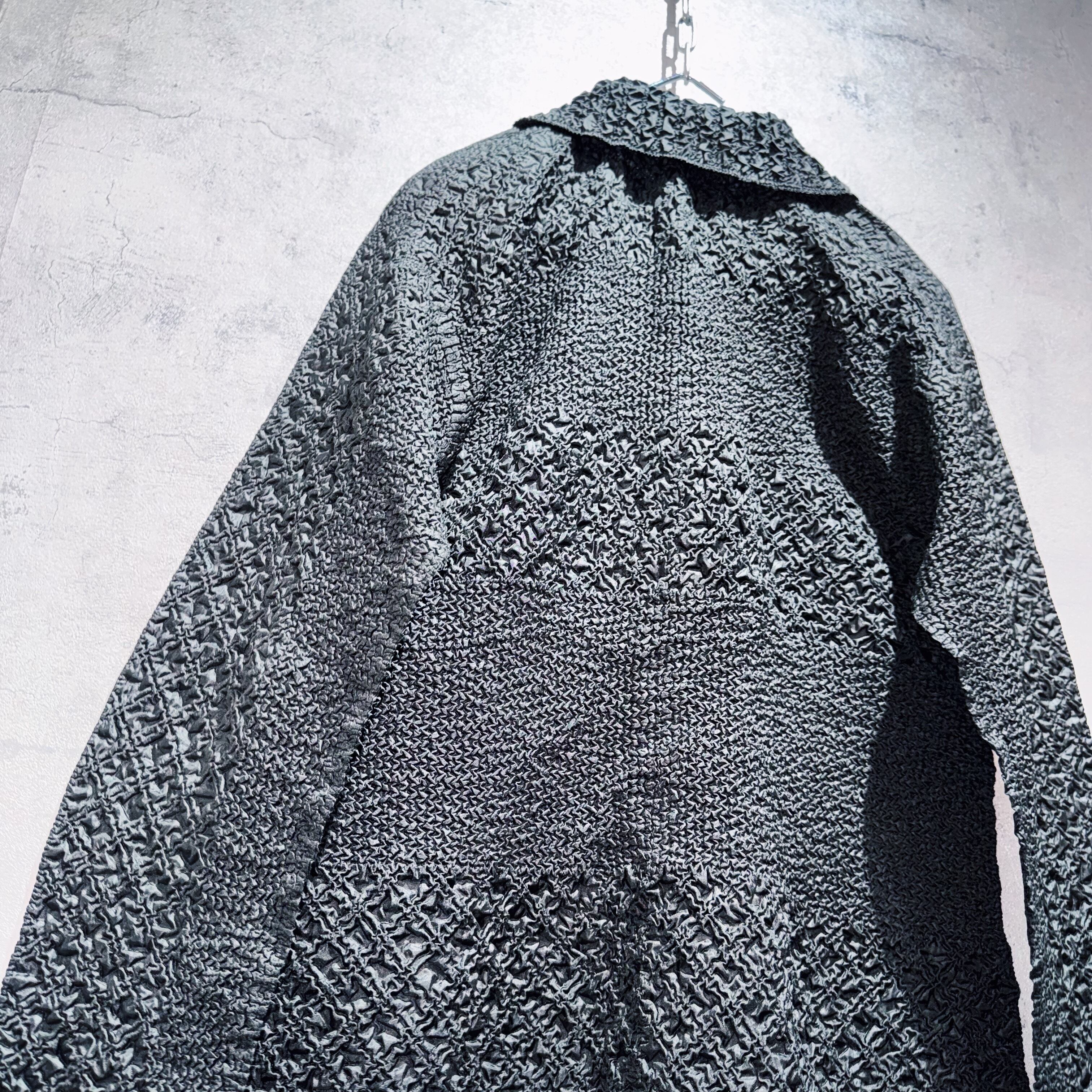 絞り加工によって立体的な凹凸を表現したポップコーン生地はアヴァンギャルドさを演出。そしてシャツには珍しいジップタイプでアウターのような着こなしも◎