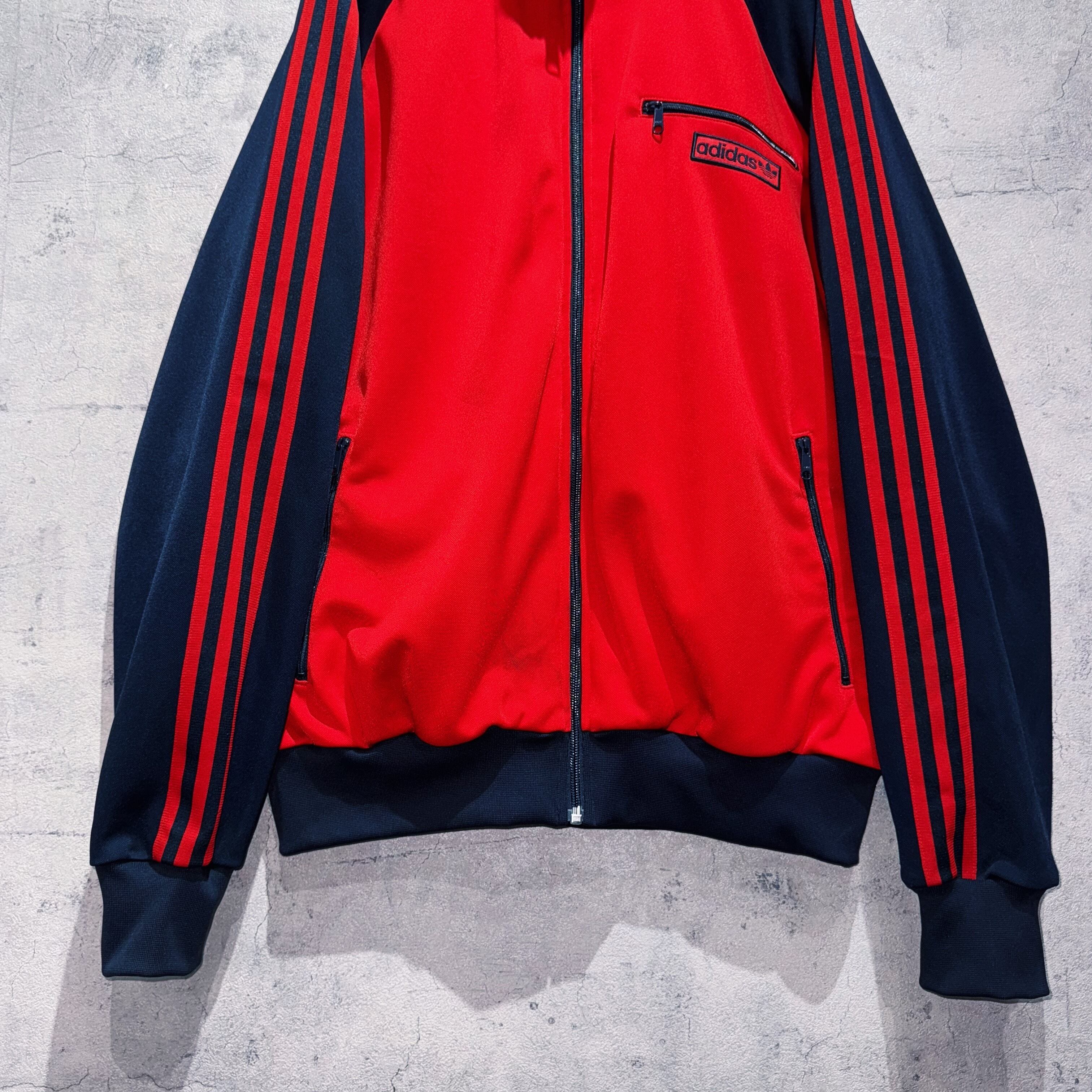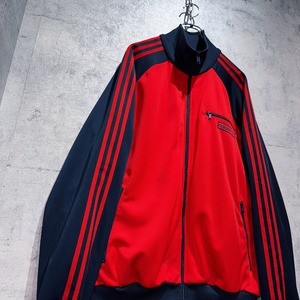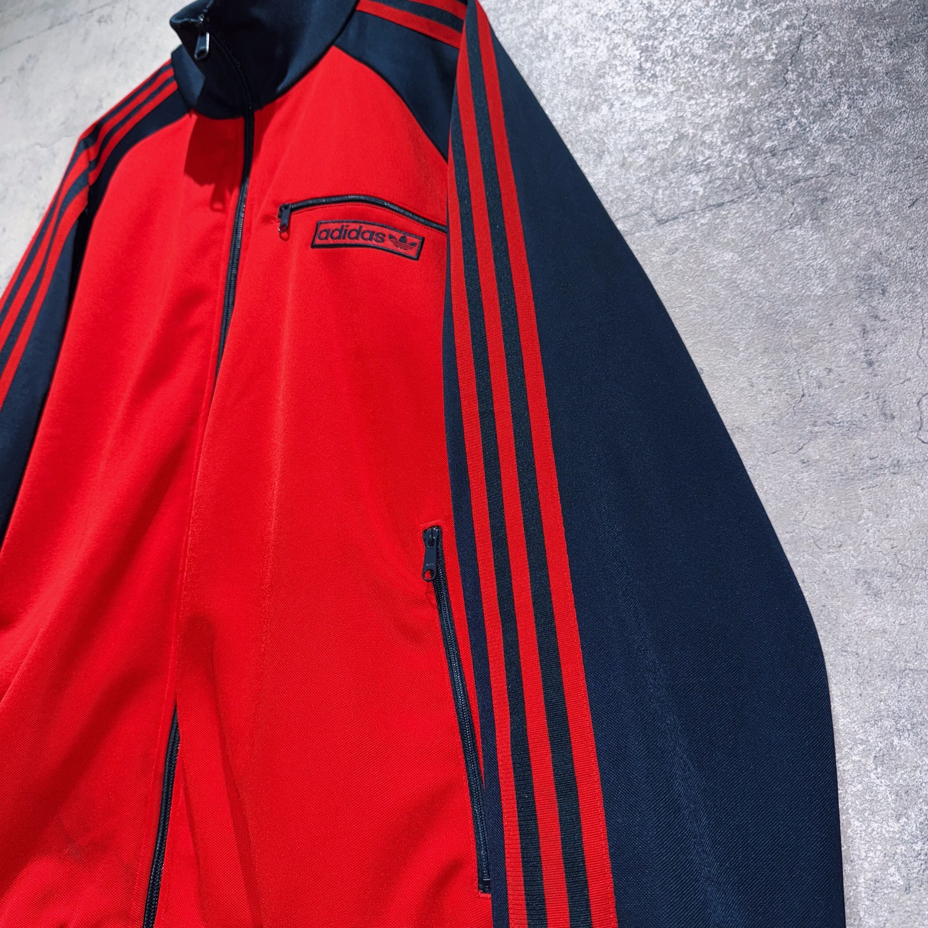力強いレッドカラーとダークネイビーカラーが切り替わった素晴らしいカラーリングのトラックジャケット。