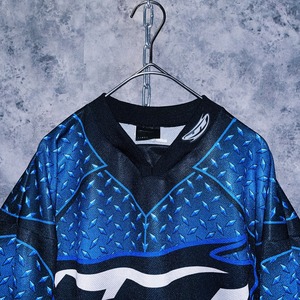 一目で惹きつけられるアイスブルーカラーに光沢感のたまらない生地。両サイドとフロントにはJTのロゴ付き。フロントのシックスパックを彷彿とさせるデザインとバックは背骨のようなデザインは人間の肉体をサイバーにオマージュしたようなハイデザイン。
