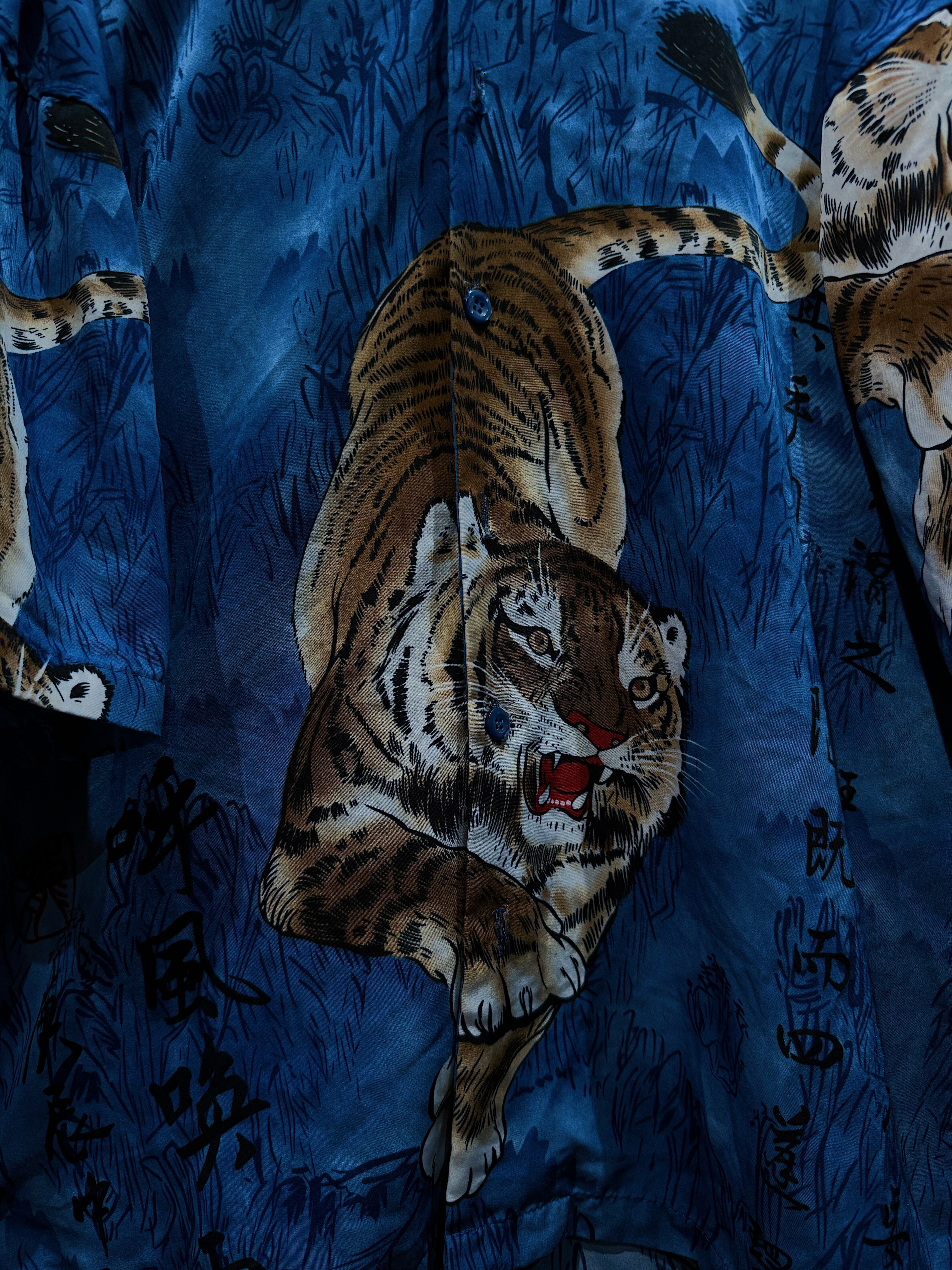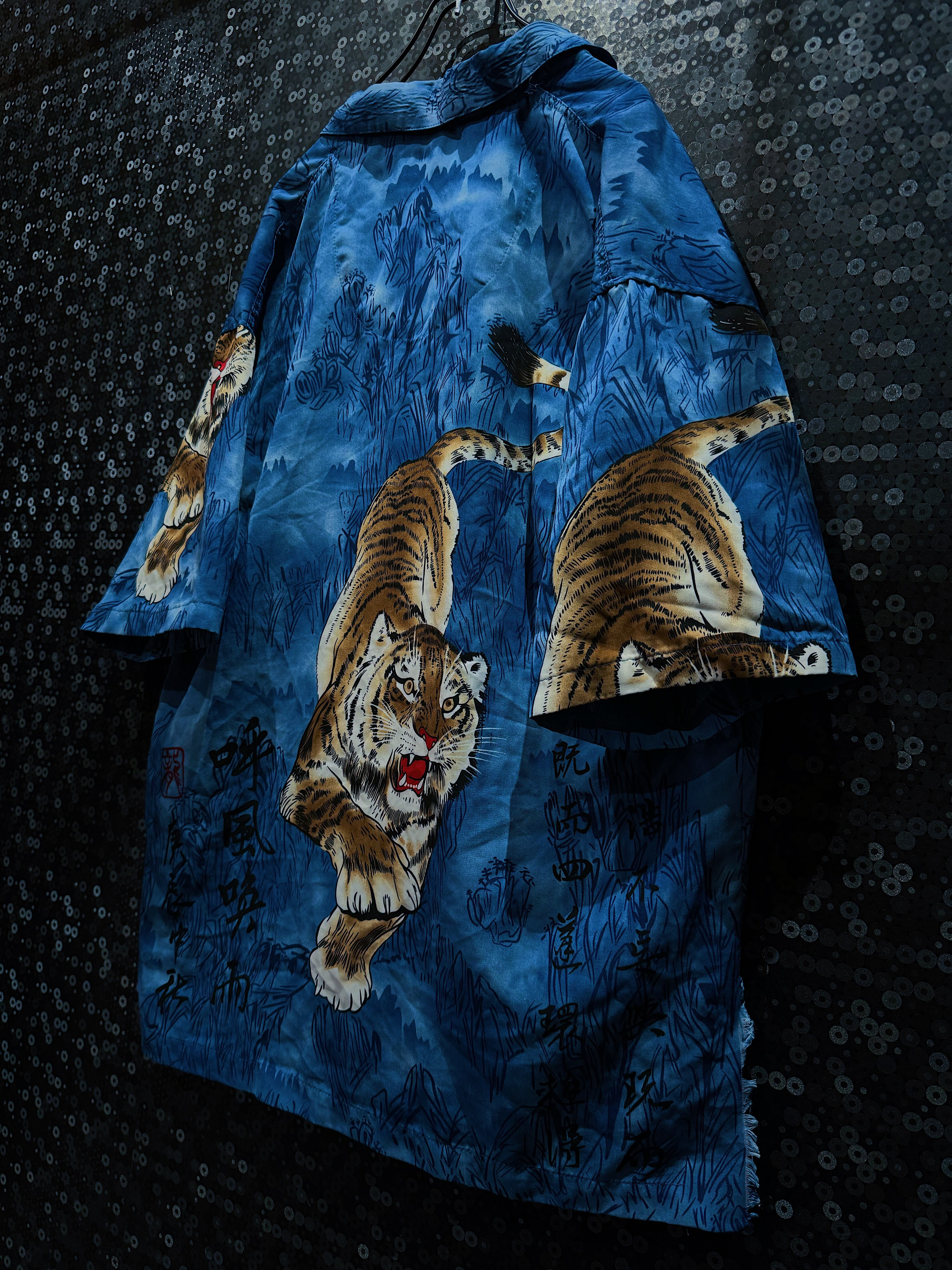 このシャツは、水墨画風の背景に勇ましく吠える虎が大胆に配されたデザインが特徴で、ヴィンテージアロハシャツを彷彿とさせるビジュアルインパクトがあります。漢字風の装飾文字も相まって、アジアンカルチャーをミックスした独自のストリート感を放っています。