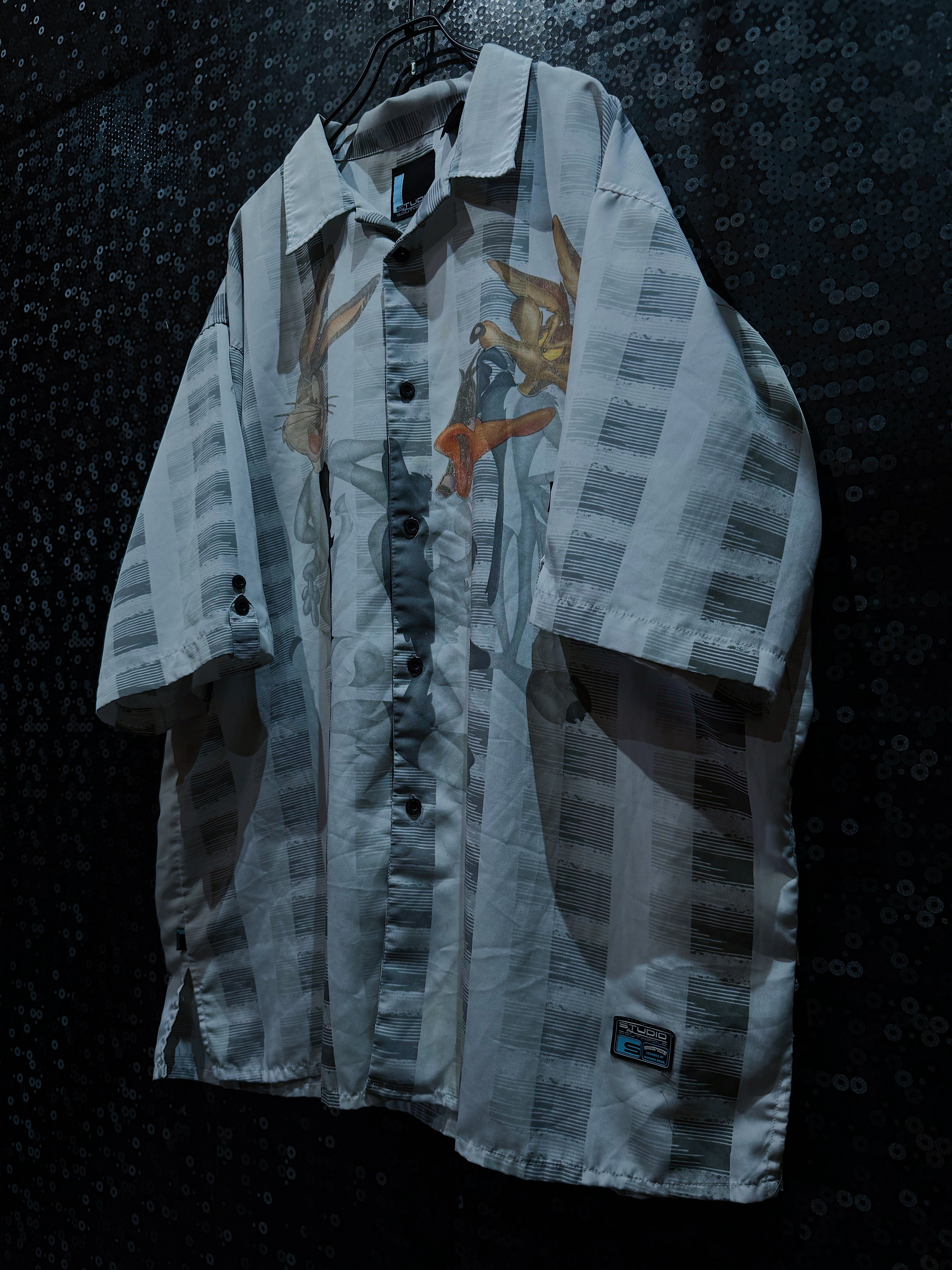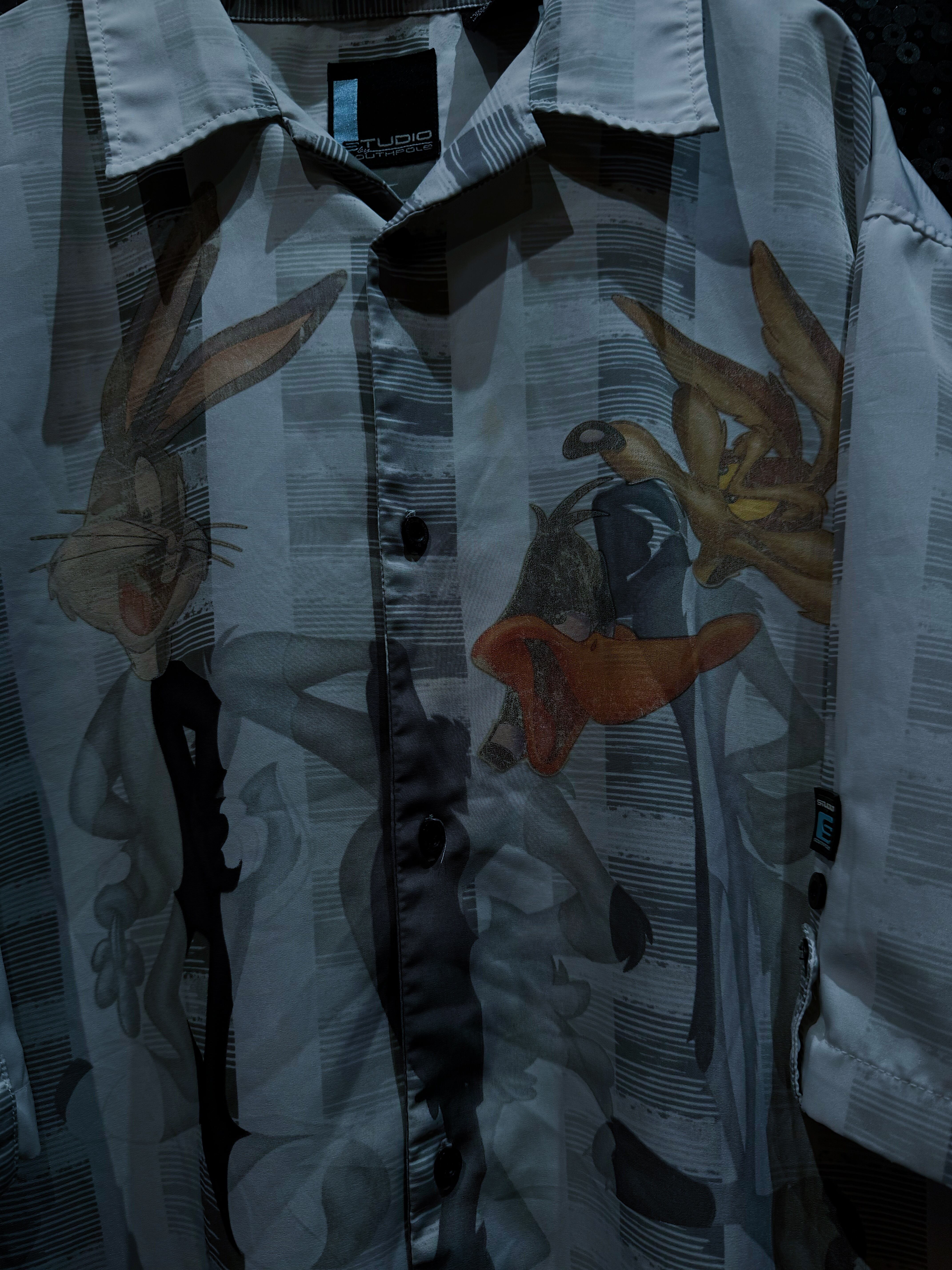 90年代〜2000年代初頭にかけてリリースされた、ルーニー・テューンズの総柄オフィシャル半袖シャツ。全面に広がるのは、ワーナー・ブラザースの名作アニメ『ルーニー・テューンズ』に登場する人気キャラクターたち。シャツには、荒々しく破天荒な行動でお馴染みの**タズマニアン・デビル(通称タズ)**がメインで描かれ、全体を支配する青を基調としたトーンと相まって、クールかつワイルドな存在感を放ちます。