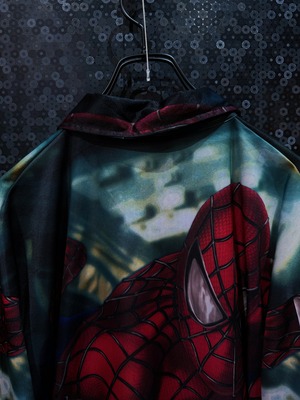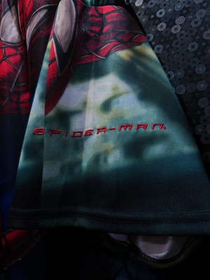 真っ赤なスーツと網目模様が象徴的なスパイダーマンのデザインが、フロント一面に大胆に配置されています。左袖には小さく「SPIDER-MAN」の文字も刺繍されており、公式ライセンス感のあるディテールもポイントです。