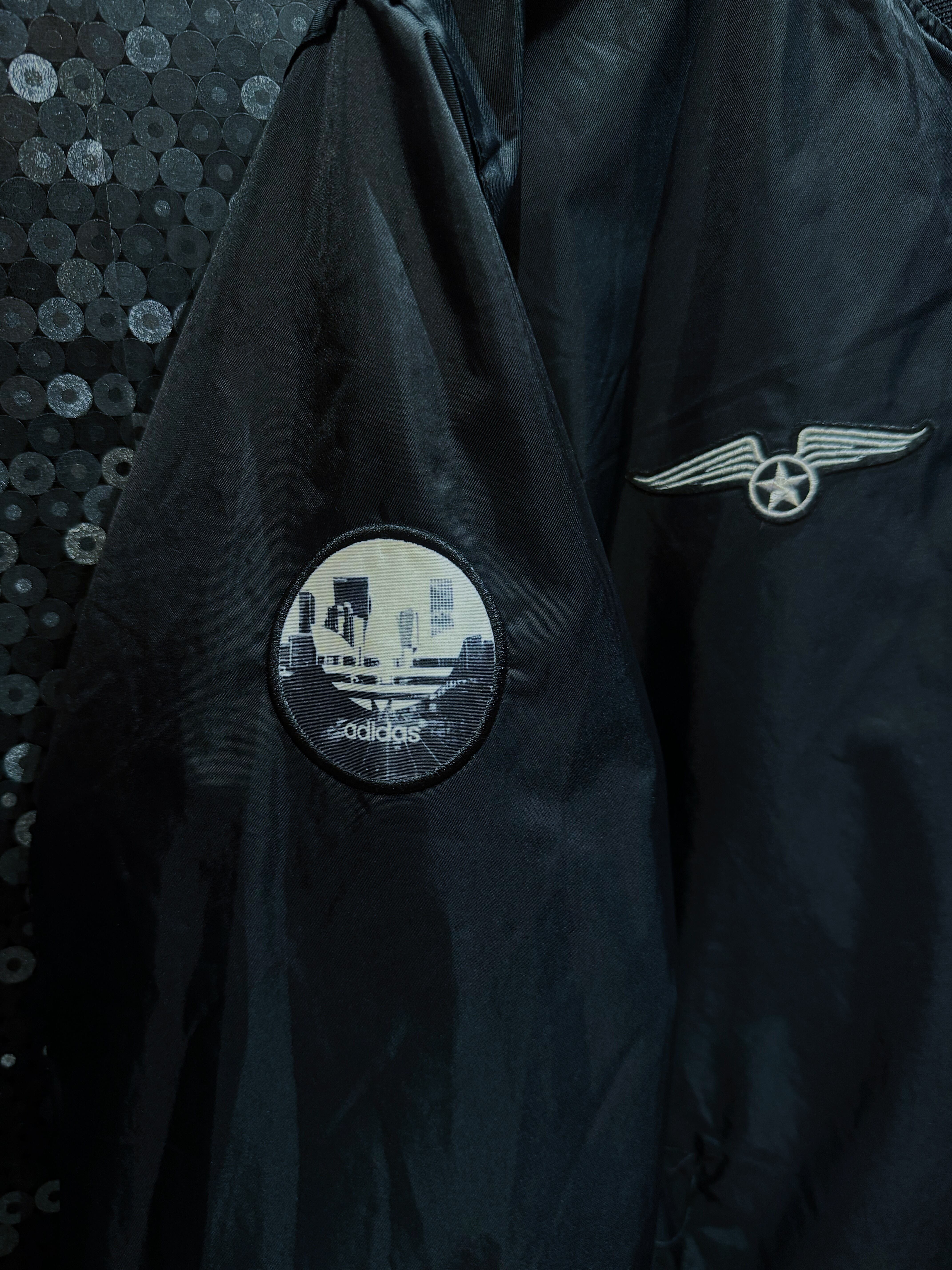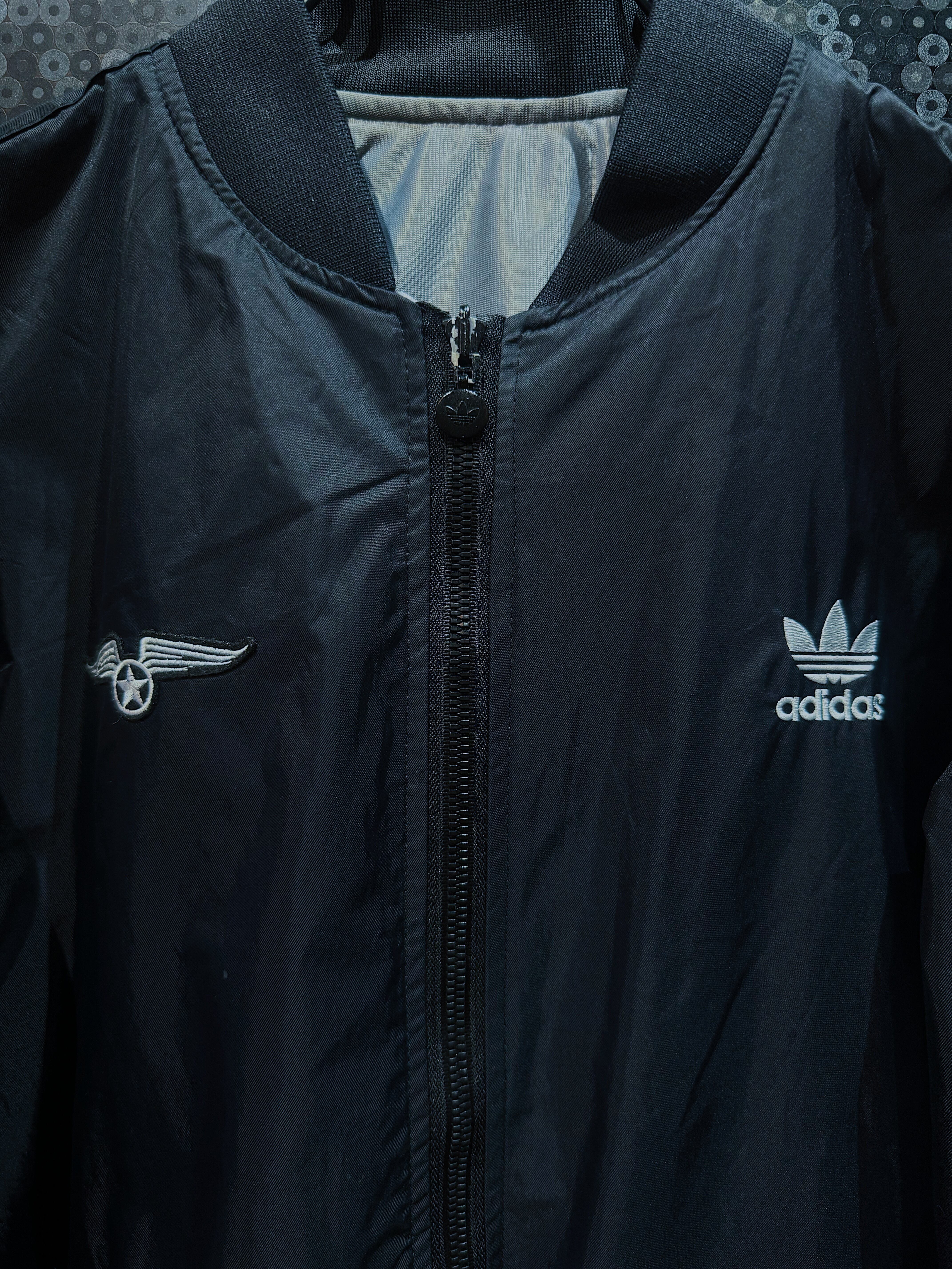 adidasによるリバーシブル仕様のブルゾンジャケット。表面はナイロン生地を使用したブラックベースに、胸元のトレフォイルロゴと両腕のワッペン装飾がミリタリー的要素を感じさせる仕上がり。