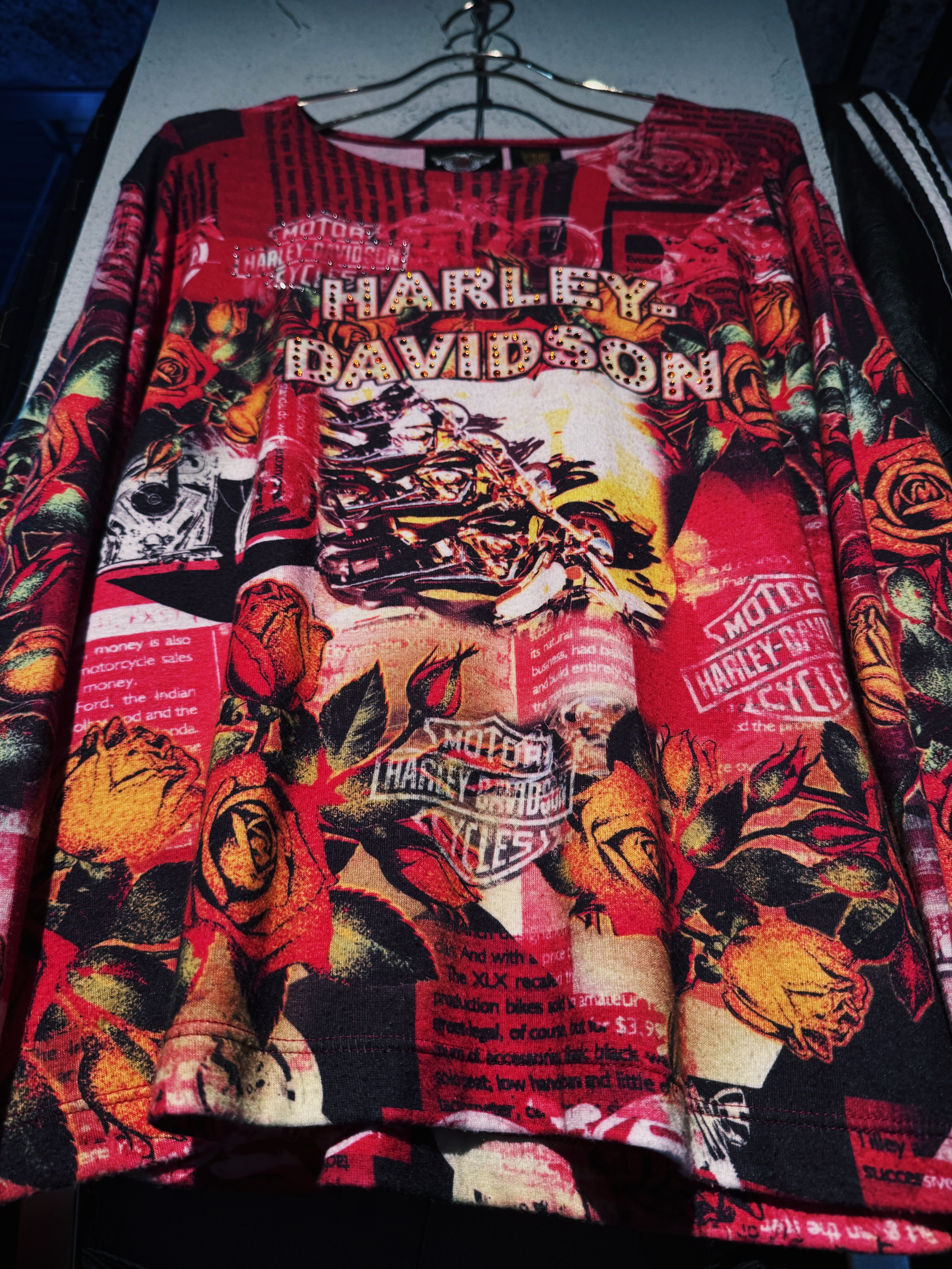 "ハーレーダビッドソン"グリッターロゴフルローズパターンデザインロングスリーブTシャツ