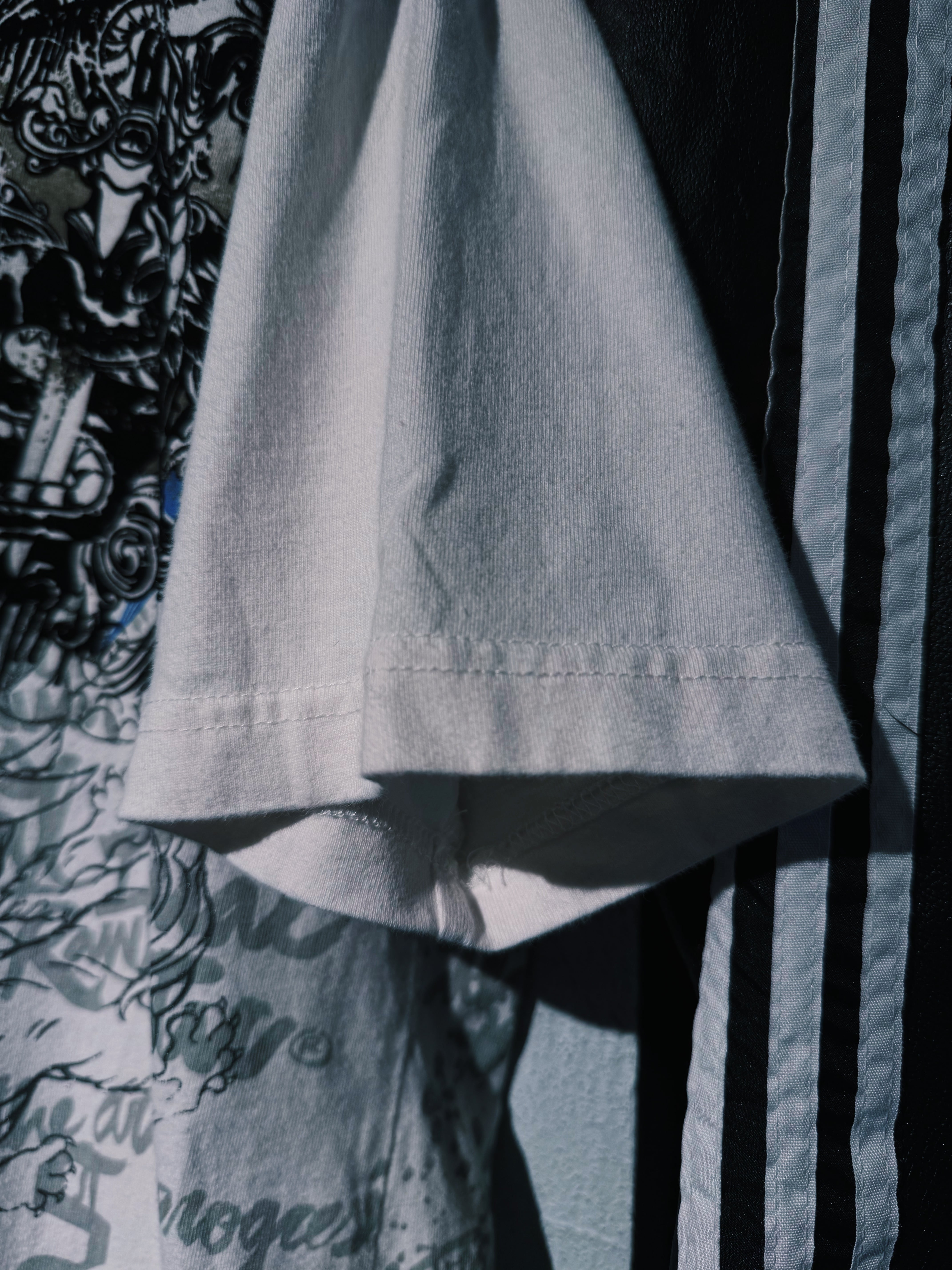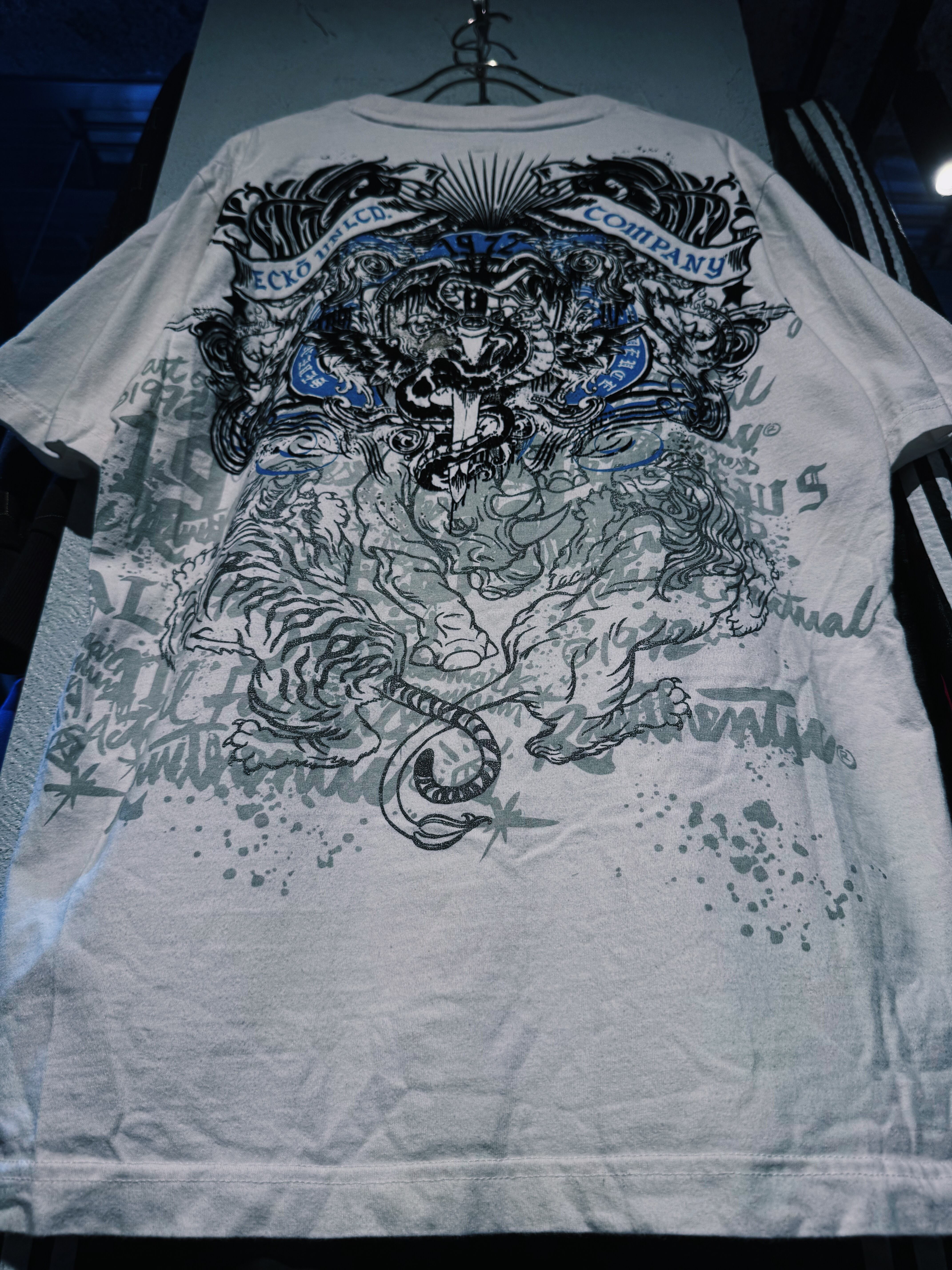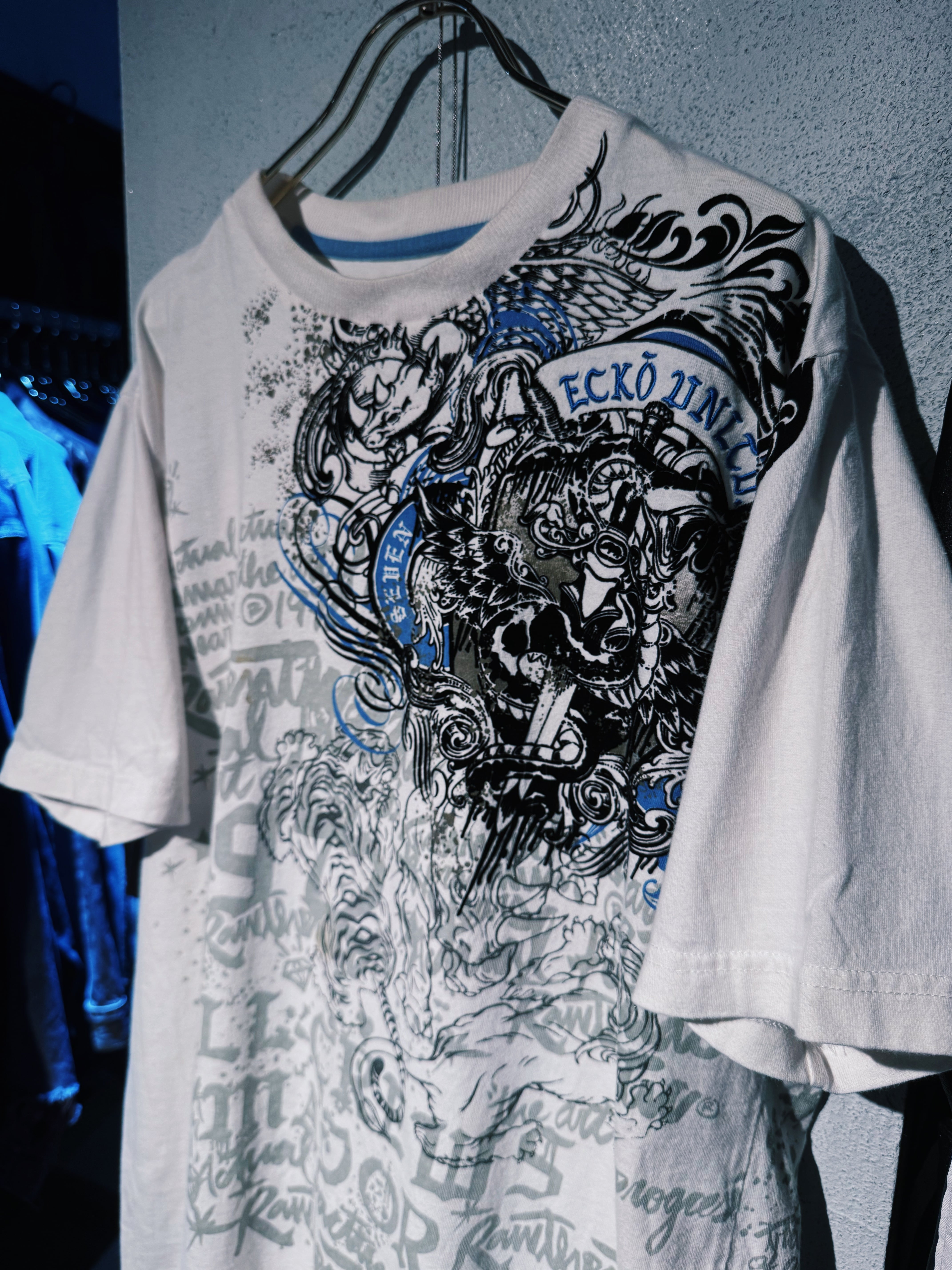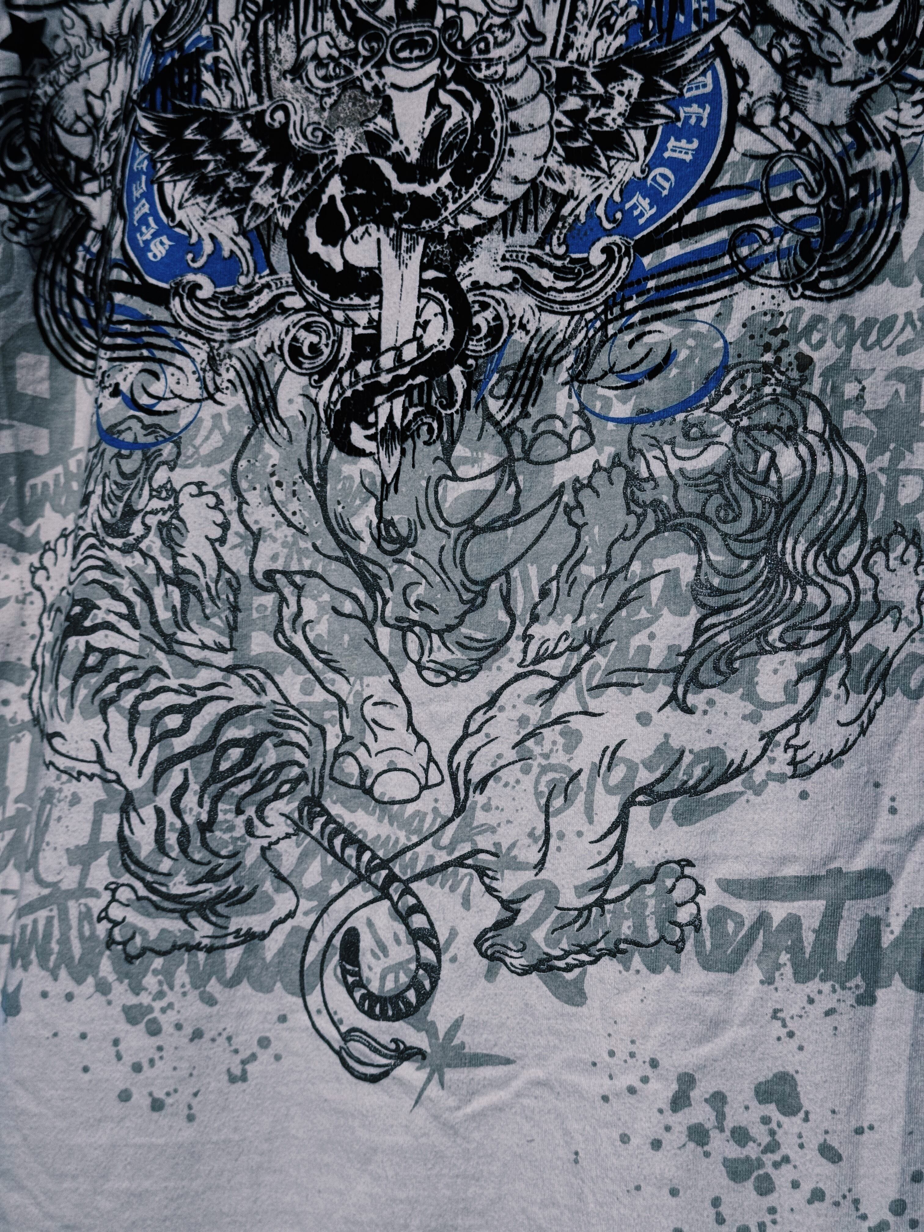 剣のデザインを左胸に載せ、サイ、虎、ライオンと和洋折衷な動物デザインに文字を乱雑に乗せたデザインが美しい…