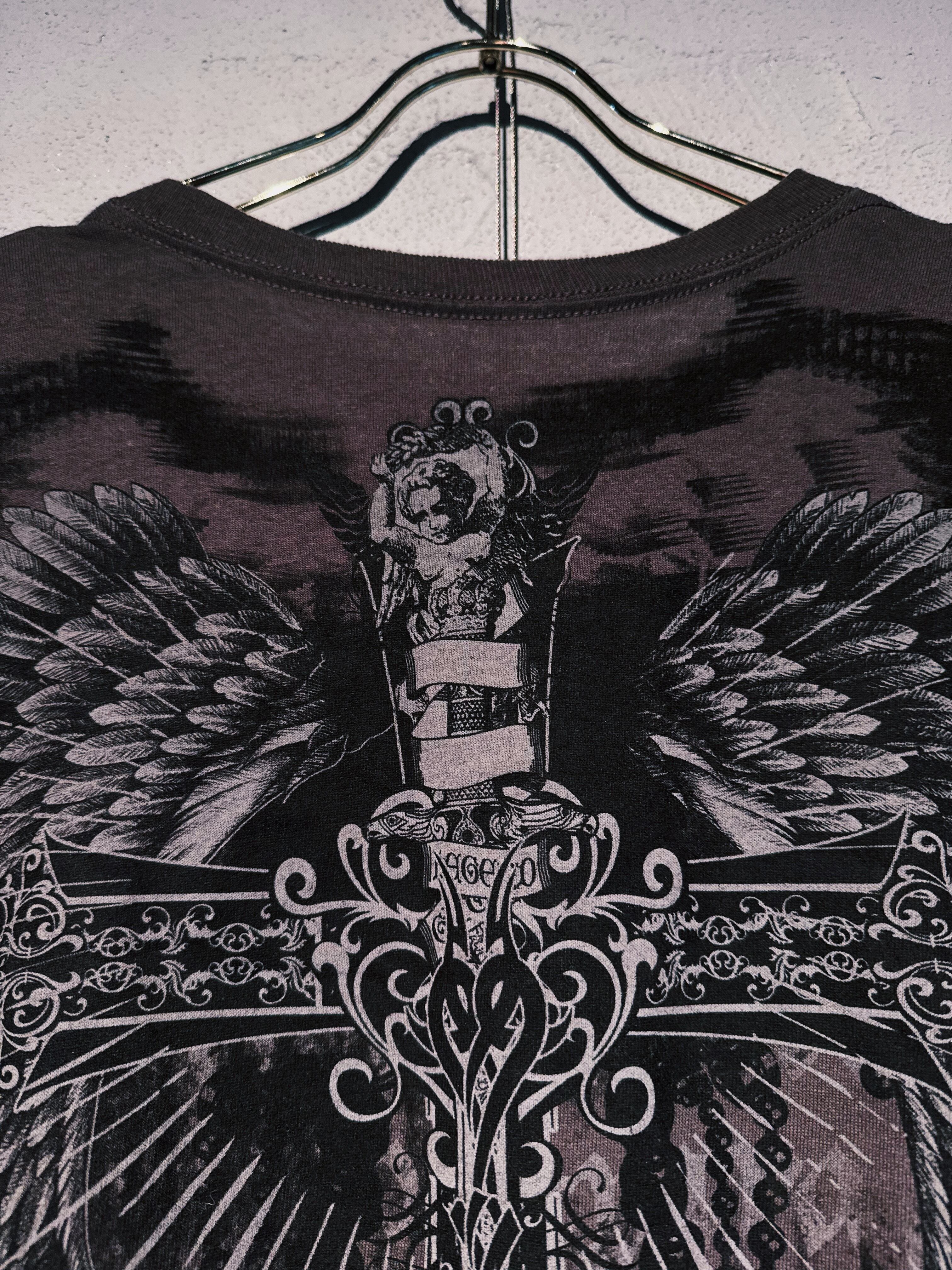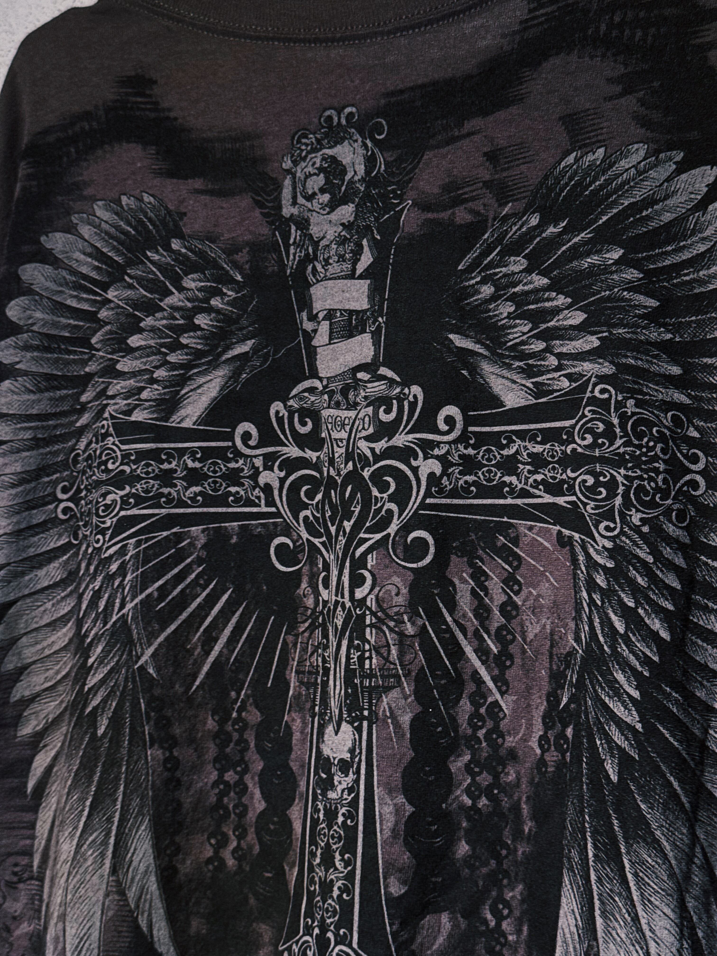 ヴィンテージグレーカラースカル&クロスゴージャスエンブレムデザインオーバーサイズS/S Tシャツ