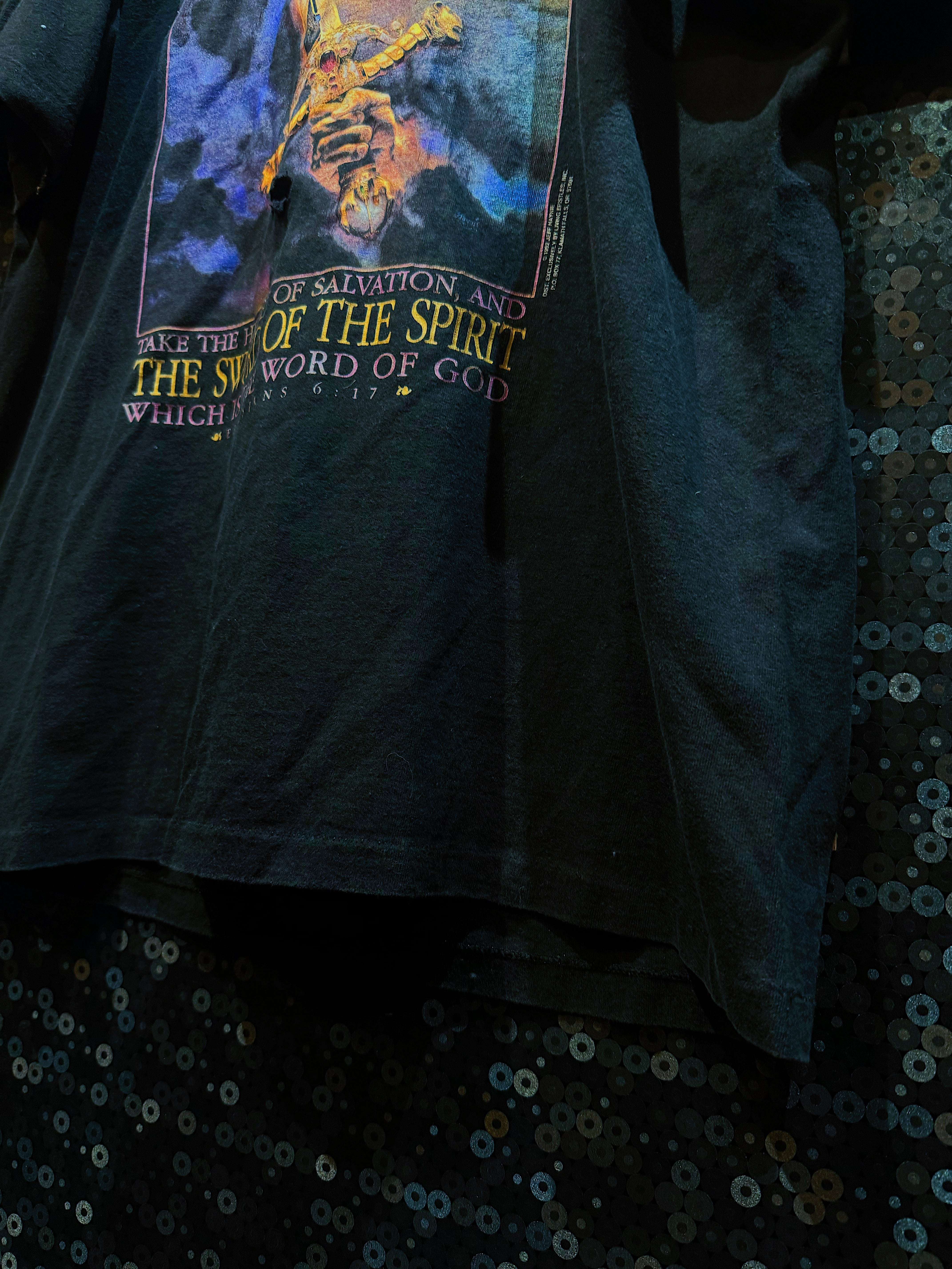 キリスト教の聖書に由来するメッセージが大胆に表現された「Sword of the Spirit」グラフィックTシャツです。