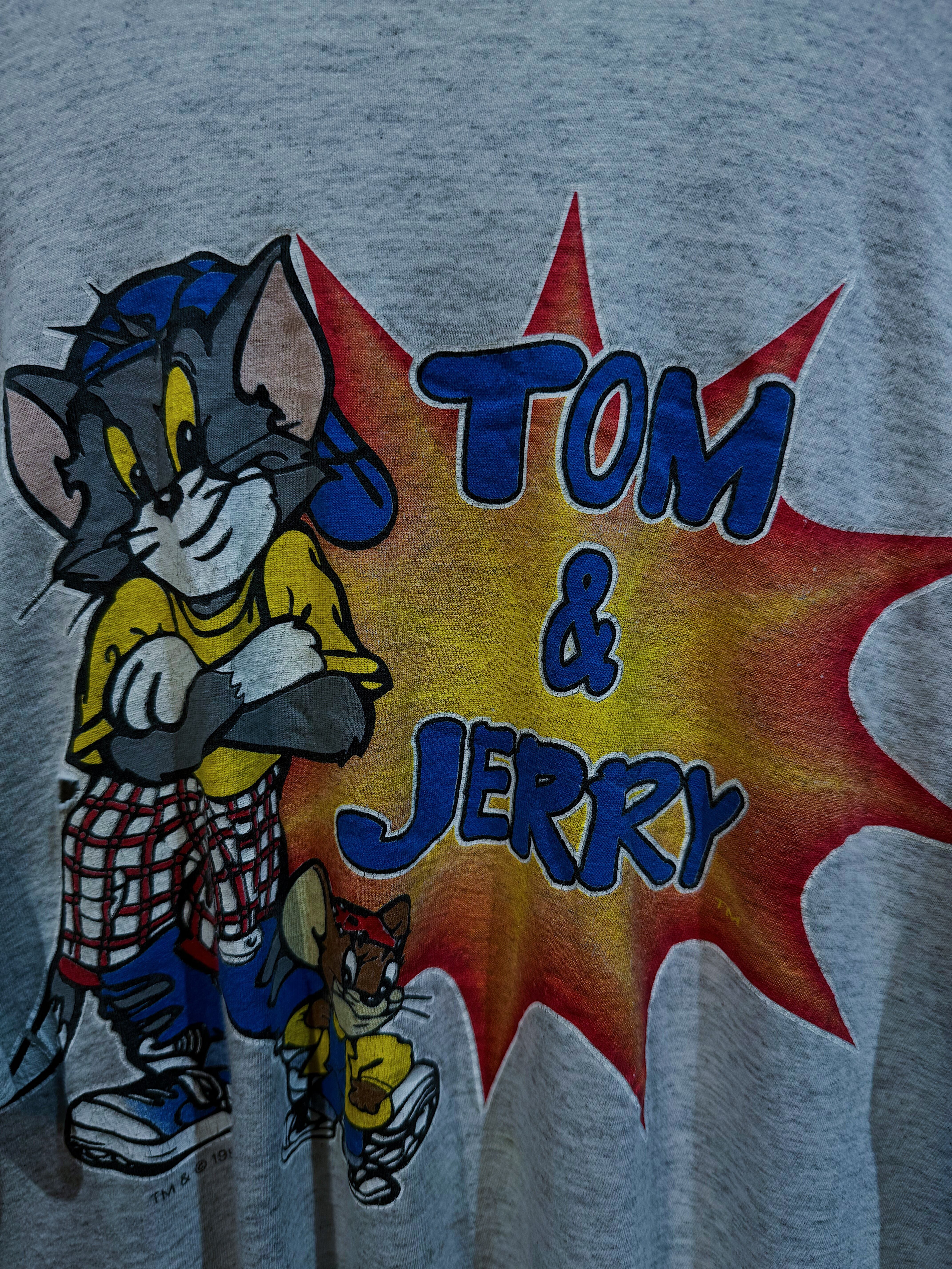 トムとジェリーがB-BOYスタイルで描かれており、90年代のヒップホップカルチャーやY2Kファッションの流れを汲む、キャラクターグラフィックTシャツの中でも異彩を放つ存在。