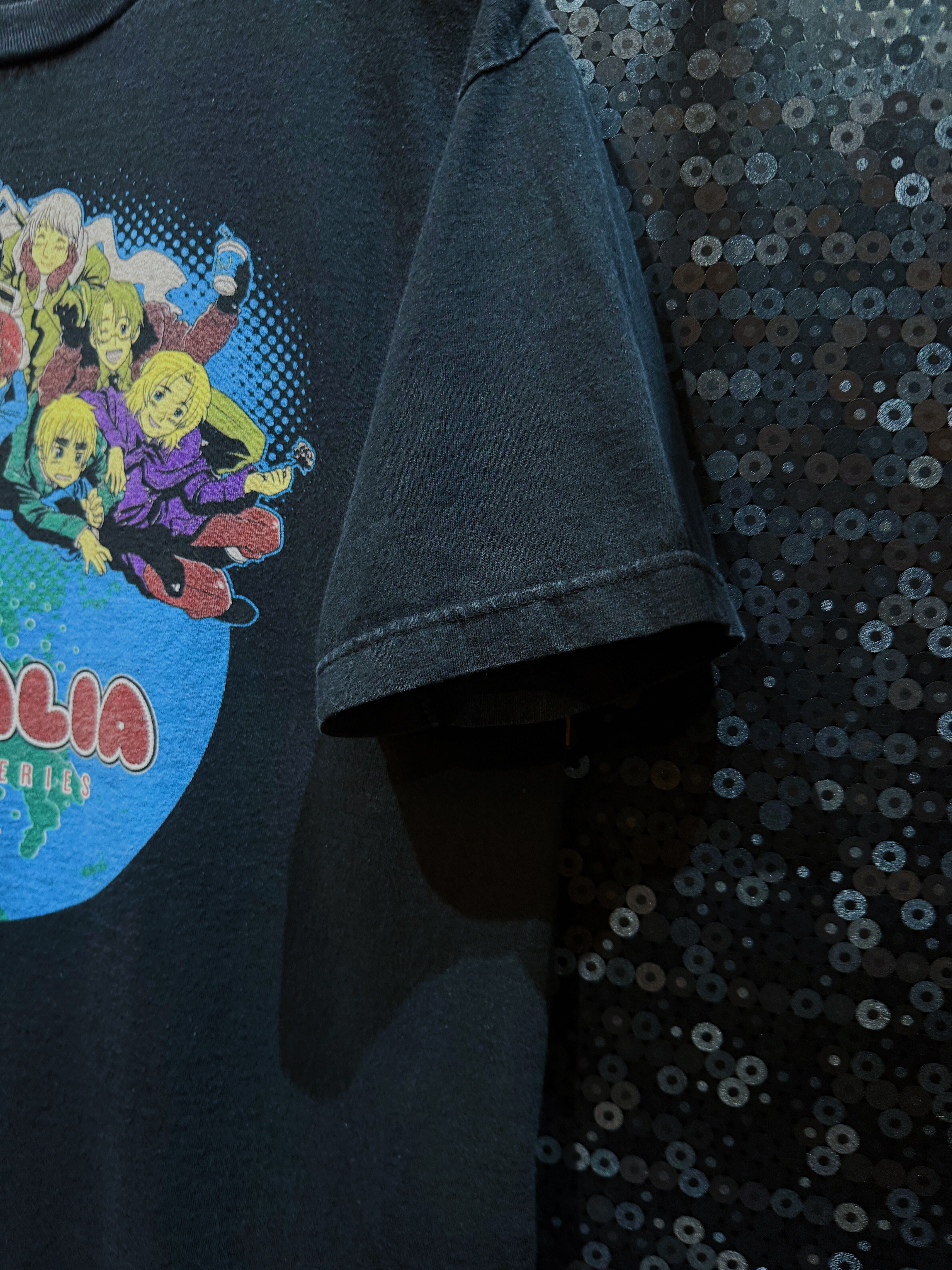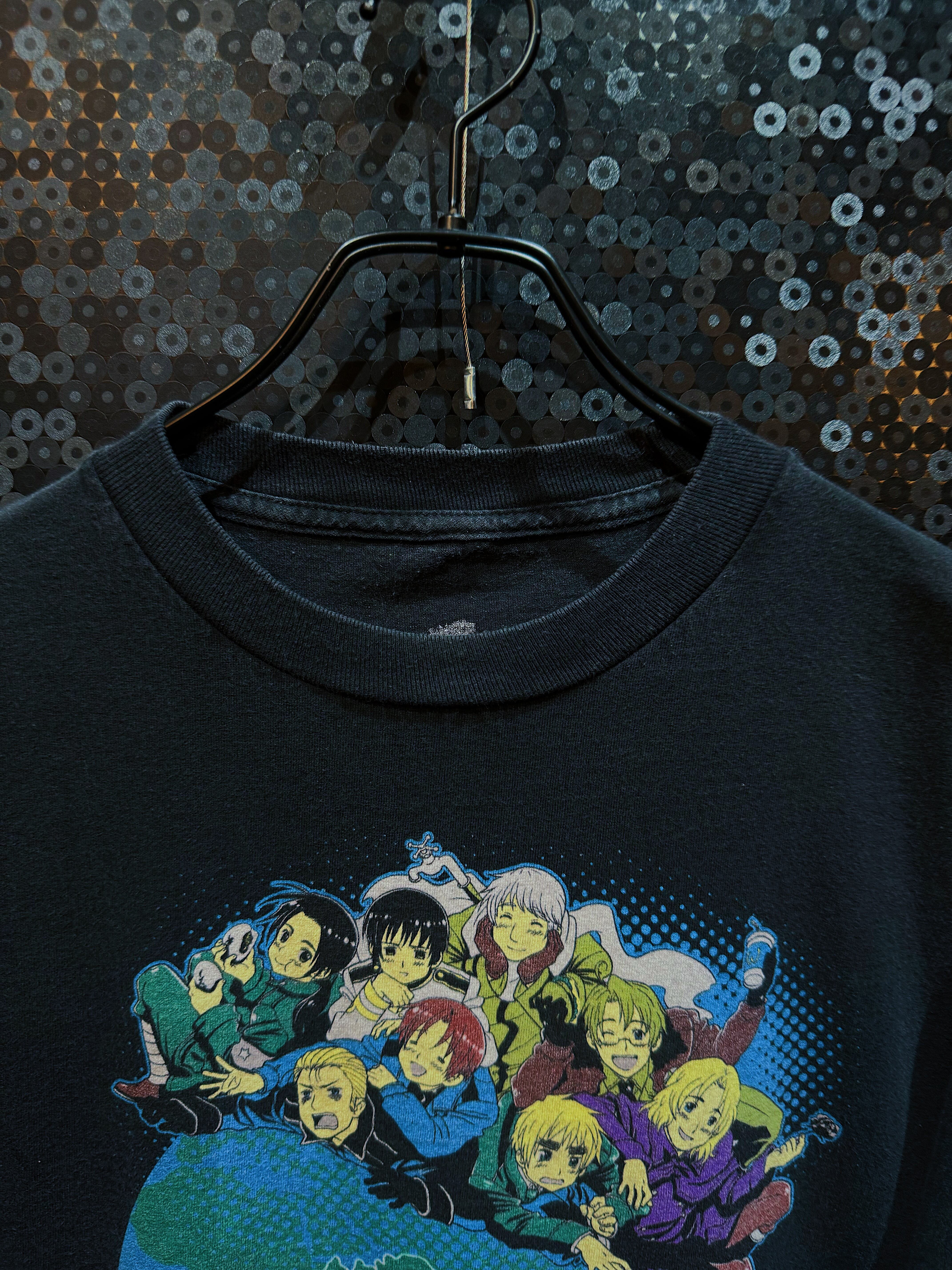 『ヘタリア』は各国の歴史や文化をユーモラスかつパロディ的に描いた作品で、特に2009〜2011年の「World Series」編は海外ファンからの支持も高く、当時北米版も流通。今回のTシャツはおそらくその海外展開時に作られたもので、コットンボディのしっかりした造りに加え、ヴィンテージらしい色落ちが魅力です。