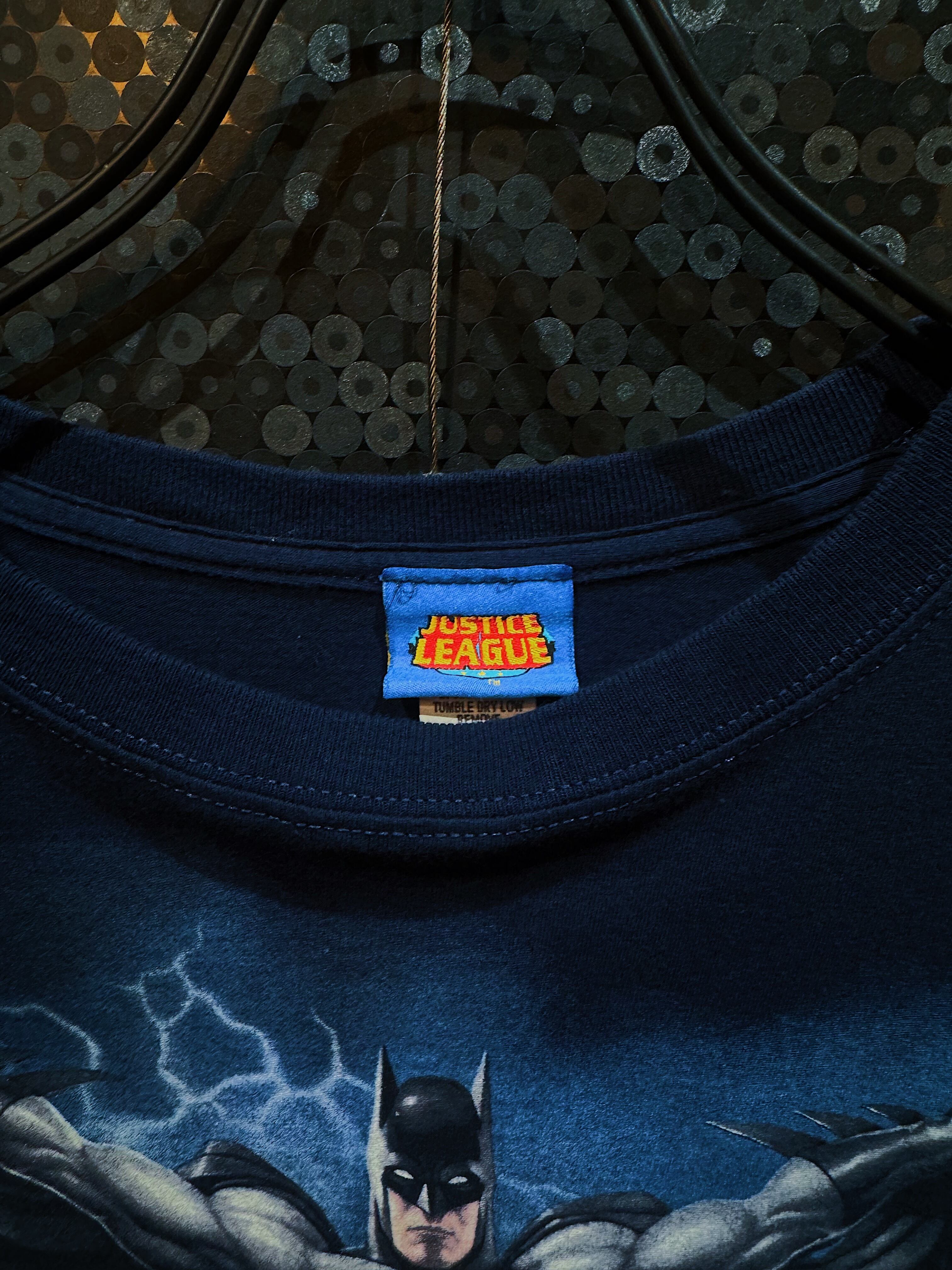 漆黒の空を背景に、雷光が裂ける中で飛び出すDCの精鋭たち——このヴィンテージTシャツは、まさに”ジャスティスリーグ”の威風堂々たる姿を捉えた一着。