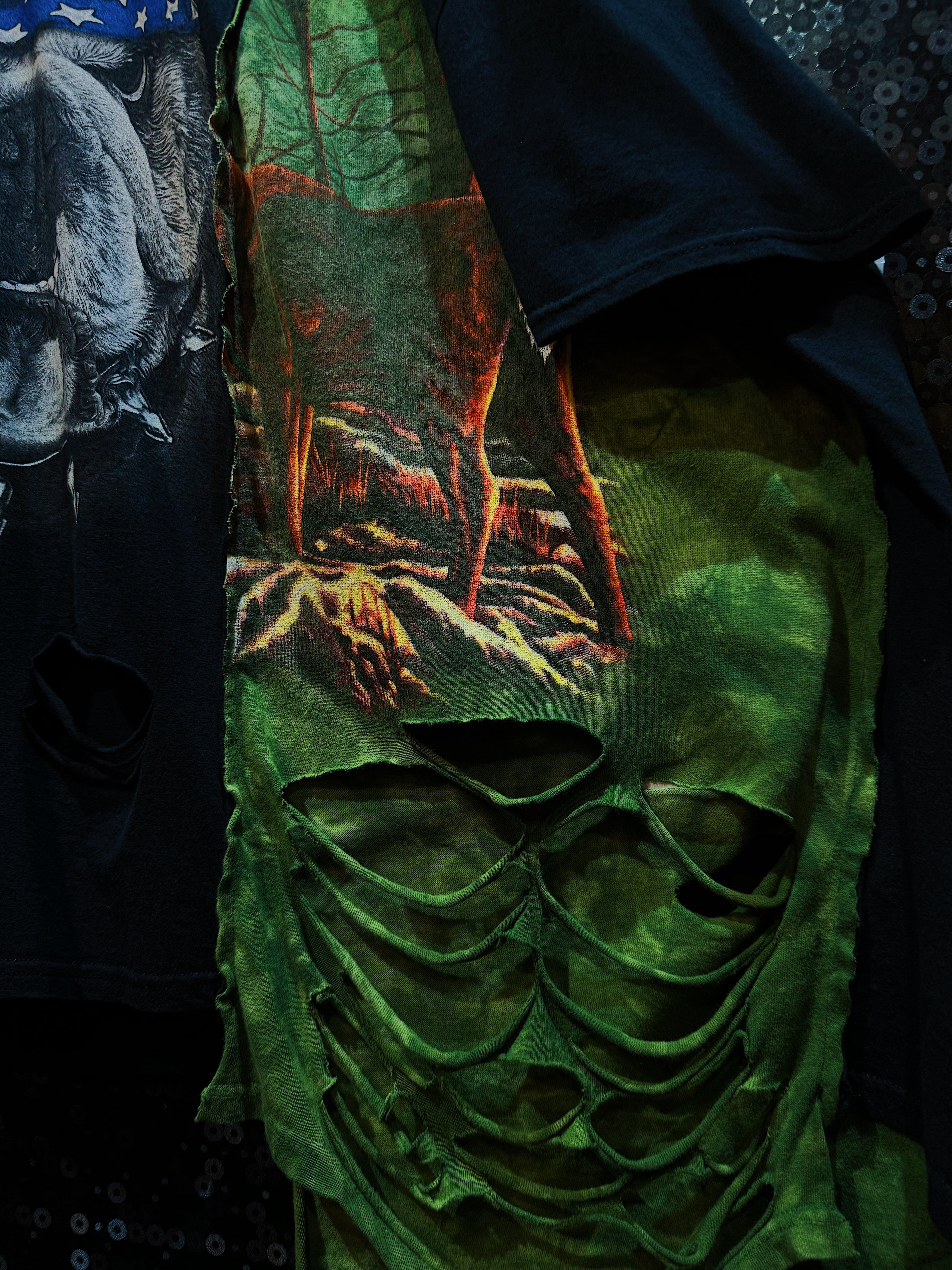 今回の再構築では、そのTHE MOUNTAINのTシャツを複数枚使用し、ブルドッグ×星条旗のインパクトあるセンターグラフィックを主軸に、サイドには森やオオカミなど自然モチーフの柄を大胆にドッキング。