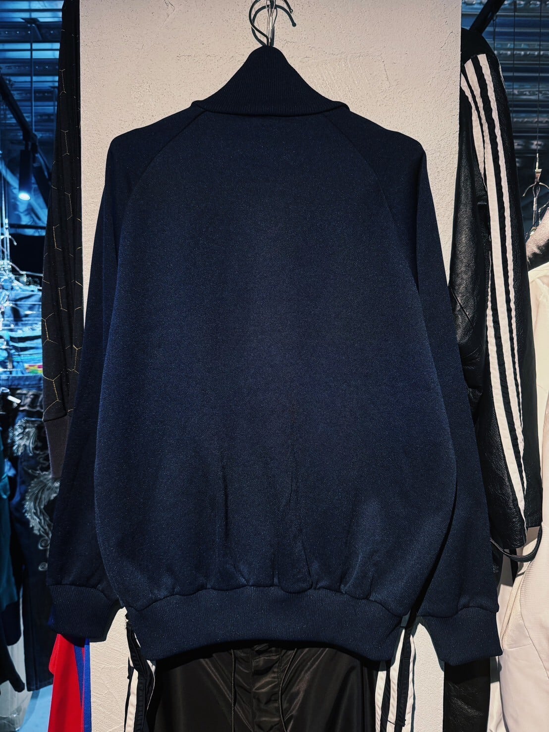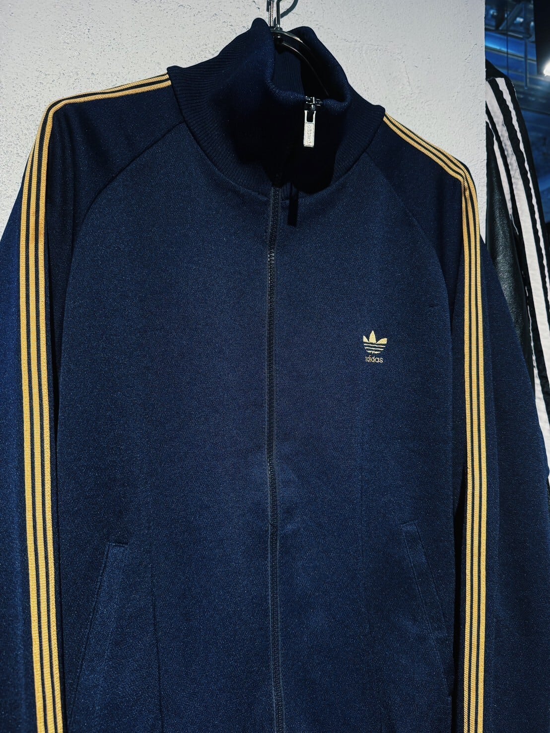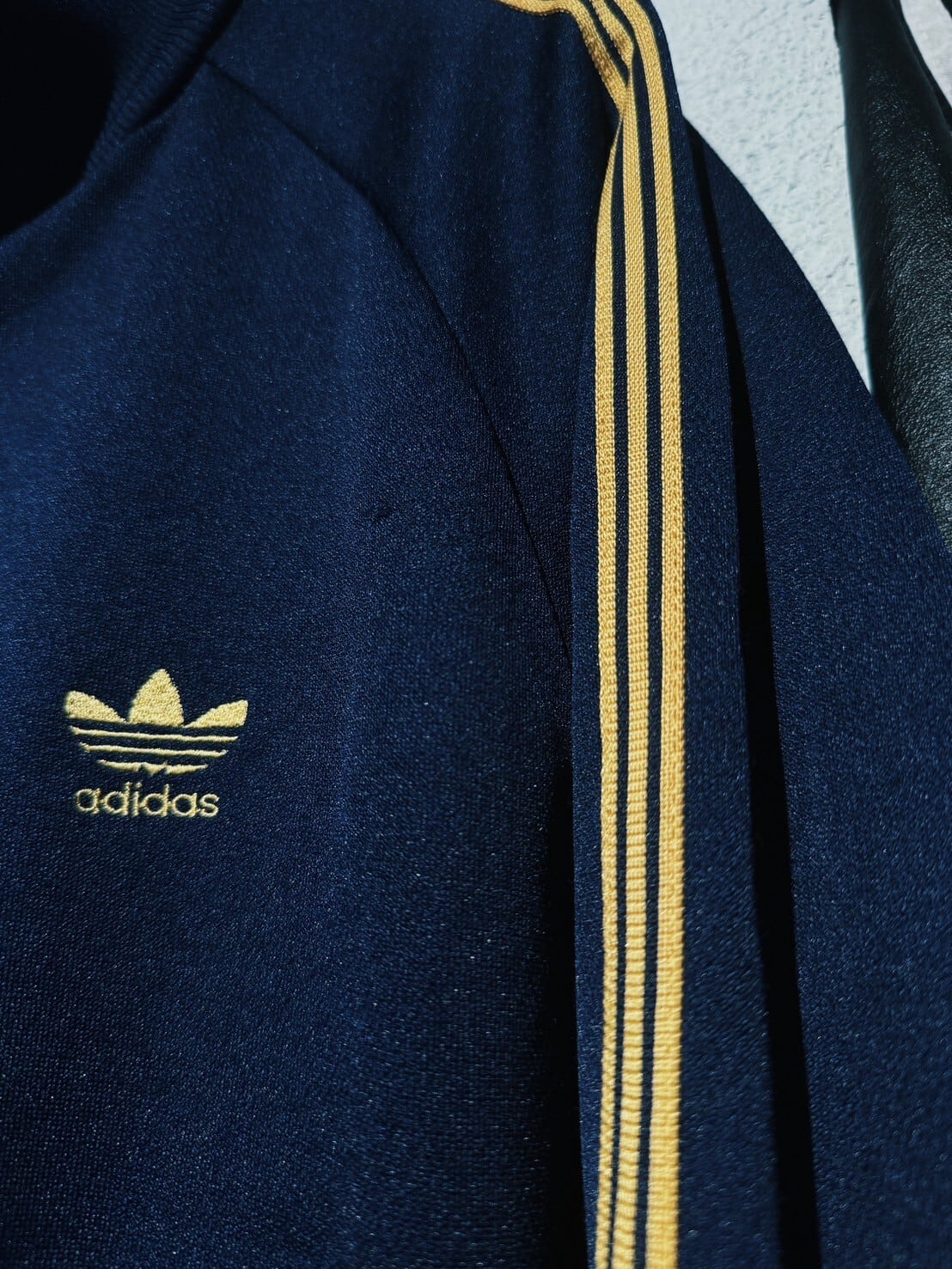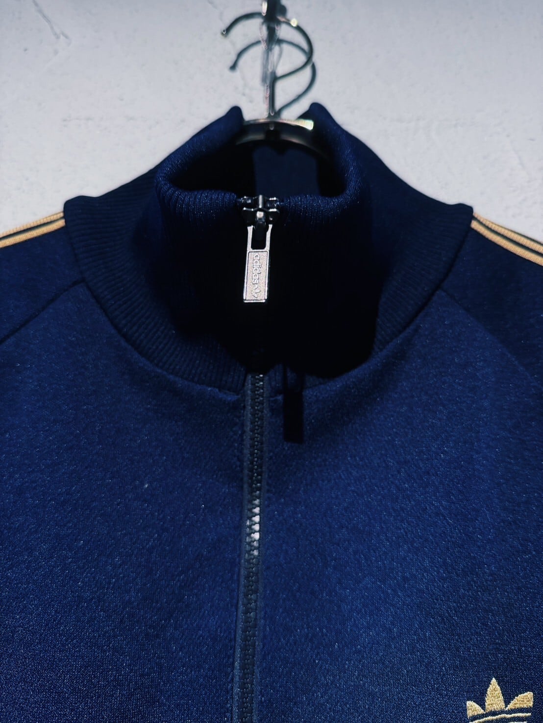 本モデルは、深みのあるネイビーボディに、アイコニックなスリーストライプが映えるクラシックなデザイン。襟元はスタンドネック仕様で、スポーティかつ洗練された印象を与えてくれます。胸元にはトレフォイルロゴが刺繍されており、時代背景を物語るディテールも健在。