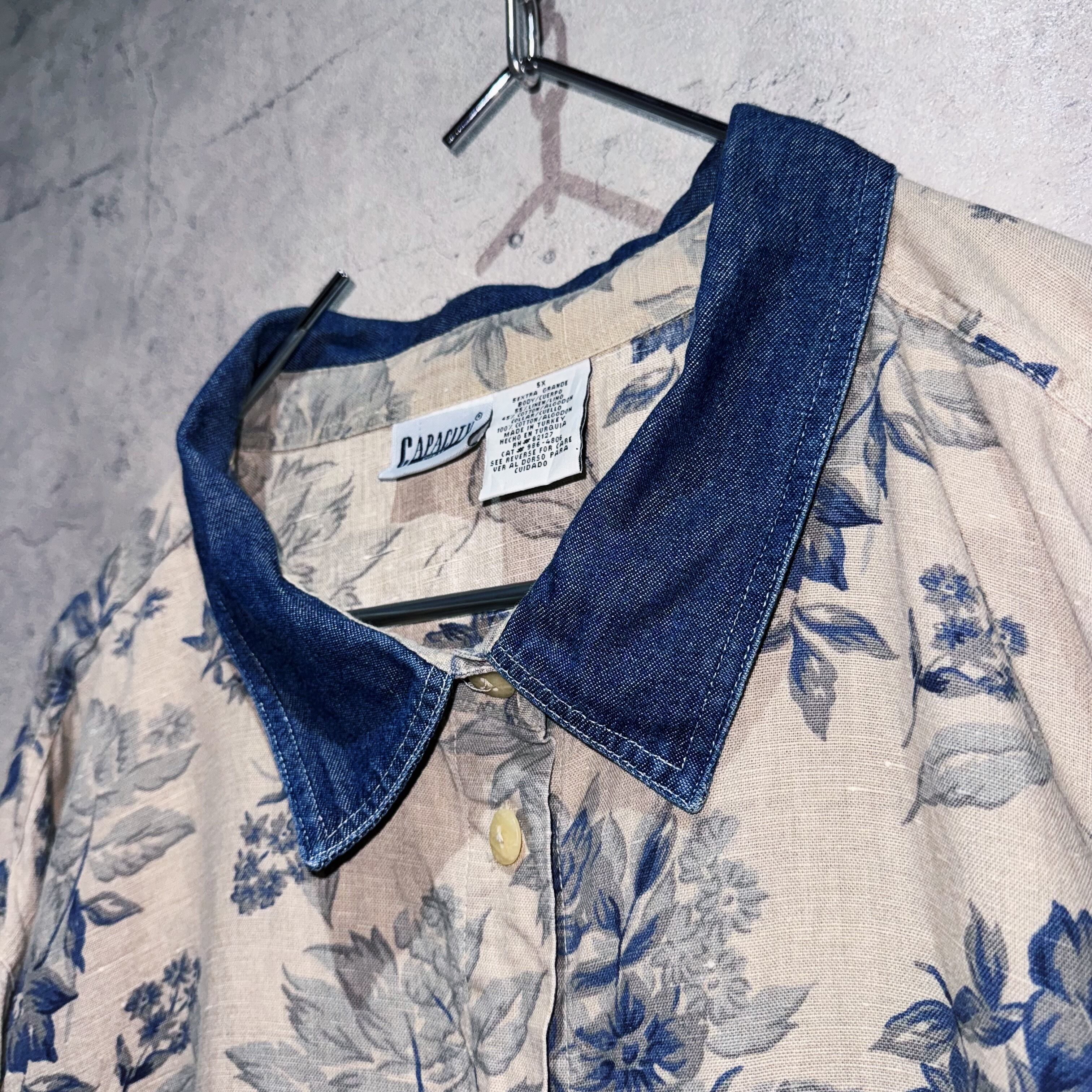 ボディ全体に咲き誇る花々が高級感を醸し出すデザインシャツ。首元がデニムに切り替わっておりアクセントになっています。