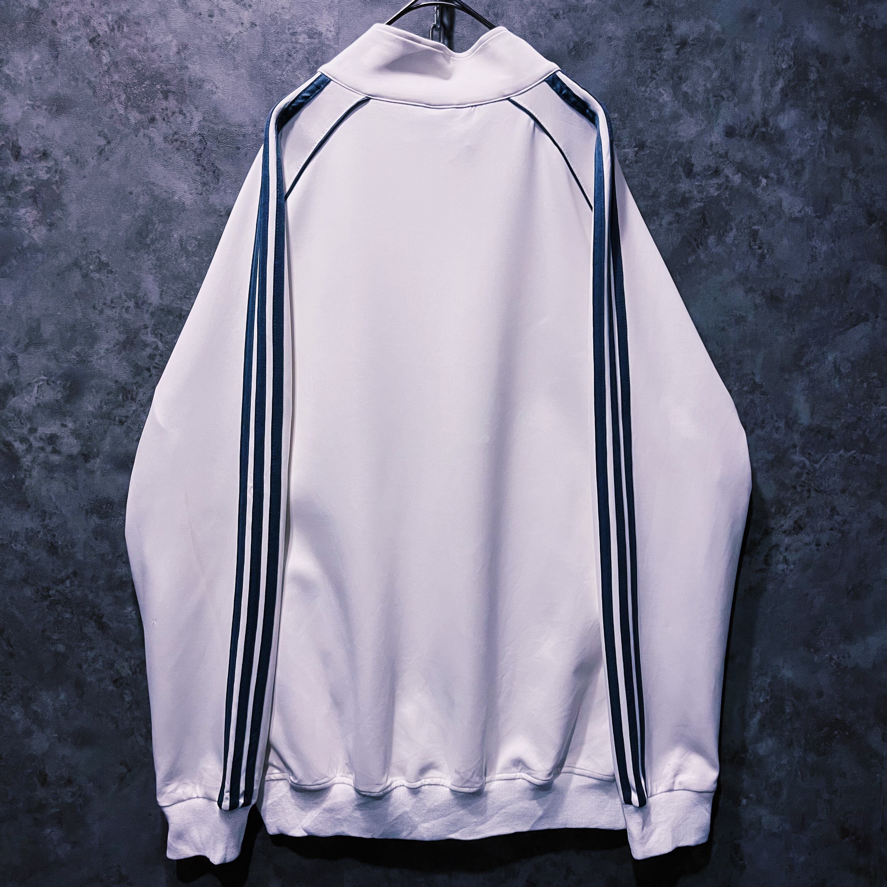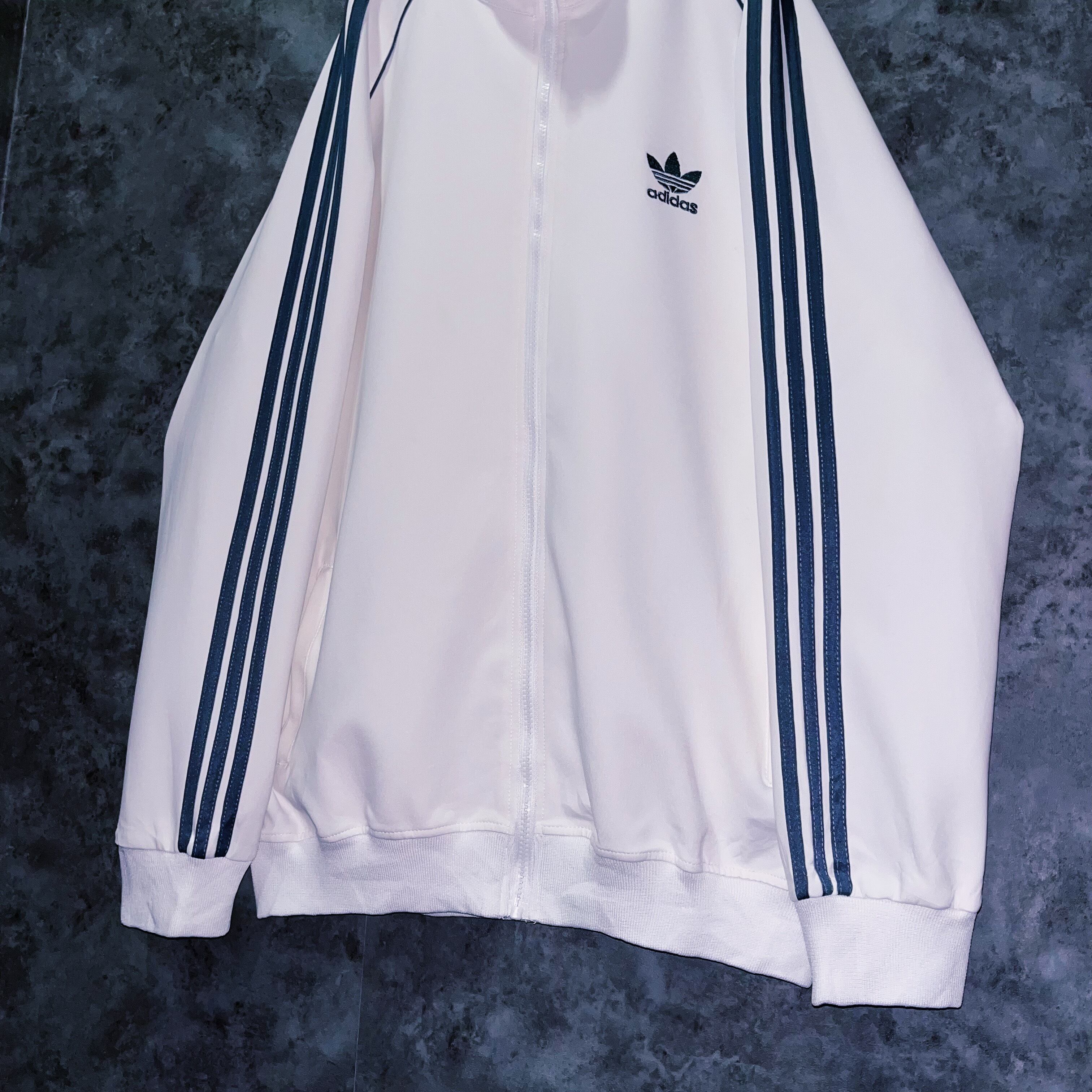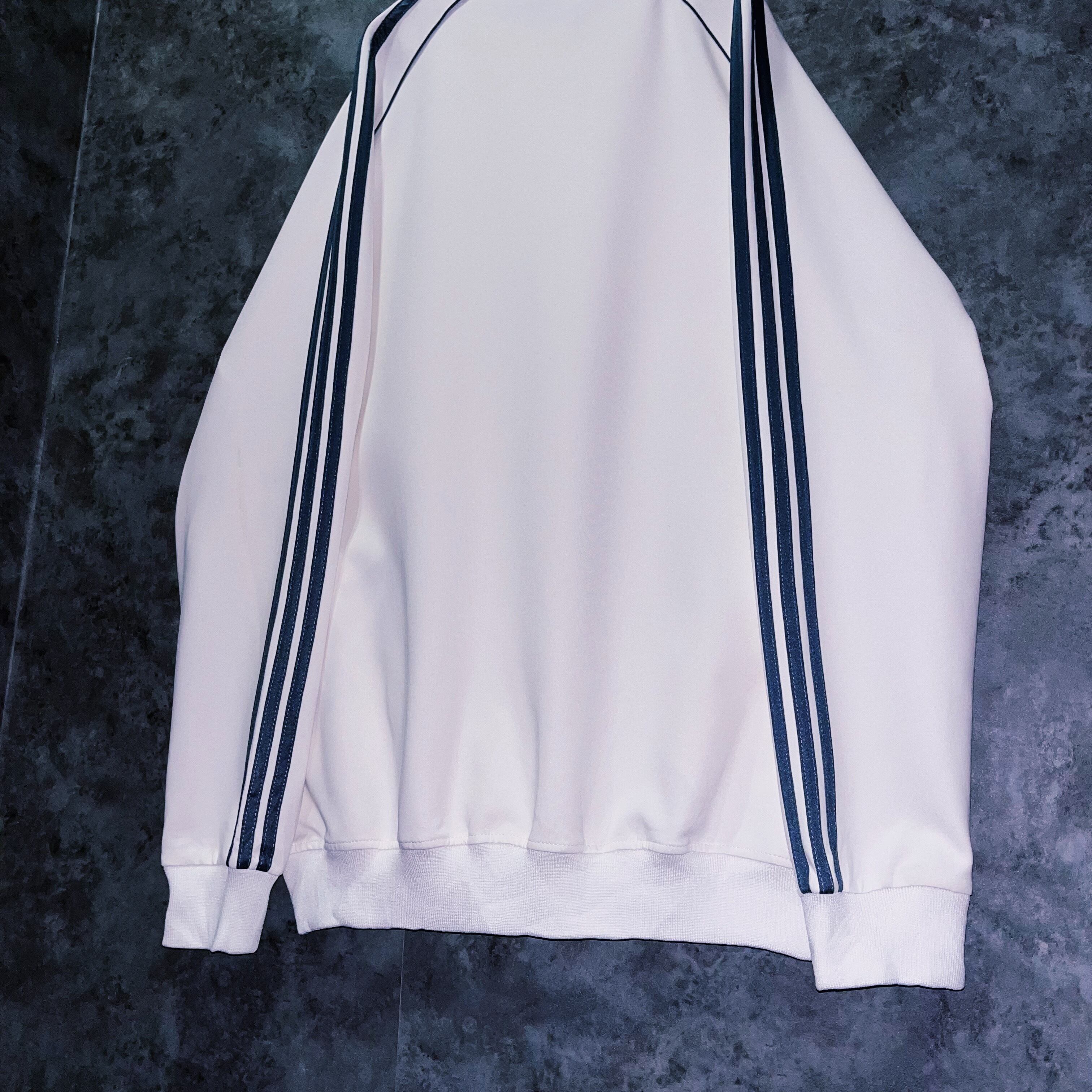 数ある当店のトラックジャケットの中でもかなり人気が高い真っ白なボディにメタルグレーカラーのスリーストライプがデザインされた一着。