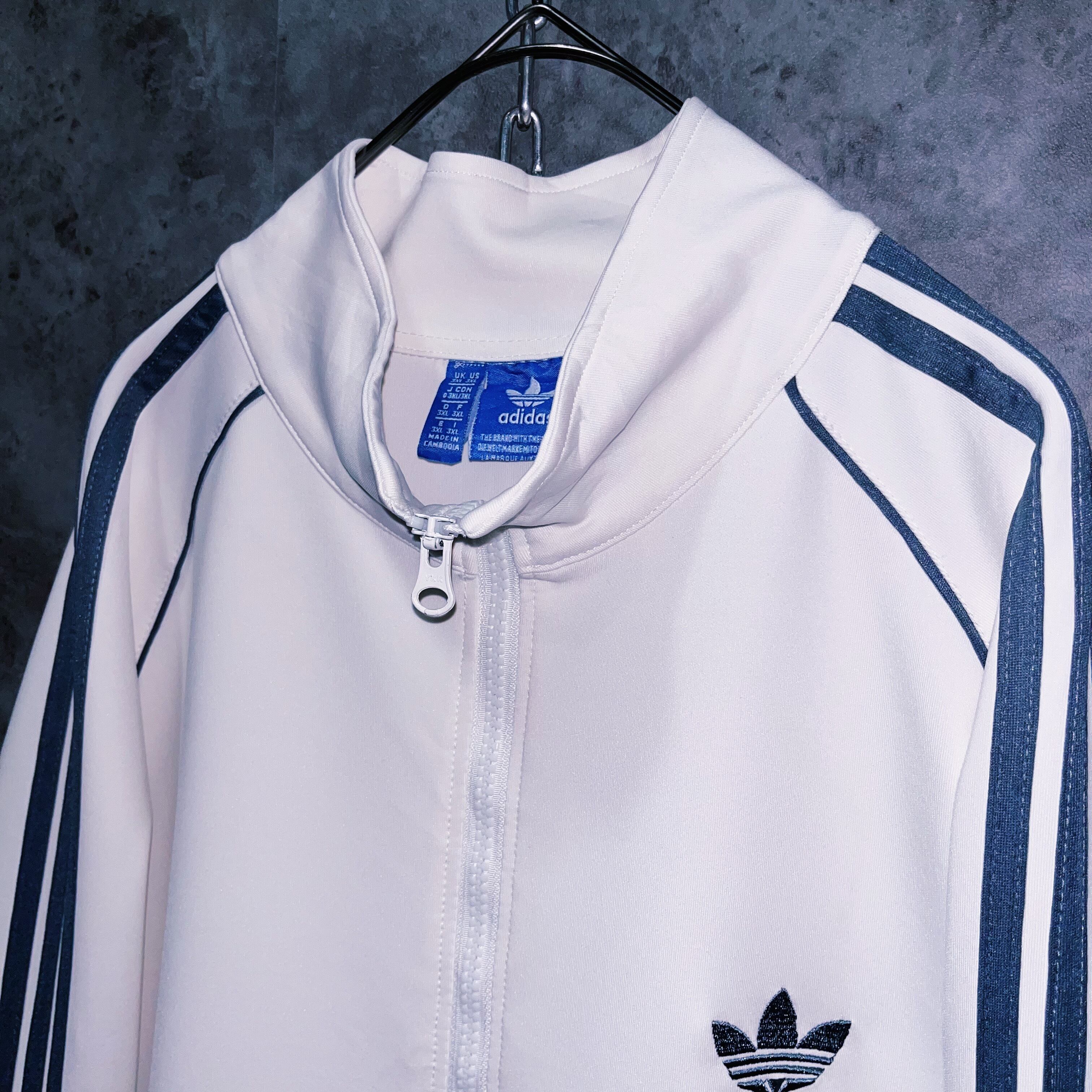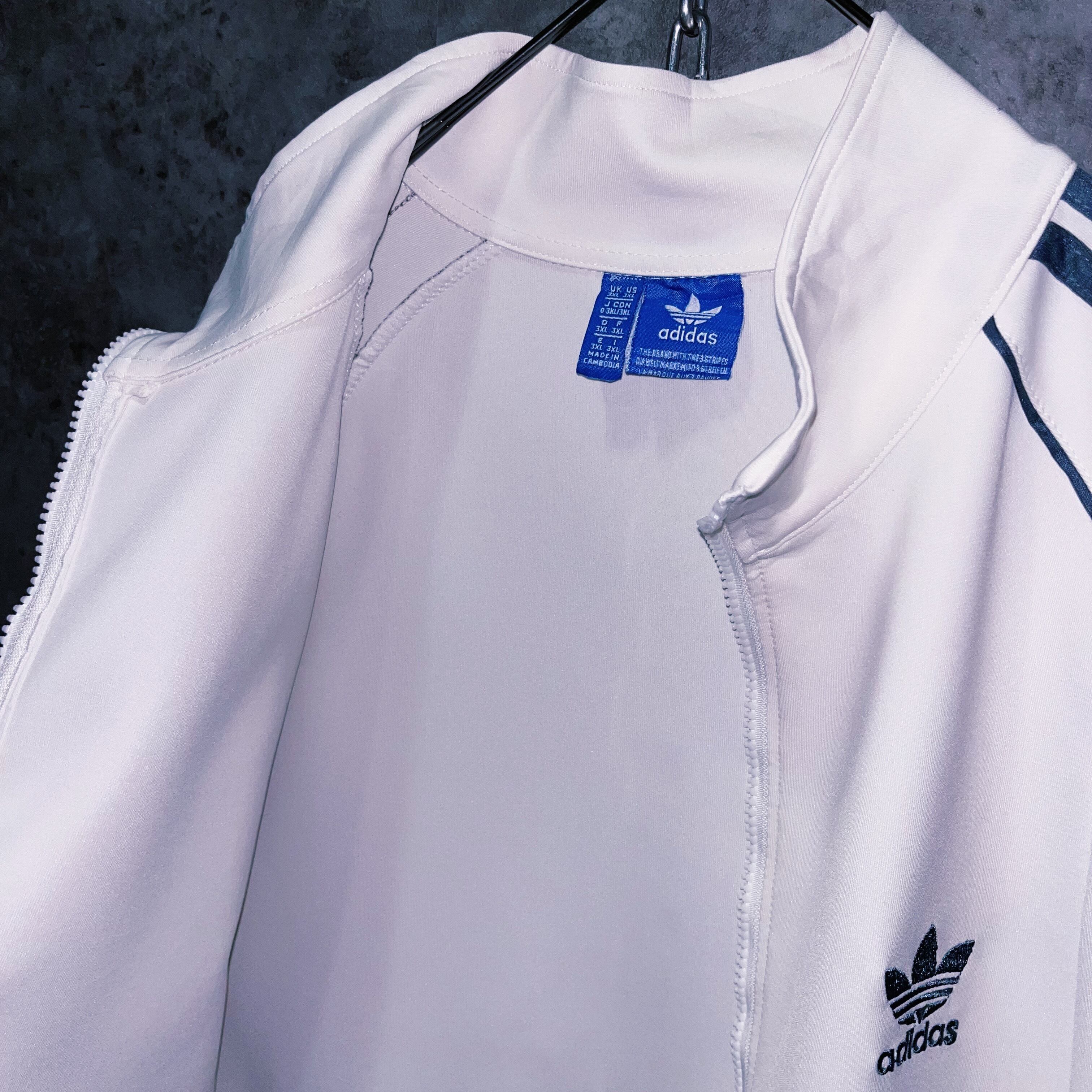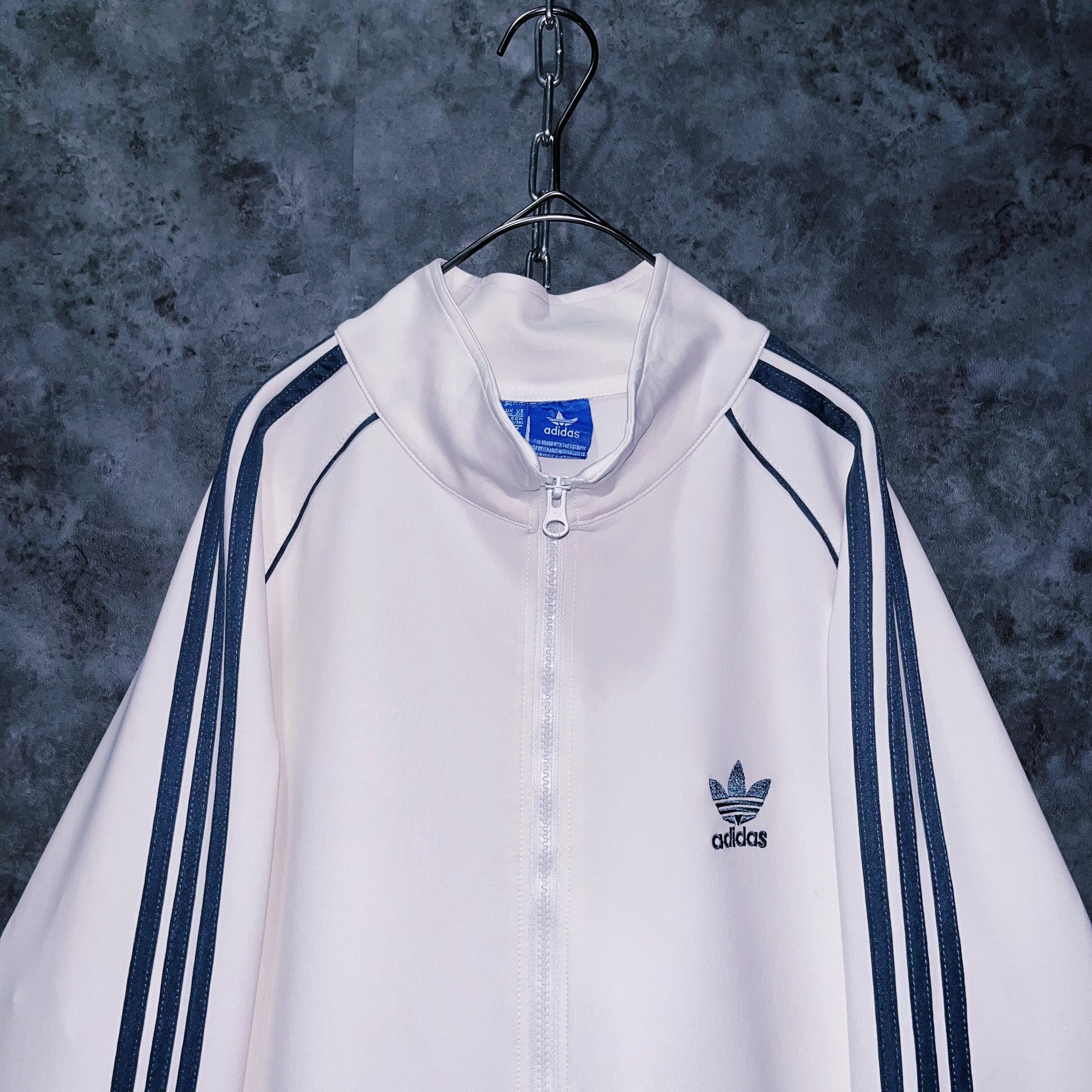数ある当店のトラックジャケットの中でもかなり人気が高い真っ白なボディにメタルグレーカラーのスリーストライプがデザインされた一着。