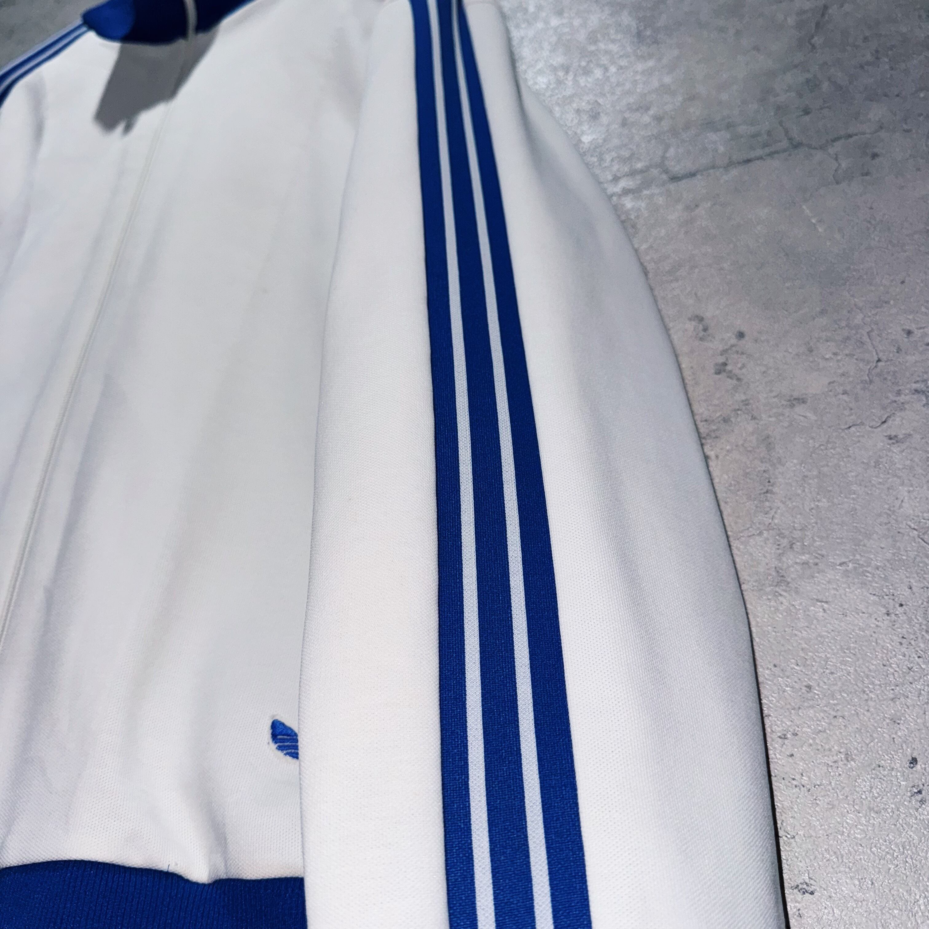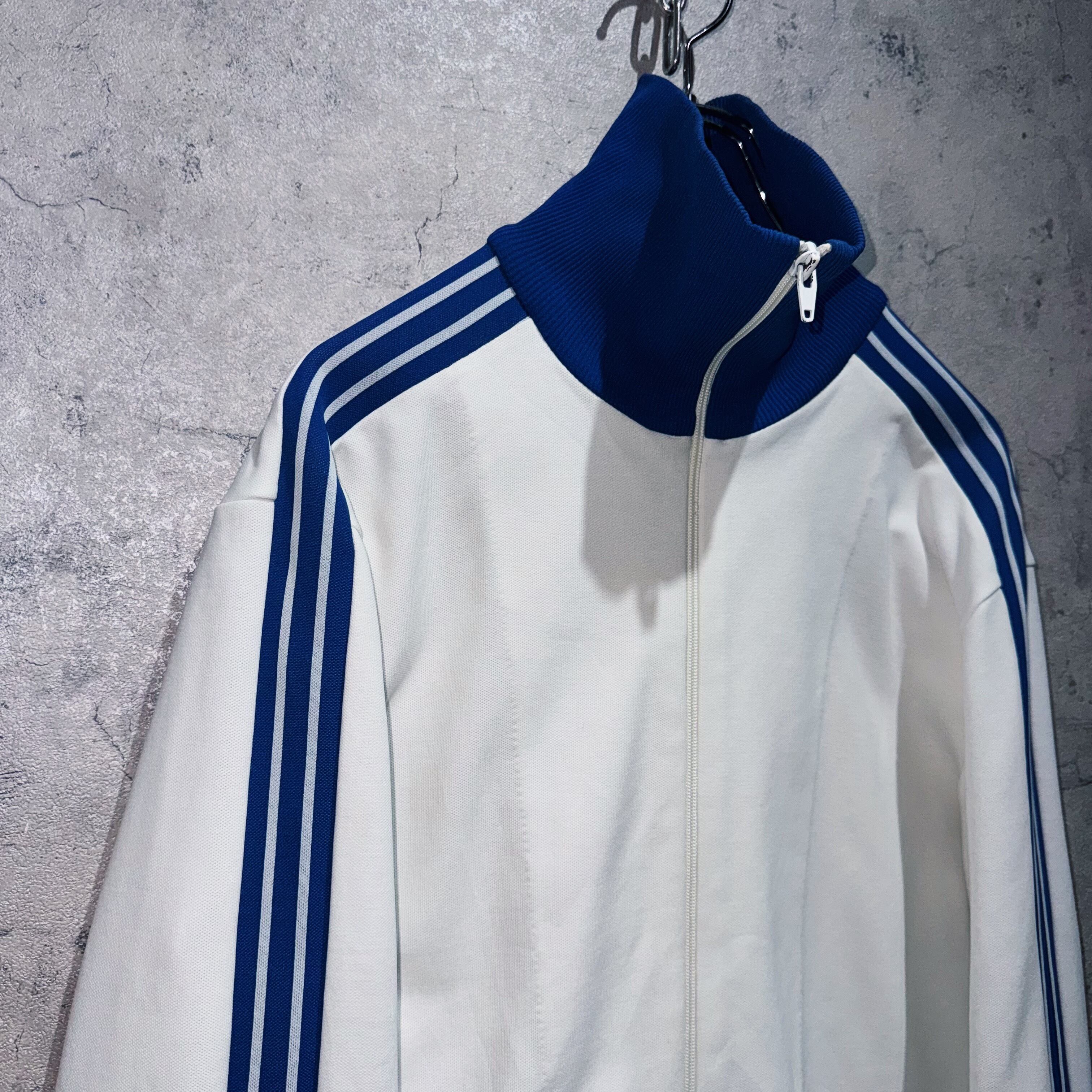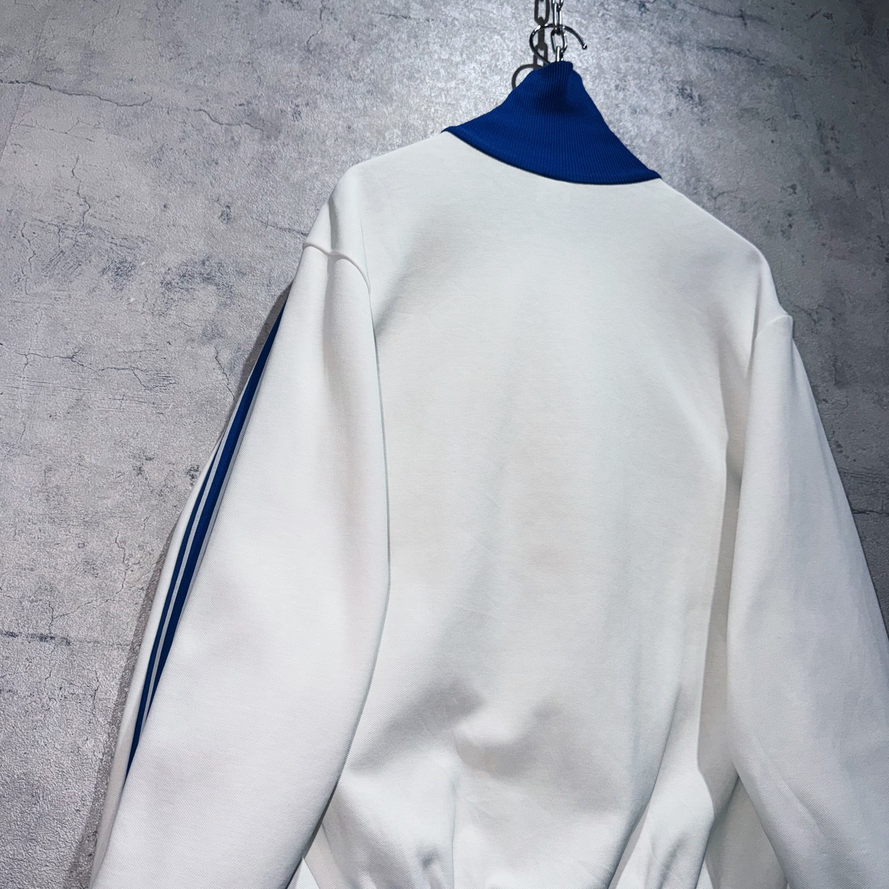 今回も中々お目にかかれないカラーリングでご用意。ホワイトのボディに、アディダスの象徴的な3ストライプスとトレフォイルをブルーカラーであしらった稀有な1着。