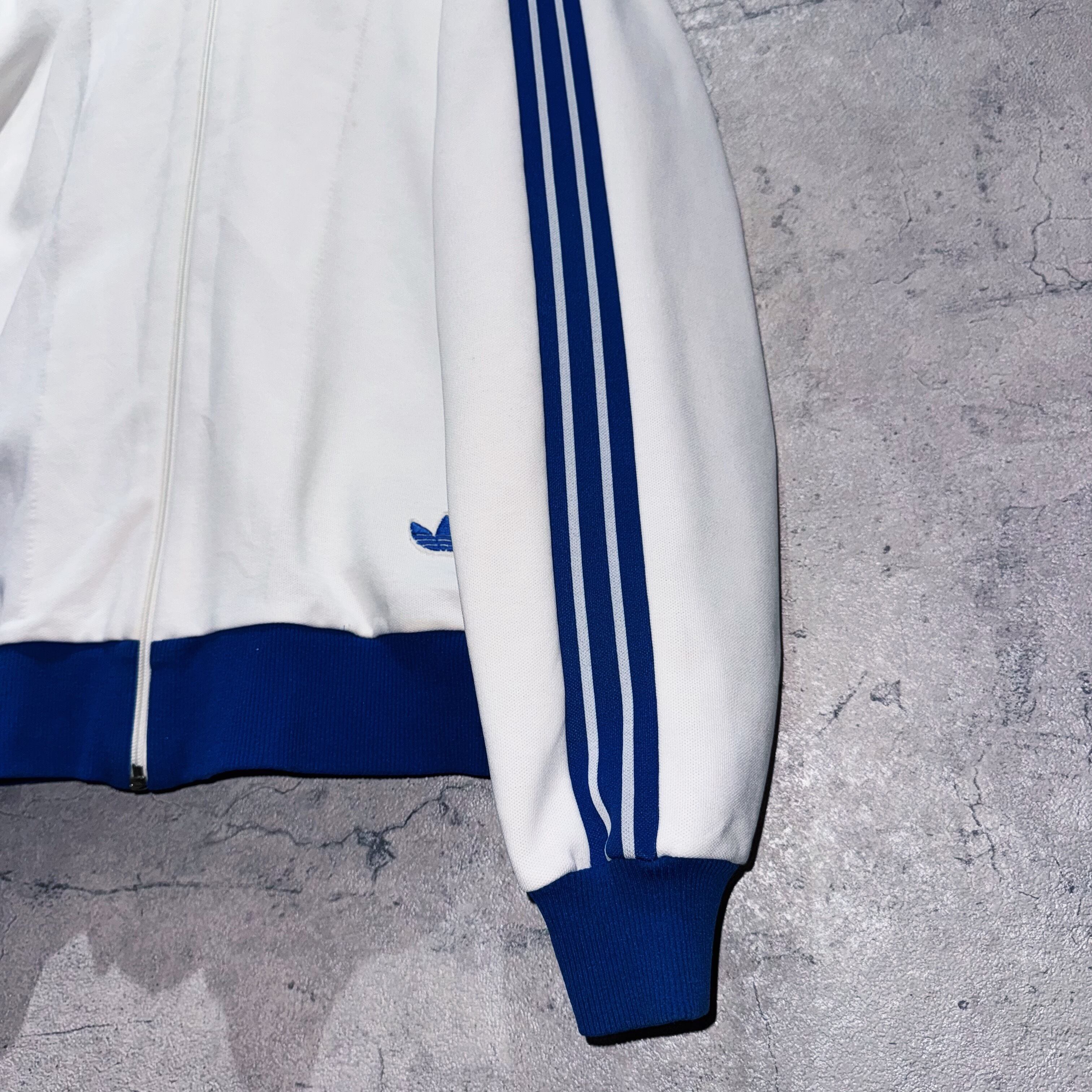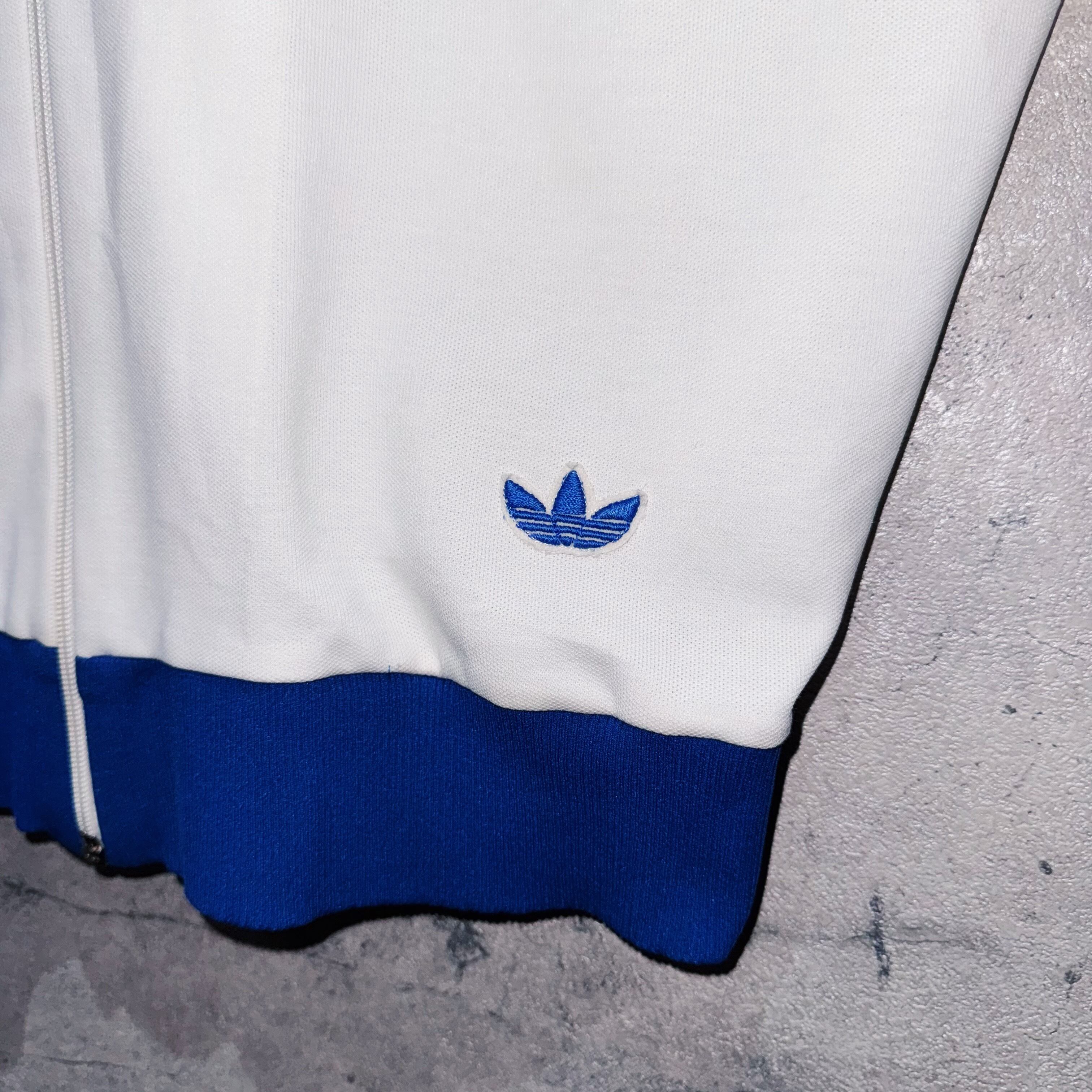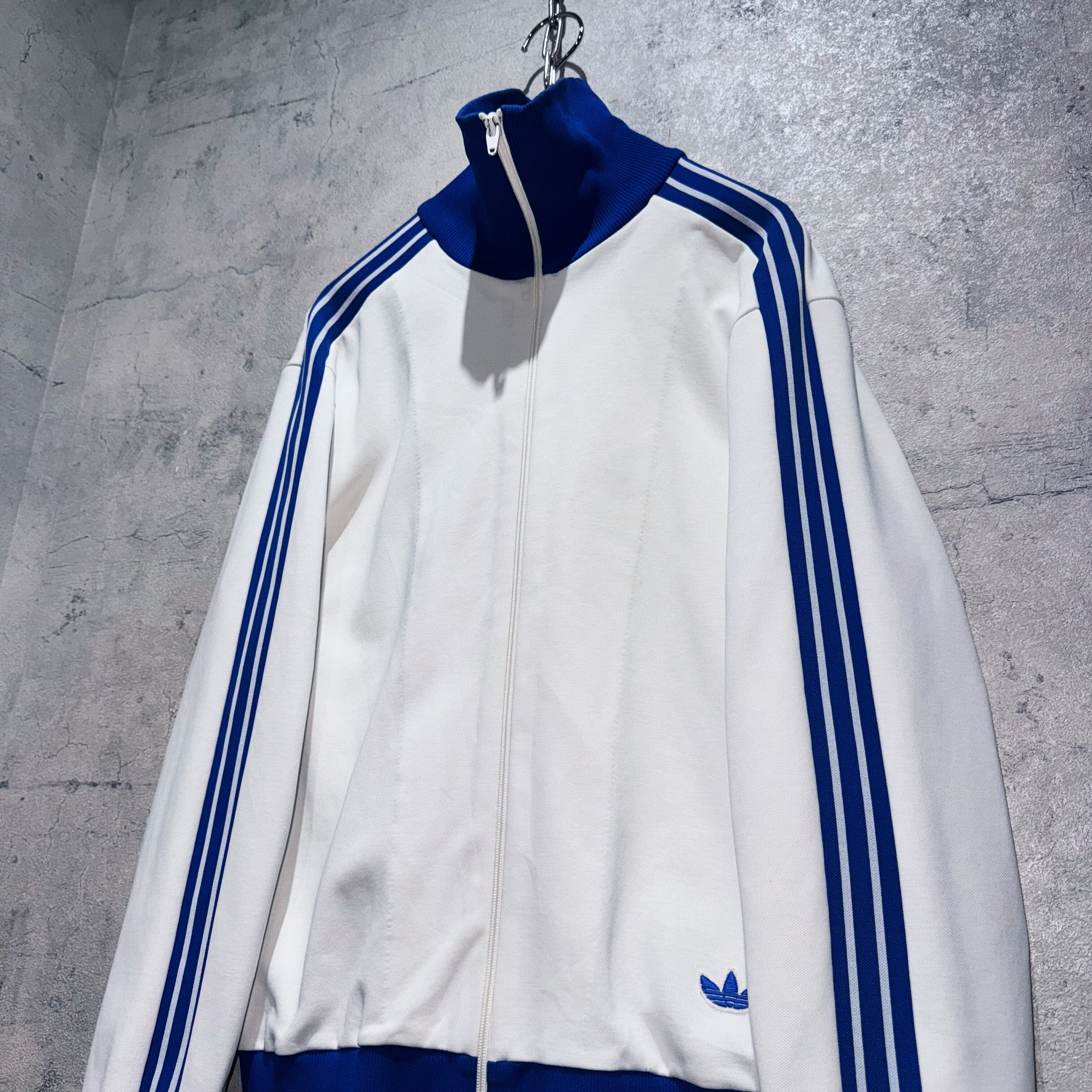 今回も中々お目にかかれないカラーリングでご用意。ホワイトのボディに、アディダスの象徴的な3ストライプスとトレフォイルをブルーカラーであしらった稀有な1着。