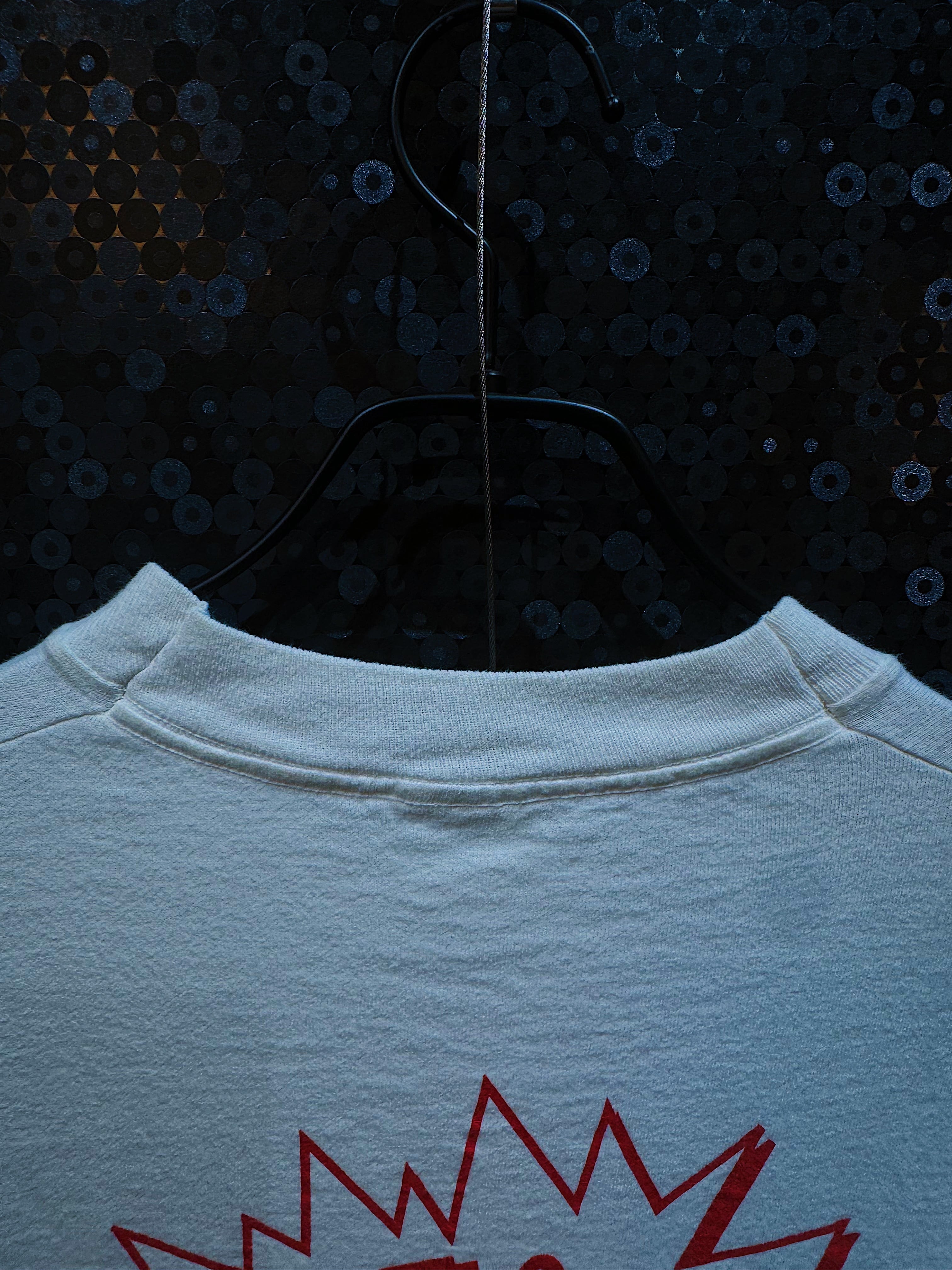 アメリカ製ボディのザラ感と程よい色褪せが、ヴィンテージTらしい風格をプラス。古着としての希少価値はもちろん、カルチャー好き、アート好きの会話のネタとしても最高の1枚です。タブーと愛を、笑いとメッセージで包んだ、パンチの効いたTシャツ。街で着たら、誰かが絶対二度見します。