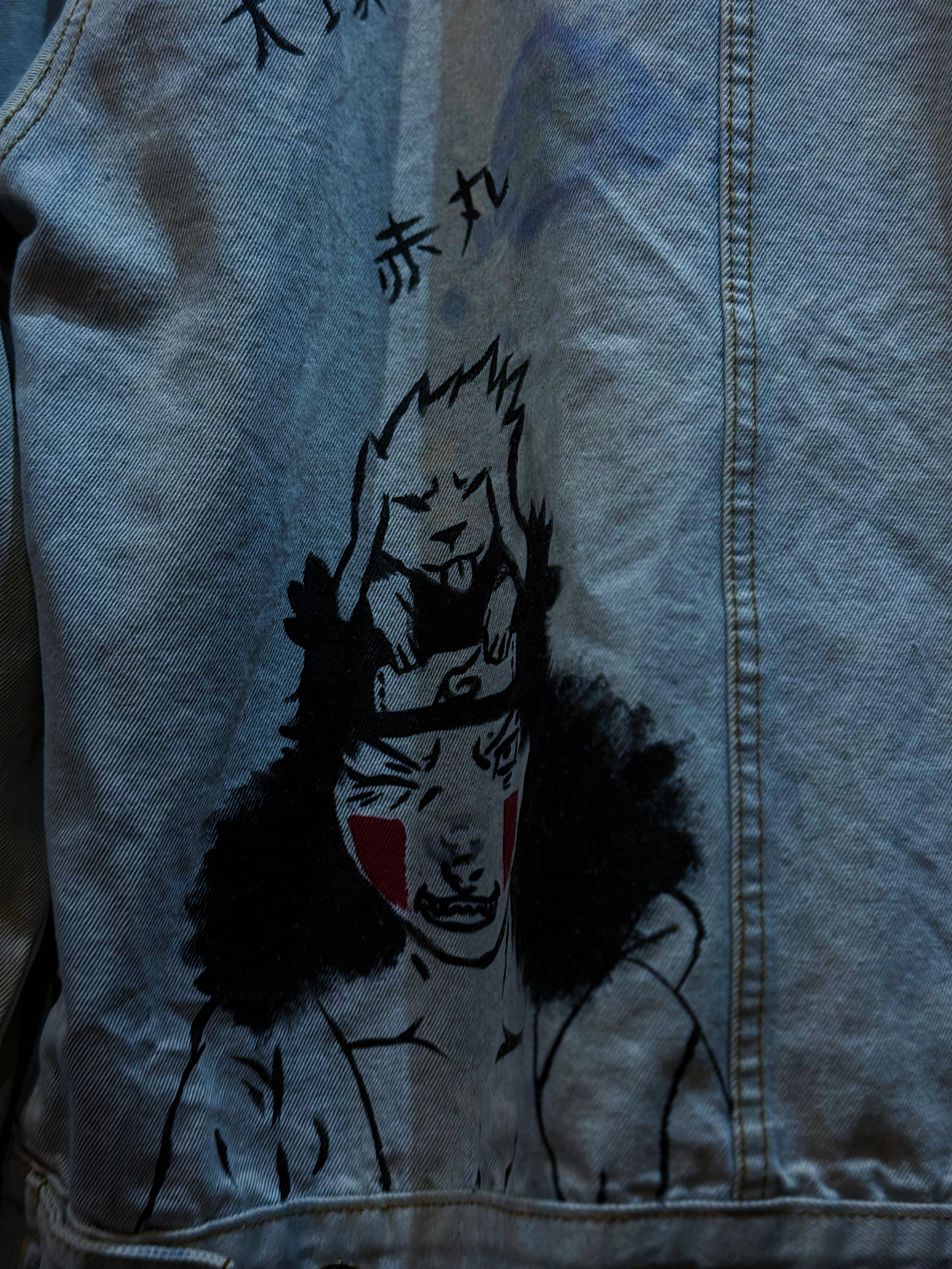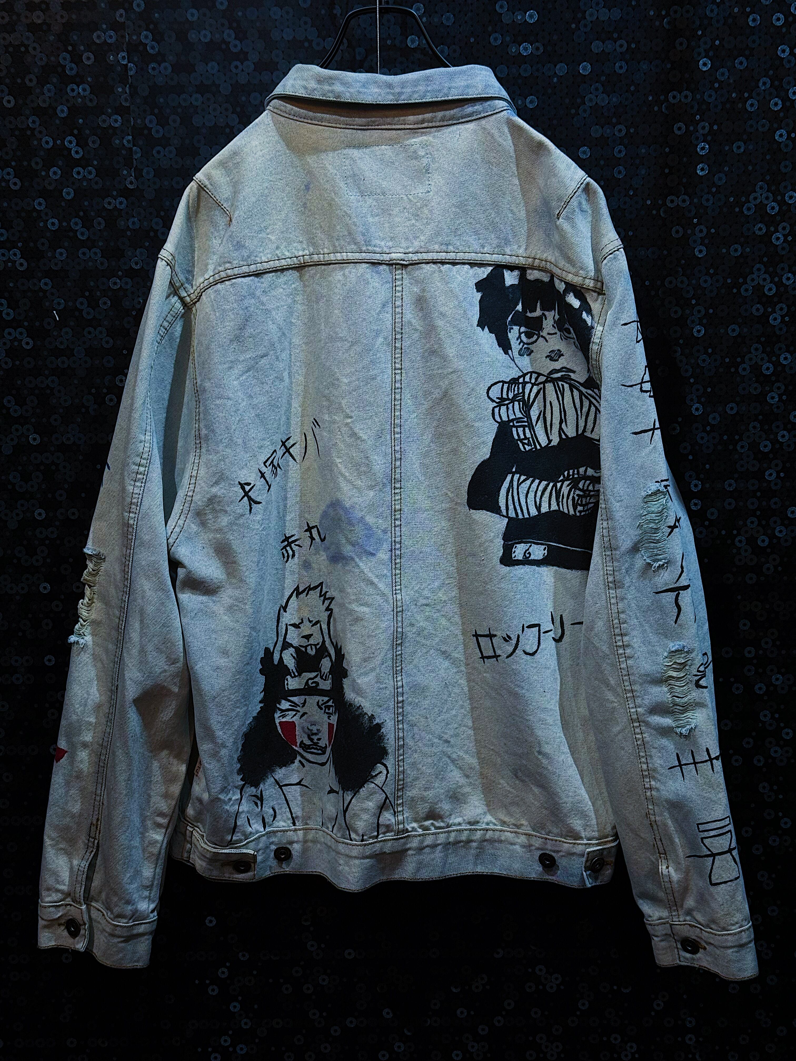 NARUTO -ナルト-』のキャラクターやシンボルをふんだんに盛り込んだ、唯一無二のカスタムデニムジャケット。フロントには「うちは一族」の写輪眼や渦巻き、そして愛の文字が大胆に描かれ、左右の袖には暁や木ノ葉隠れのシンボルマーク、さらには封印術陣のような意匠が並びます。バックスタイルも圧巻で、我愛羅、キバ&赤丸、テンテンといった個性的な忍たちがモノトーンで力強く配置され、アーティスティックなタッチで描かれたグラフィックがインパクトを放ちます。