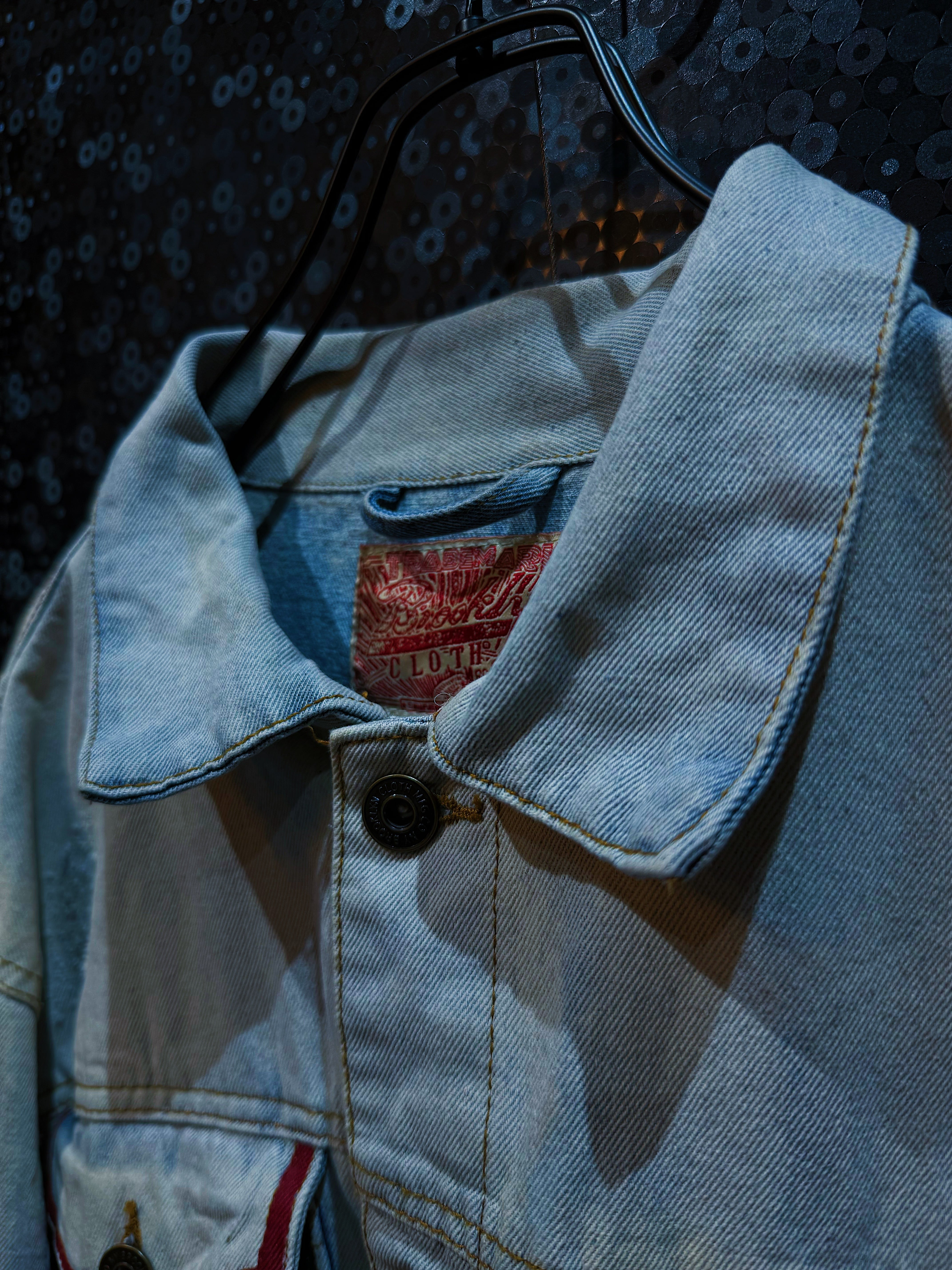 全体に軽めのダメージ加工が施され、使い込まれた風合いがアニメモチーフにリアリティを加えており、アートピースとしても成立するレベルの仕上がりです。ベースのデニムは淡いブルーグレーで、手描きのブラック&レッドのラインが抜群のコントラストを生み出しています。