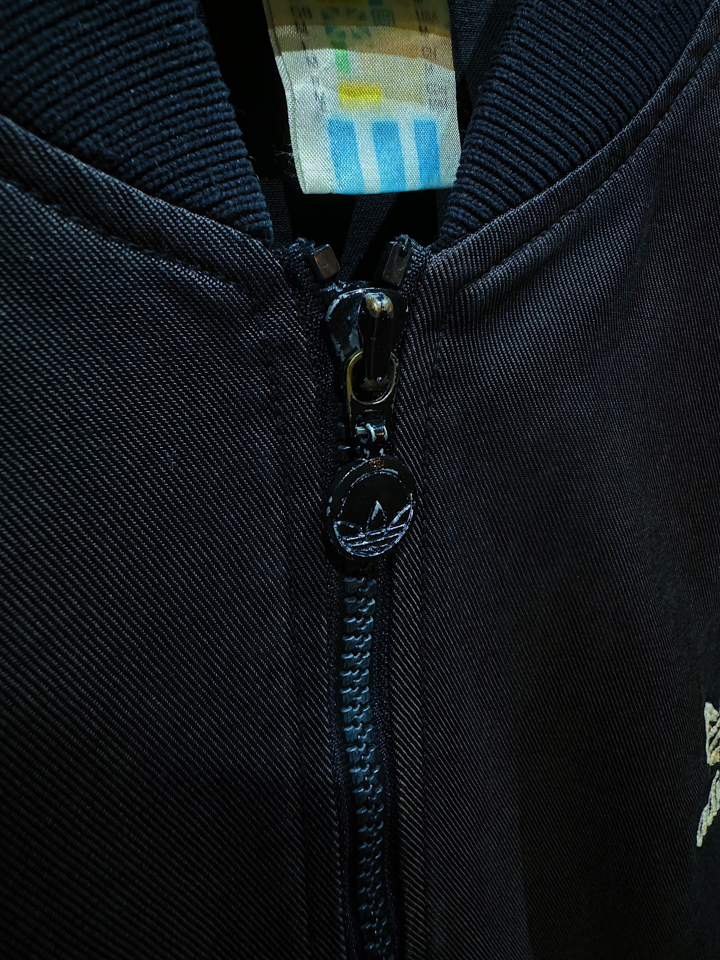 左胸にはお馴染みのトレフォイルロゴが刺繍されており、フロントジップの持ち手にまでロゴが施されるなど、細部のデザインにも手抜かりなし。内タグには複数言語が記載されており、ヨーロッパ圏向けアイテムの可能性もある希少性を感じさせるディテールです。