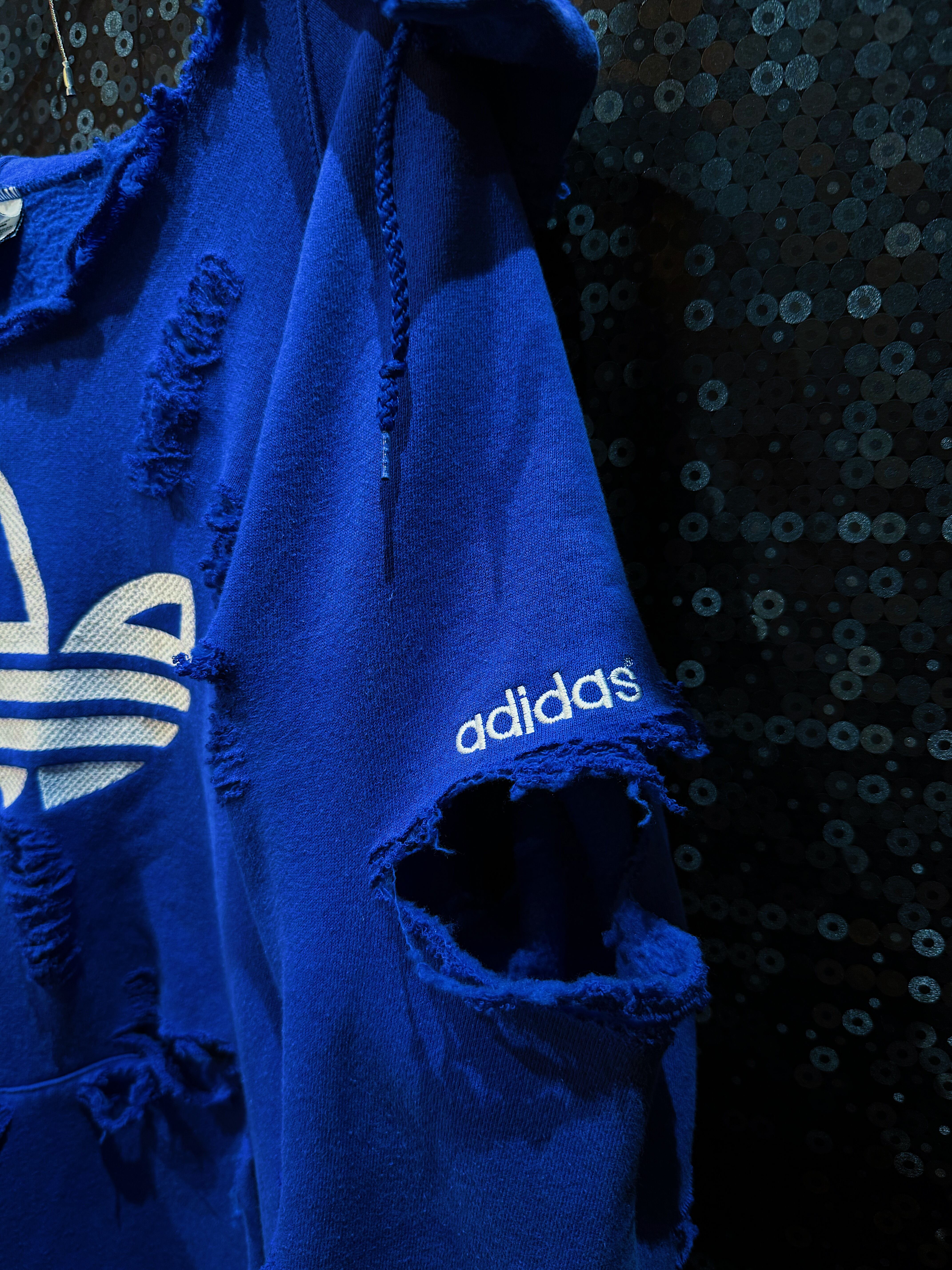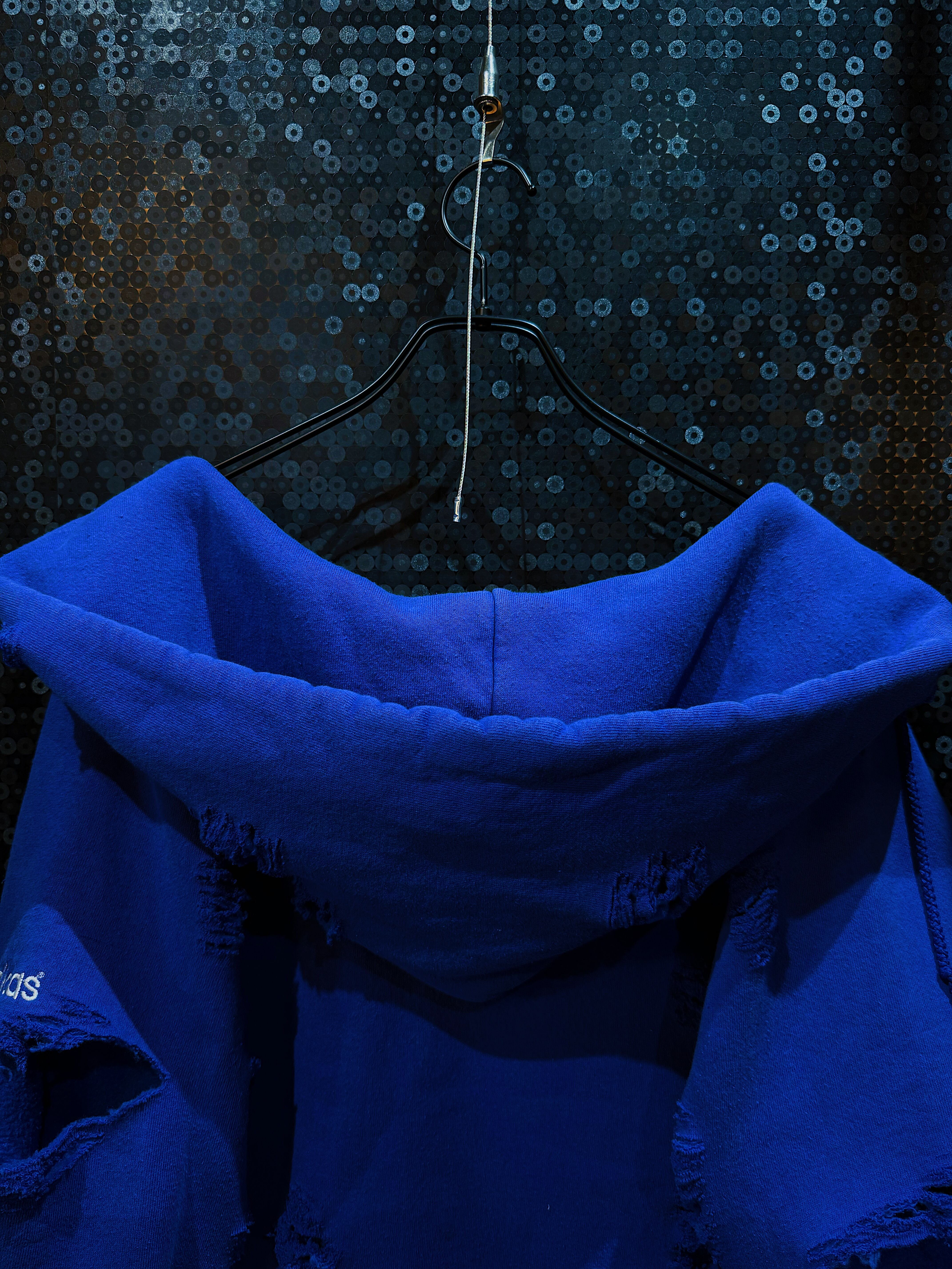 adidasのUSA製トレフォイルロゴ入りボロカスタムフーディー。鮮烈なロイヤルブルーのボディに、アイコニックなトレフォイルロゴを堂々と配置した一着。その存在感だけでも十分ながら、全体に施された大胆なダメージ加工が唯一無二のオーラを放っています。フードや袖口、裾リブに至るまで“破れ”と“ほつれ”を計算し尽くしたかのようにデザイン。ボロの無秩序さが、逆にこのフーディーの完成度を引き上げています。