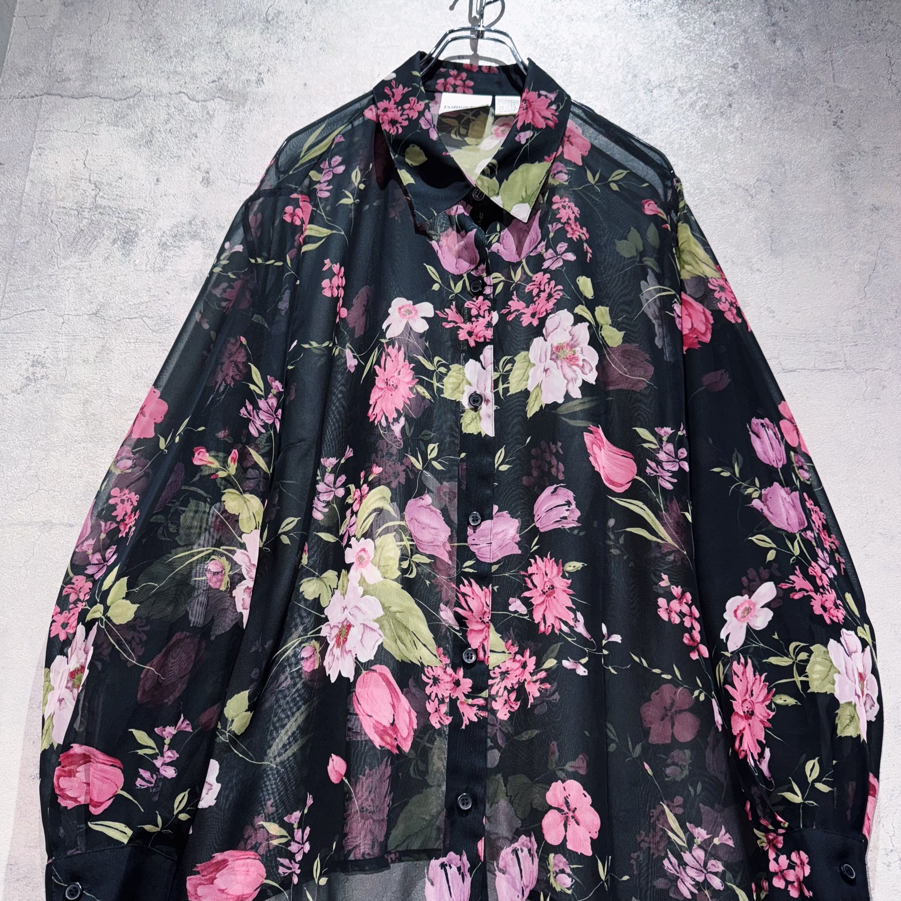 美しく咲き誇る花柄デザインを全面にあしらったエレガンスなデザインシャツ。黒のボディに咲き誇る花々は圧巻の佇まい。