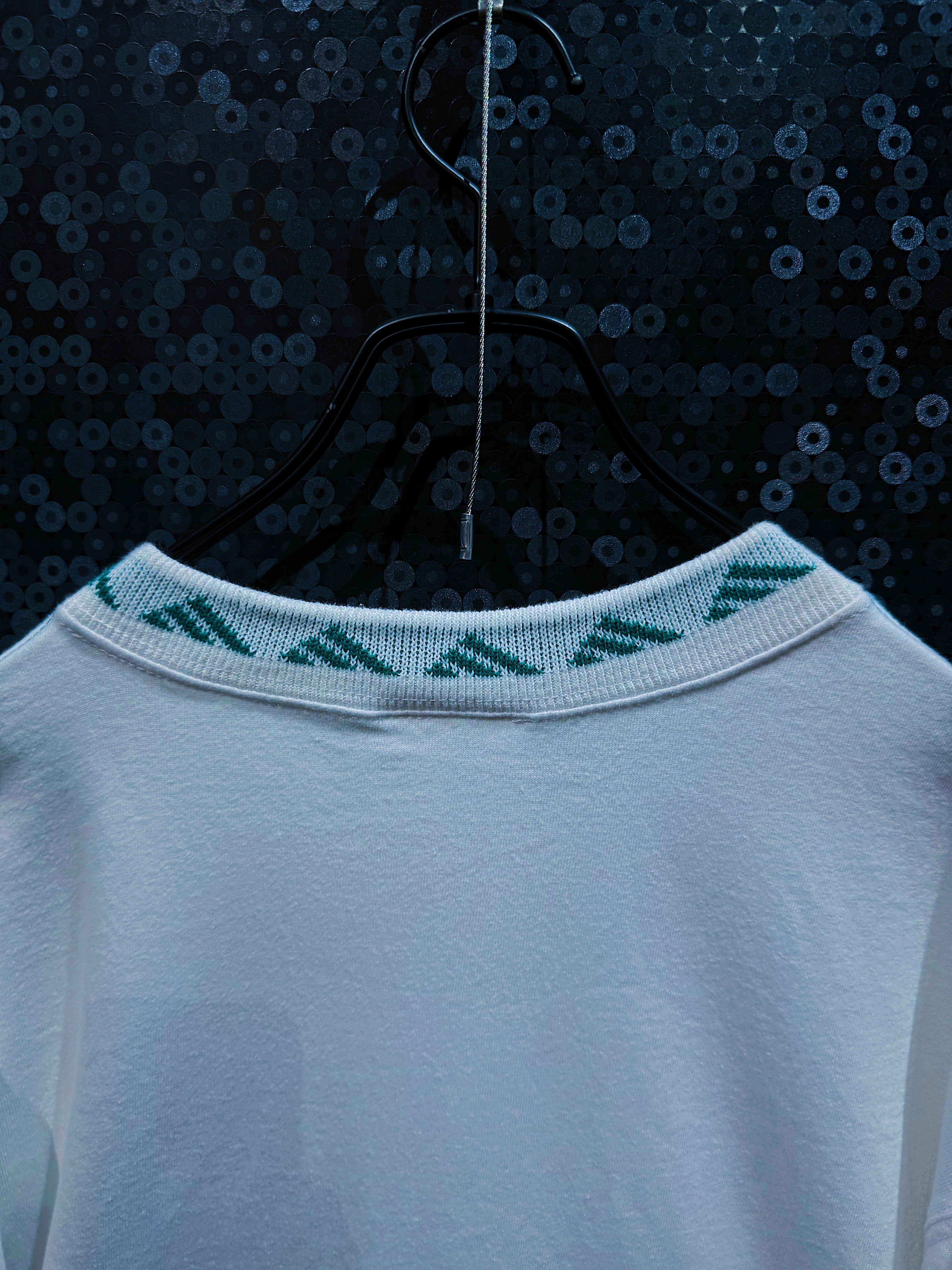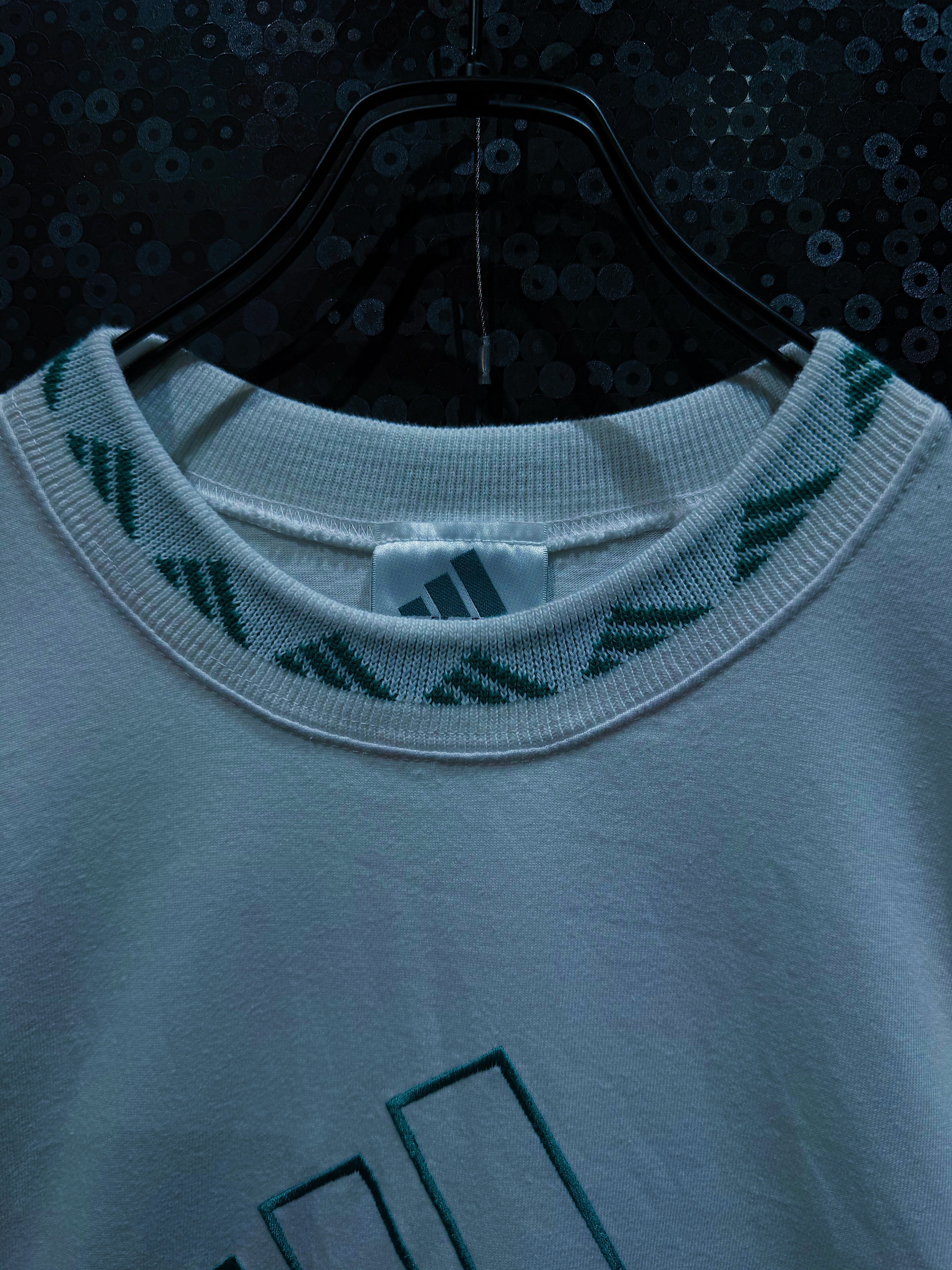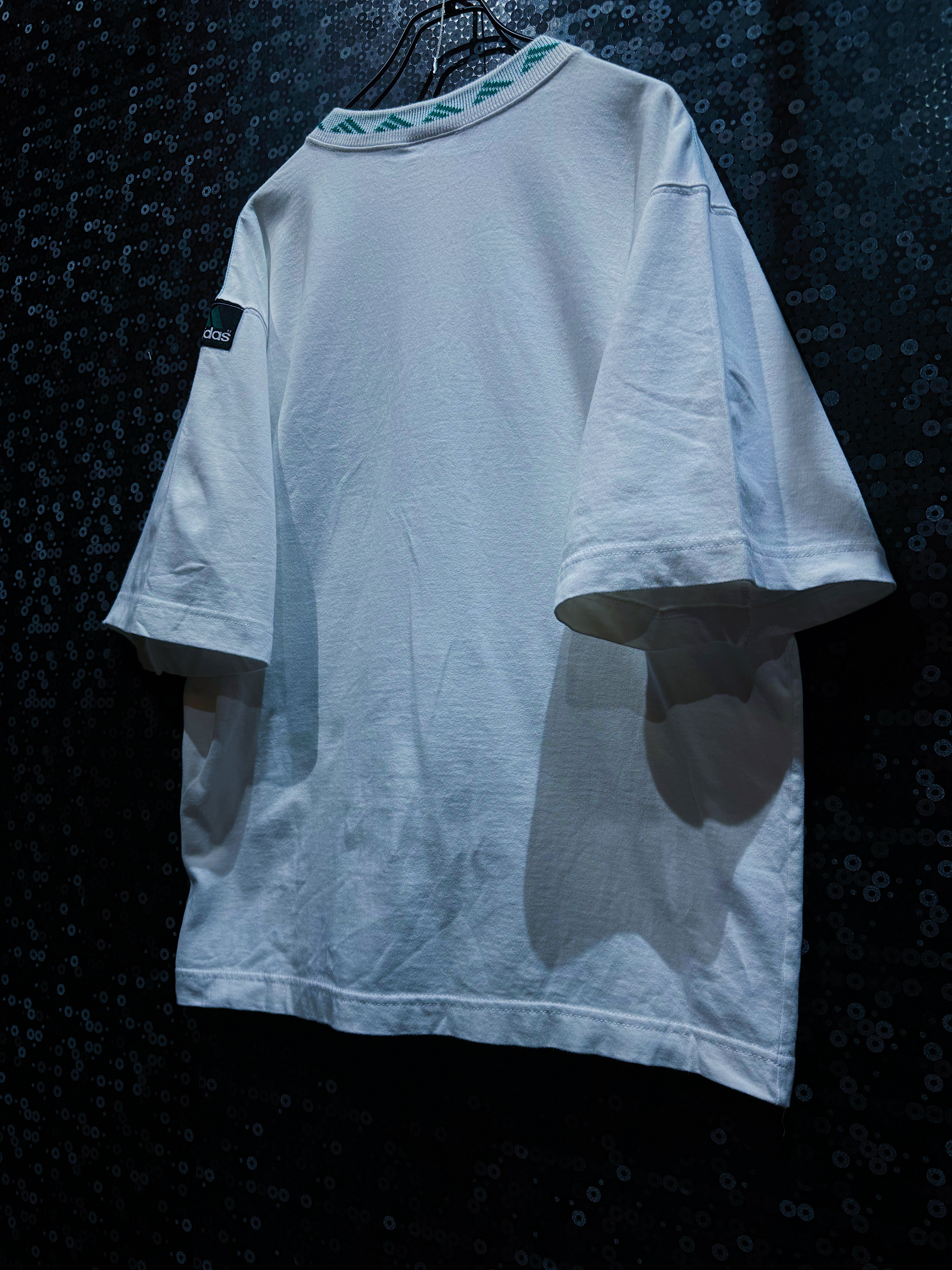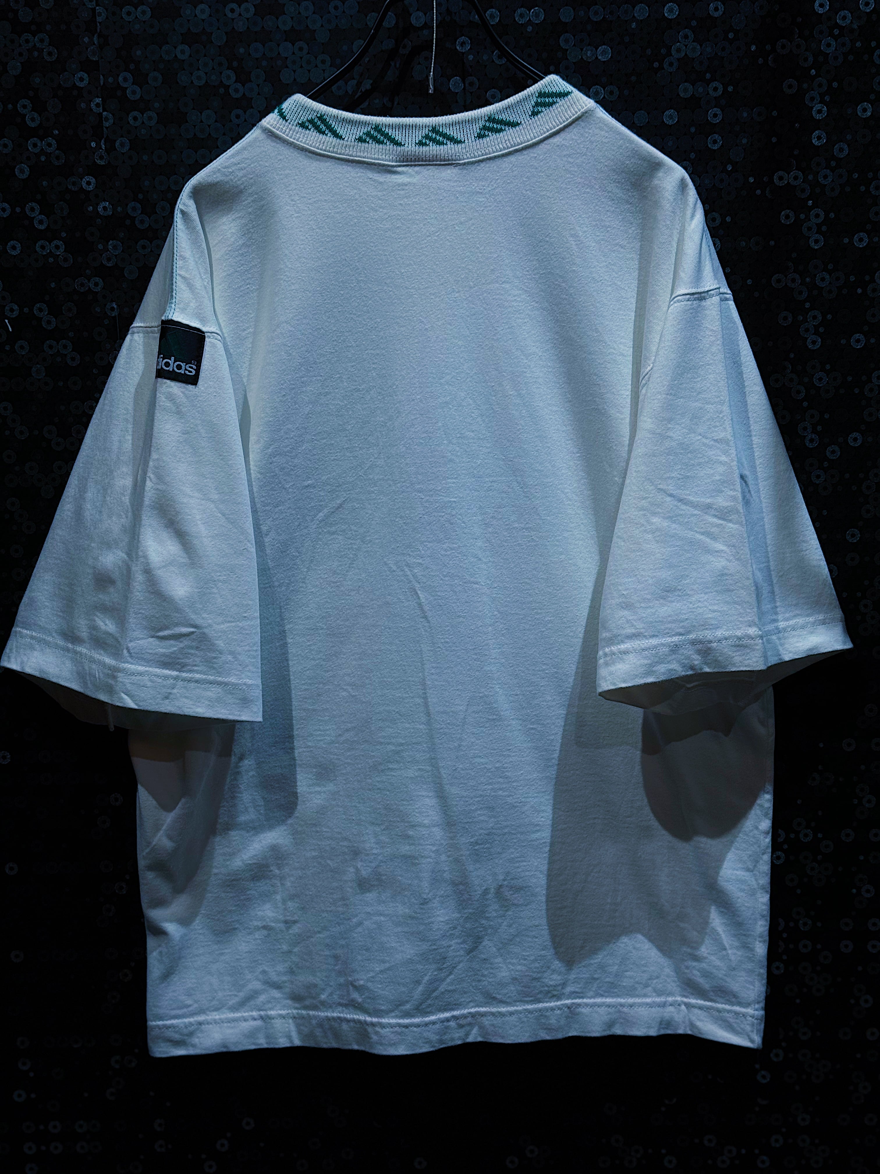 胸元に大胆に刺繍されたEQロゴは、90年代adidasのテクニカルな美学を体現した象徴的デザイン。特にこの個体は、襟元のグリーン×ホワイトのラインリブや、左袖のブラックタグなど、通常のadidas Tシャツには見られないディテールが散りばめられています。