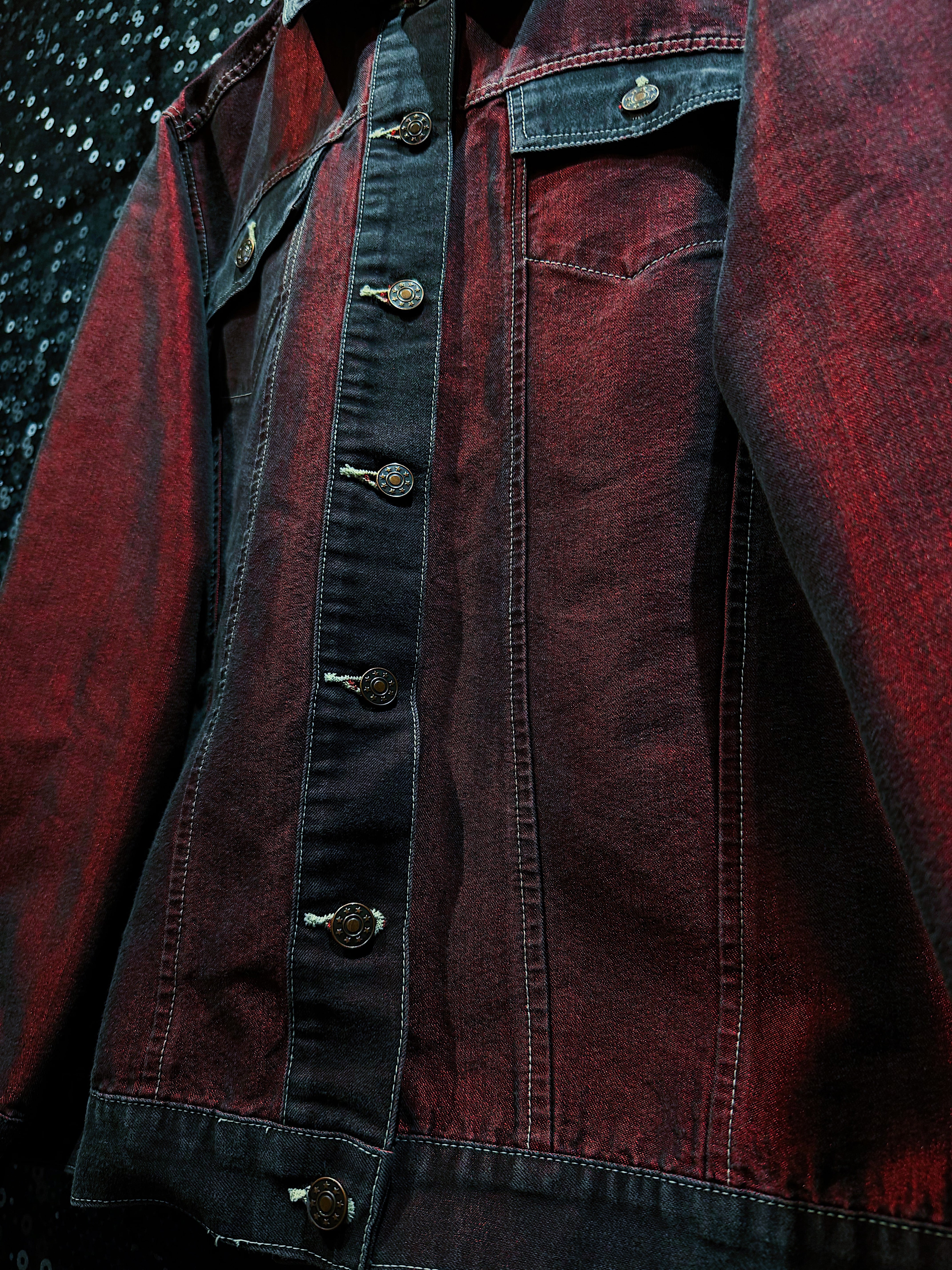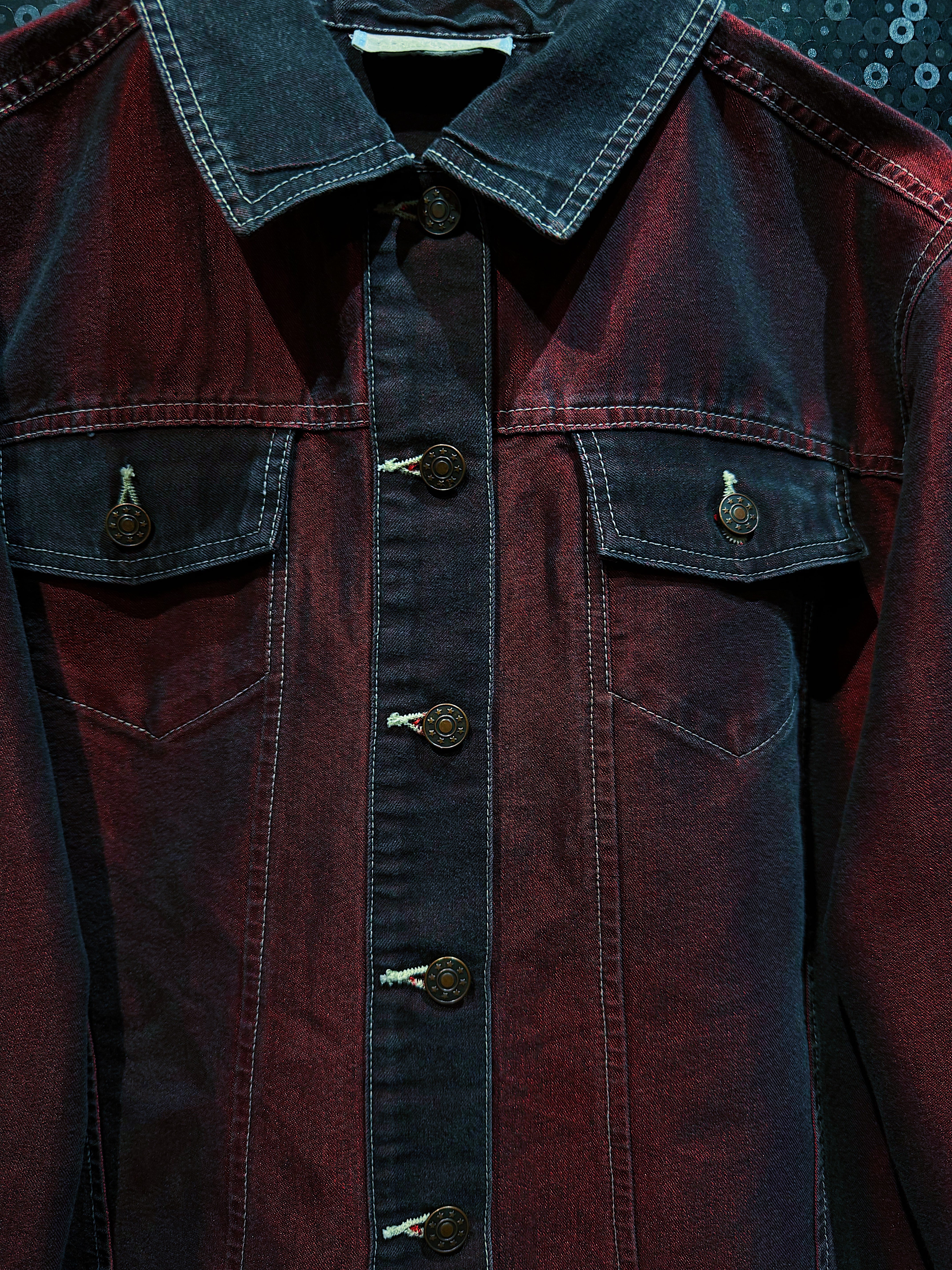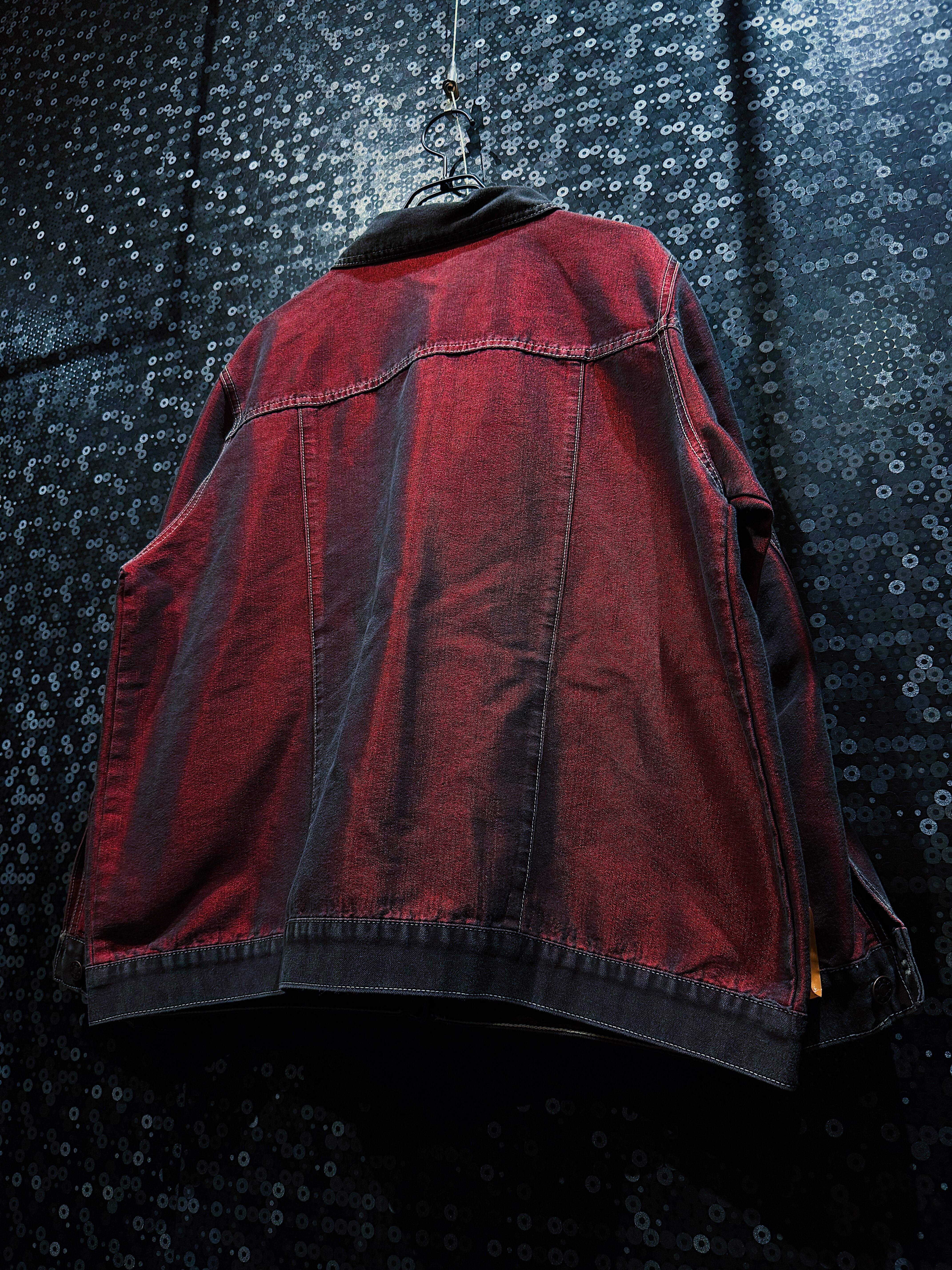 「CAPISTRANO Jeans」製のヴィンテージデニムジャケットで、最大の特徴は何といってもその印象的な“赤黒グラデーション”の色合いです。通常のインディゴやブラックデニムとは一線を画す、妖艶で攻撃的なムードを纏ったカラーリングで、光の当たり具合によって黒から深紅(スカーレットレッド)に表情が変化し、ヴィンテージでありながら非常にモード感のあるルックを実現しています。