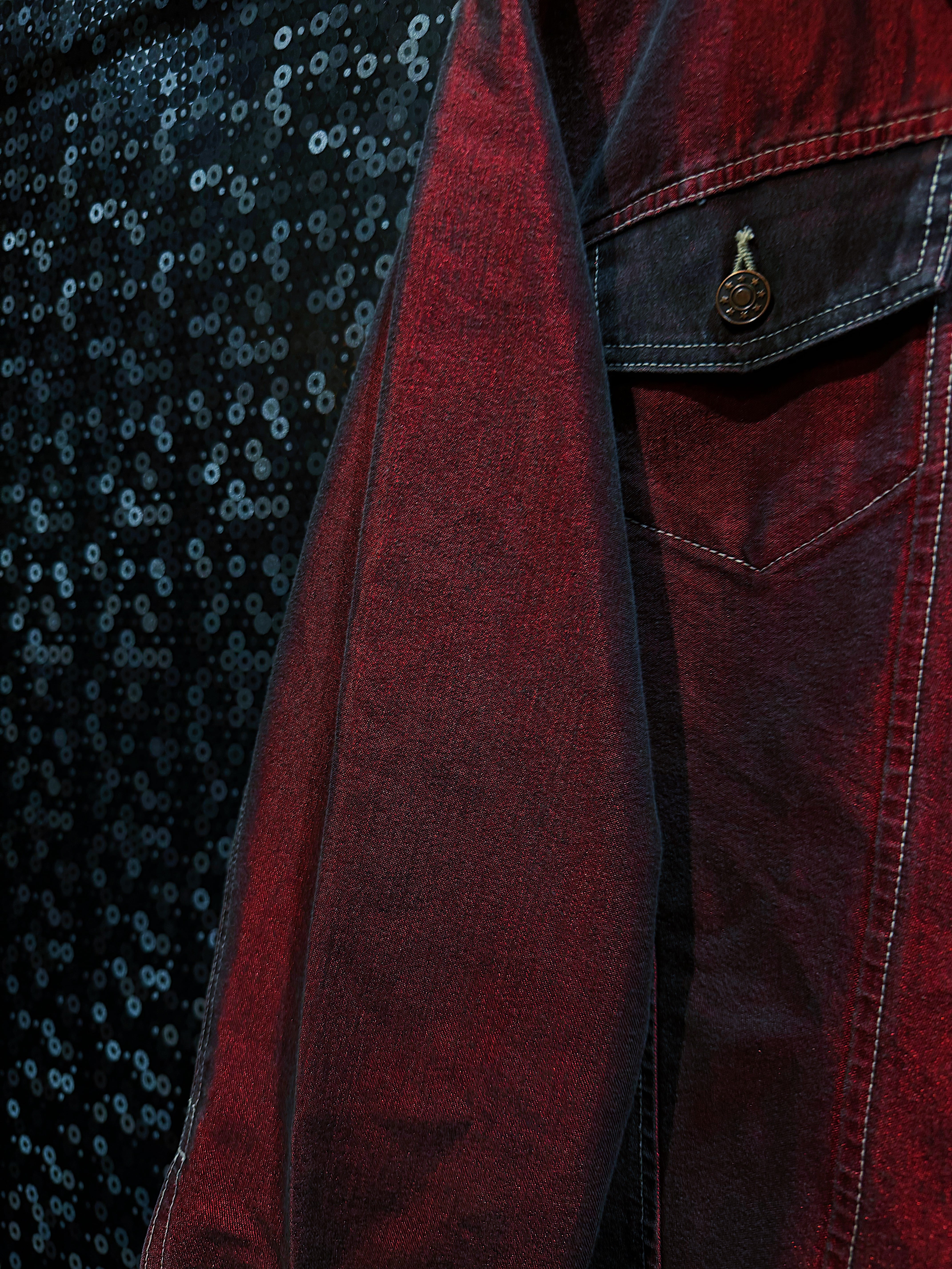 この赤のトーンは、一般的な「ワインレッド」よりも明るく、「バーガンディ」よりも生々しく、「ブラッドレッド」にも近い深みを持っていますが、光沢感を帯びることで“スモーキー・スカーレット”や“バーニング・カーマイン”とも呼べそうな、燃えるような血色感が印象的です。デニム素材の凹凸に沿って赤が滲むように広がっており、それによってまるでスプレーペイントを重ねたような陰影が生まれ、アートピースのような佇まいを持っています。