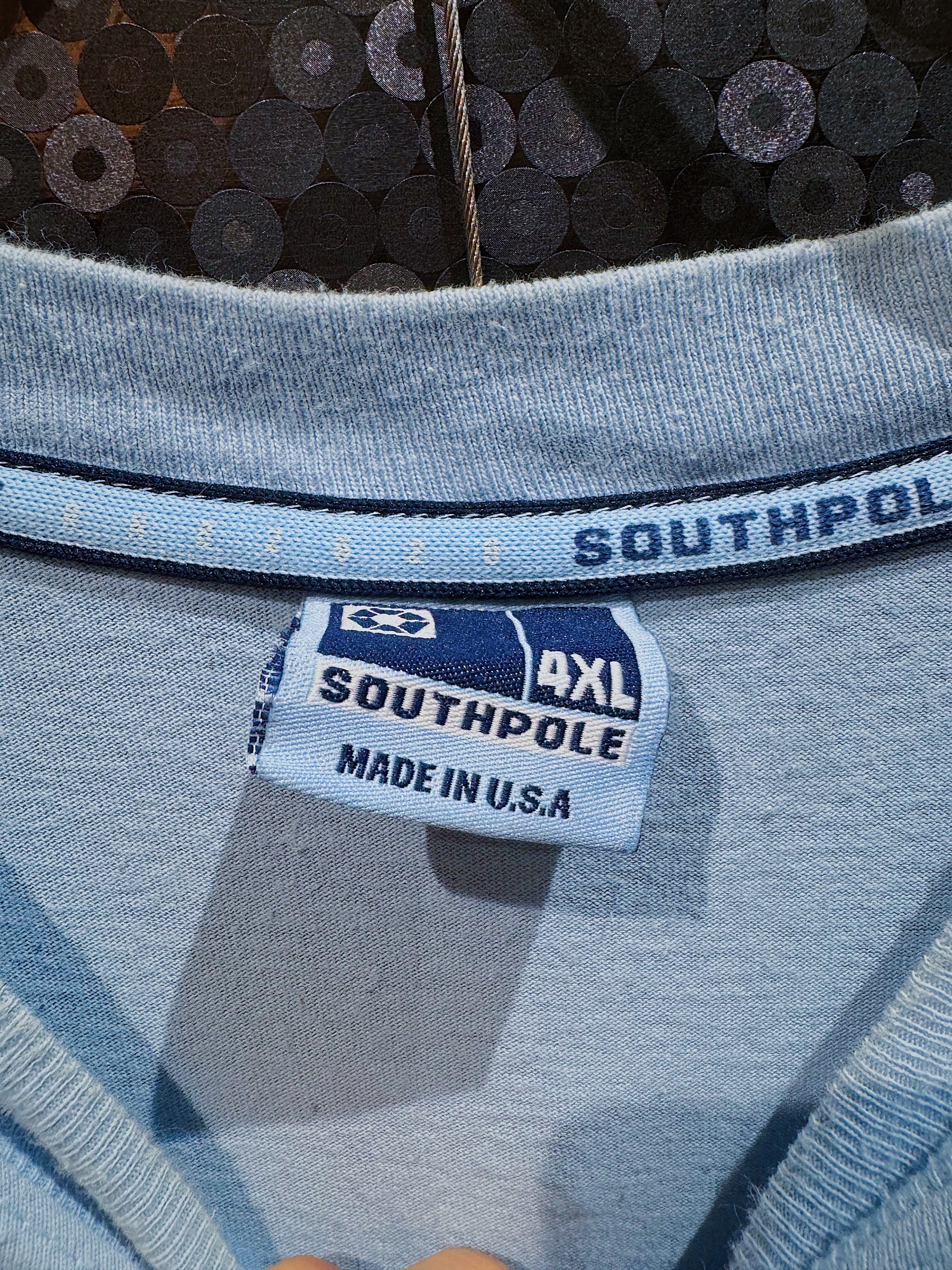 淡いスモーキーブルーのボディに、ニューヨークの摩天楼を思わせるスプレータッチのシティグラフィックが施され、その上にメタリック調で浮き出す「SOUTHPOLE」ロゴが堂々と鎮座。さらに「21」のナンバリングがアクセントとなり、ブランド特有のアーバンかつスポーティーなムードを引き立てます。