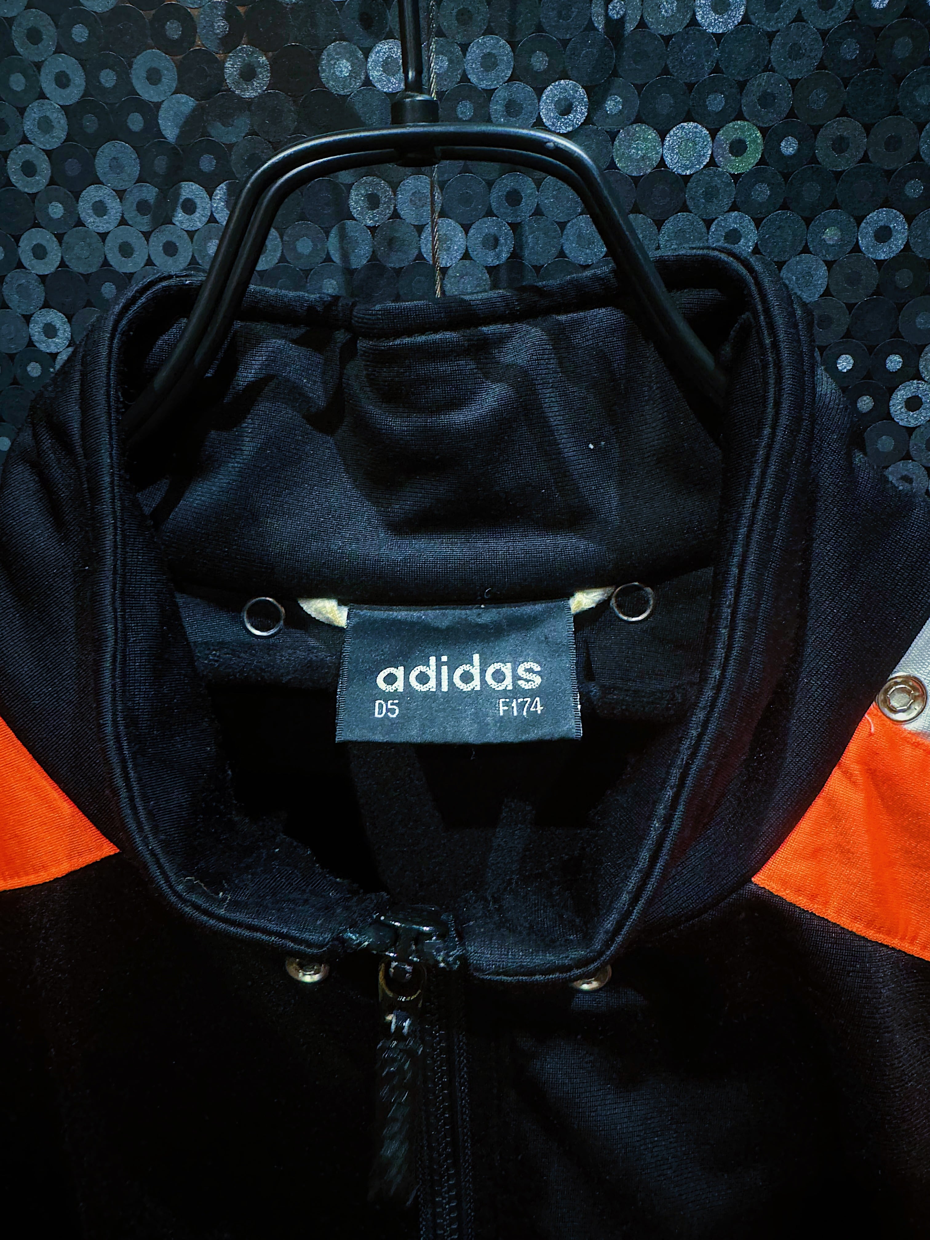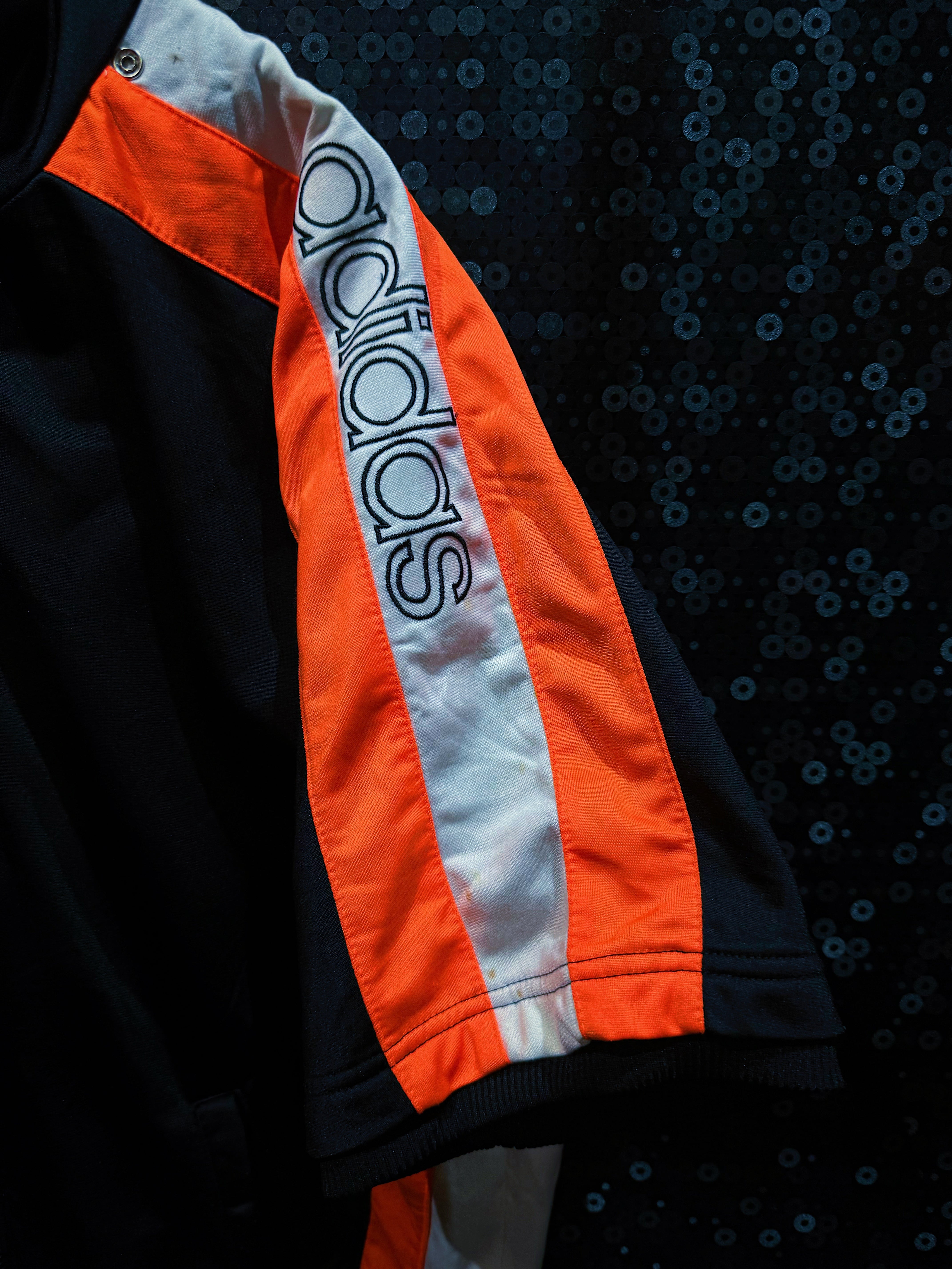 大胆なブラック×オレンジ×ホワイトの切り替えが目を惹く、ヴィンテージadidasの半袖トラックジャケット。