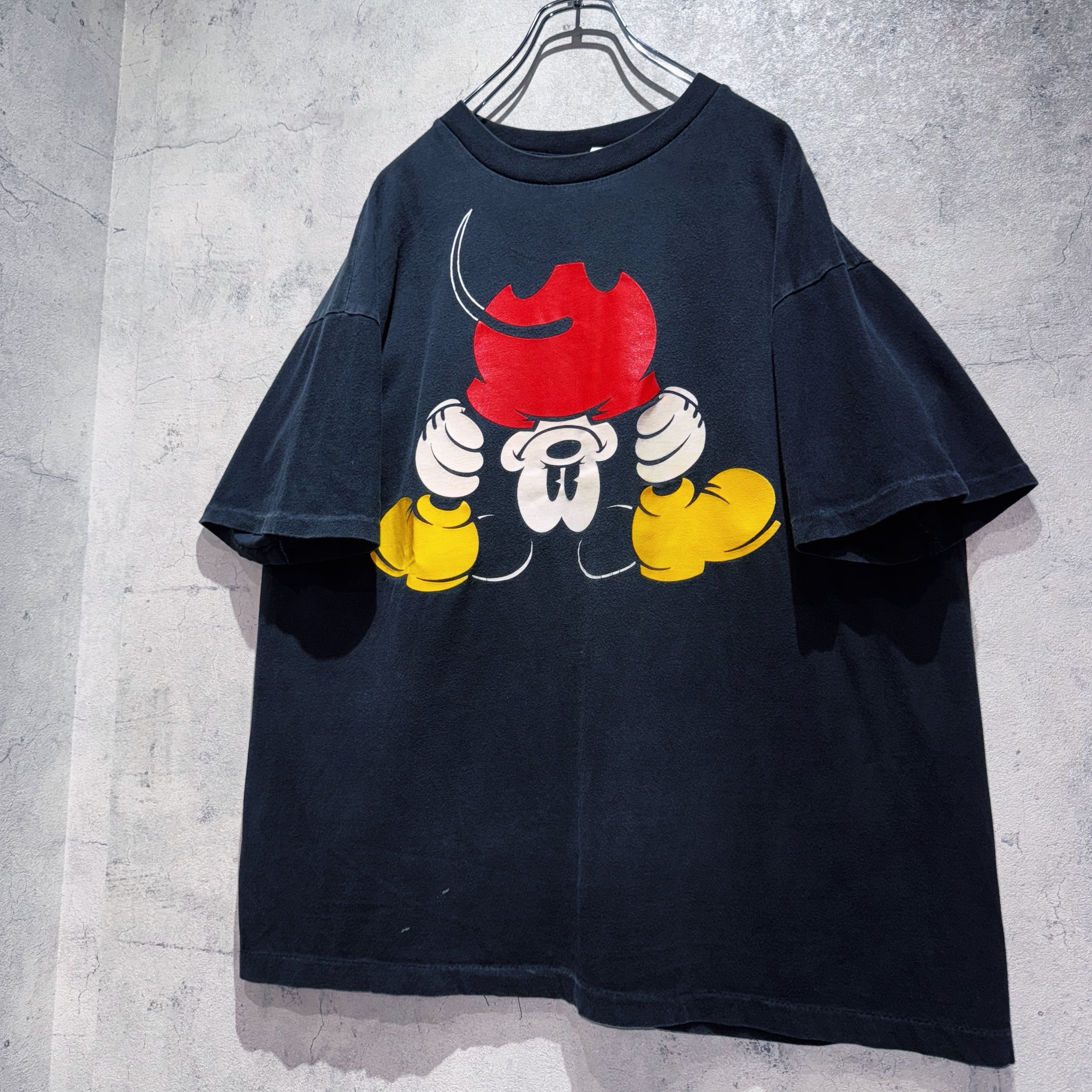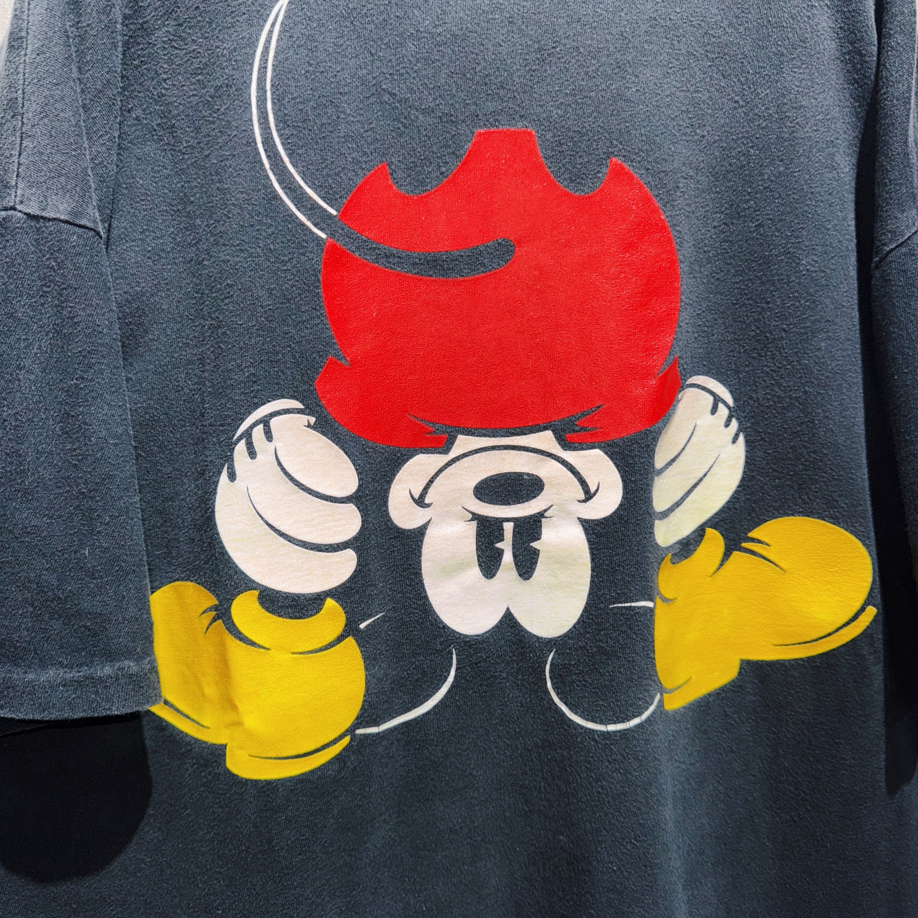 ミッキーが自分の股を通してこちらを変な体型でこちらを覗いてる愛おしいデザイン。ブラックボディに加えルーズなサイジングで一枚で活躍してくれるかと。