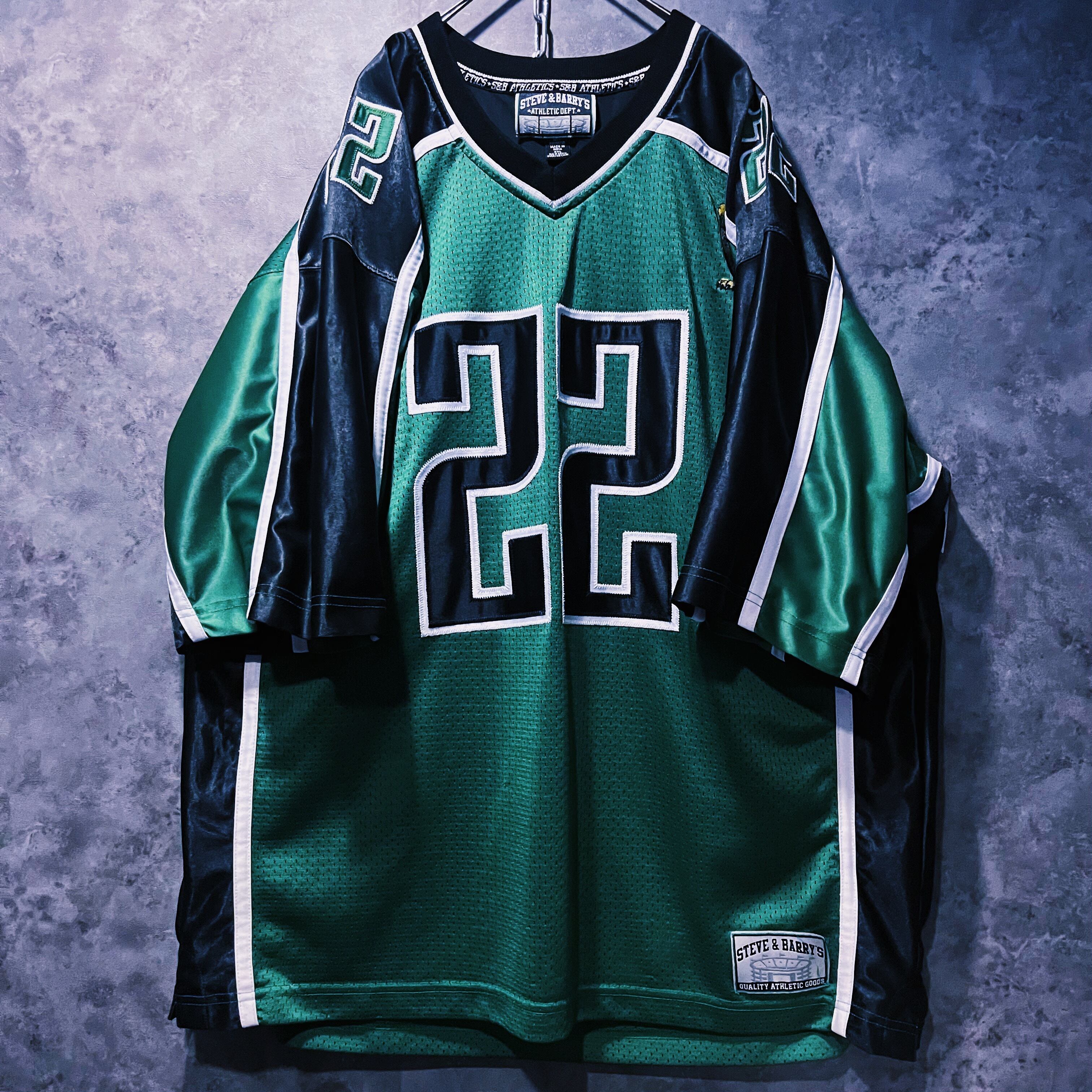 圧倒的な光沢感のあるグリーンをメインカラーで両サイドとバックにデカデカとNo.22の背番号付き。圧倒的なストリート感のある1着。