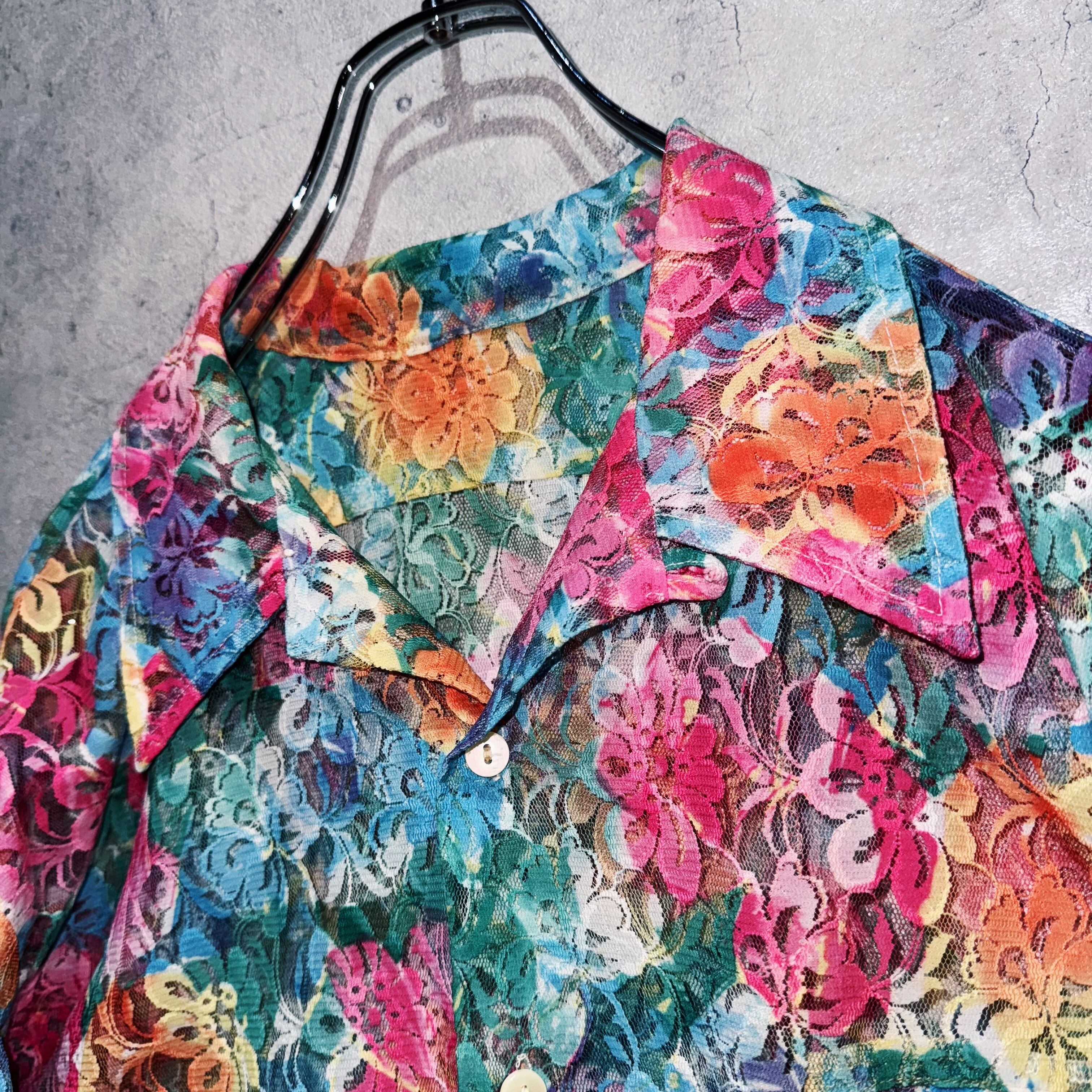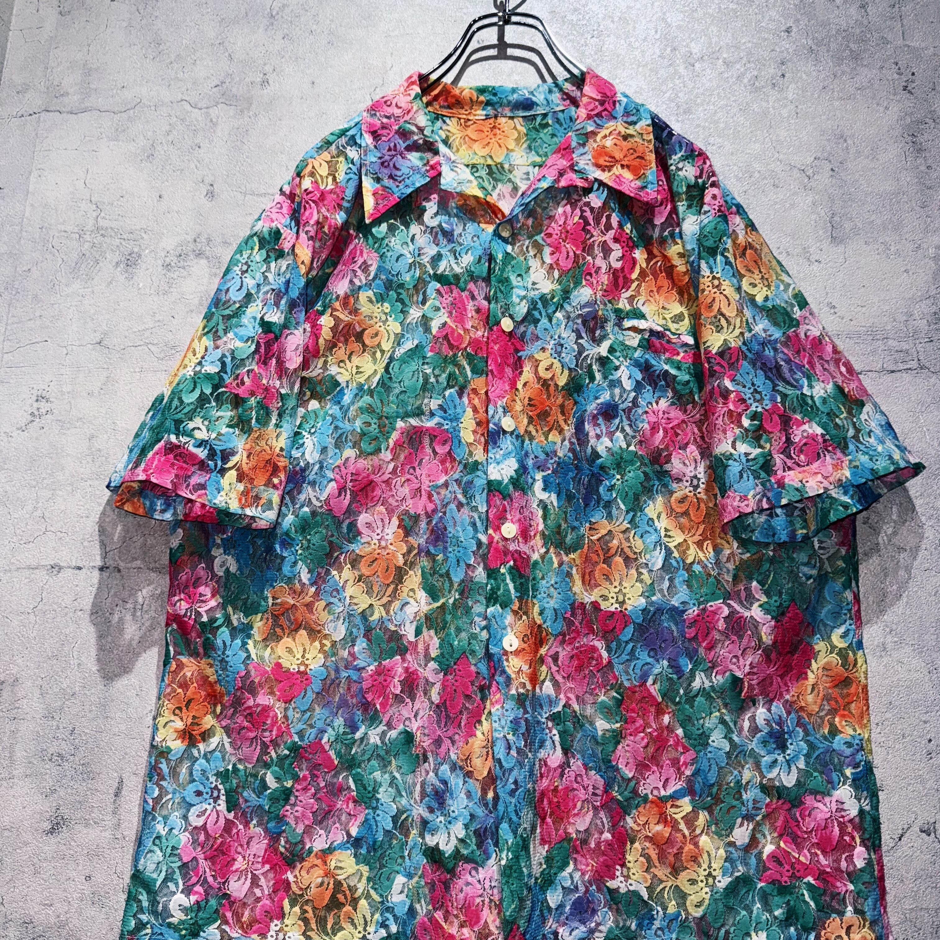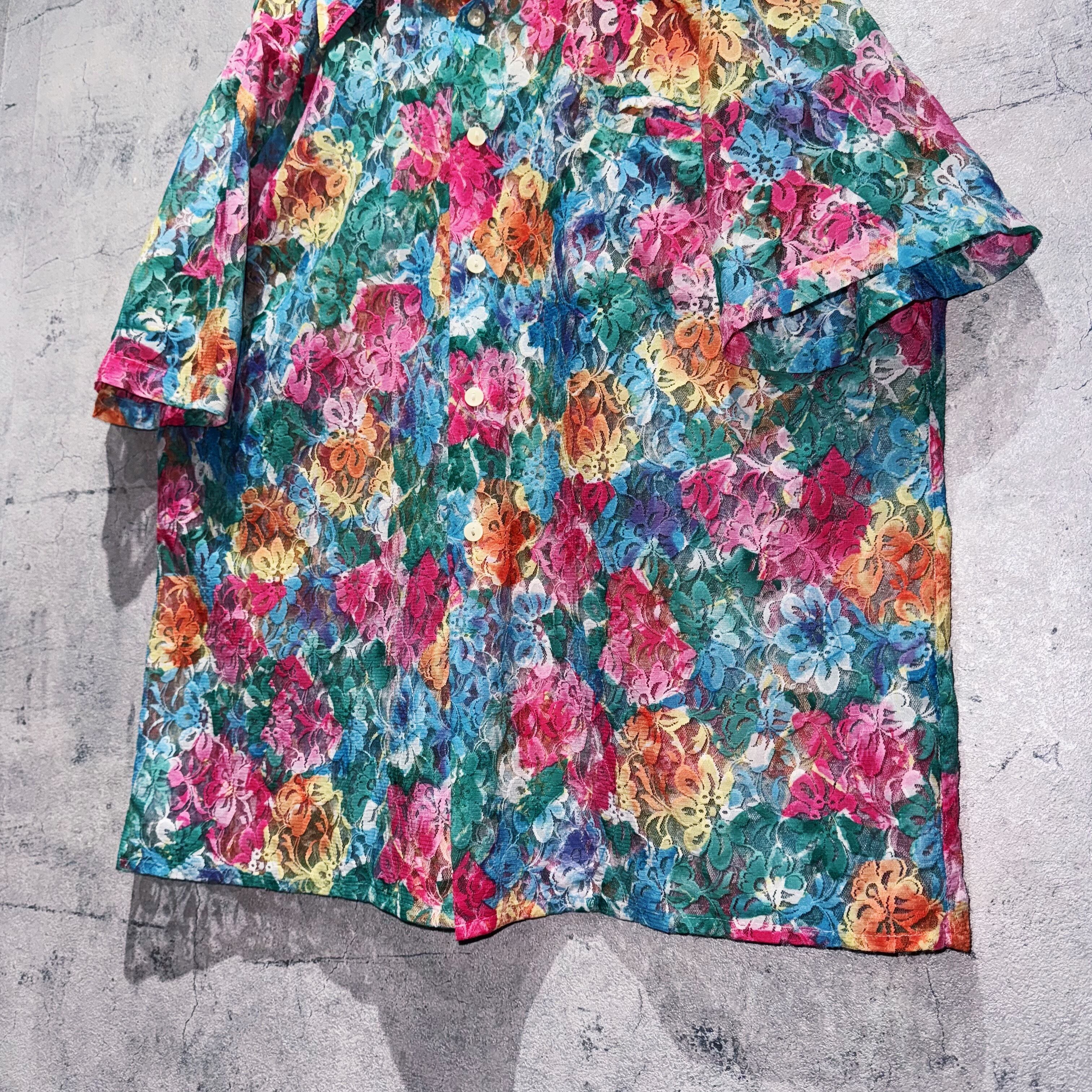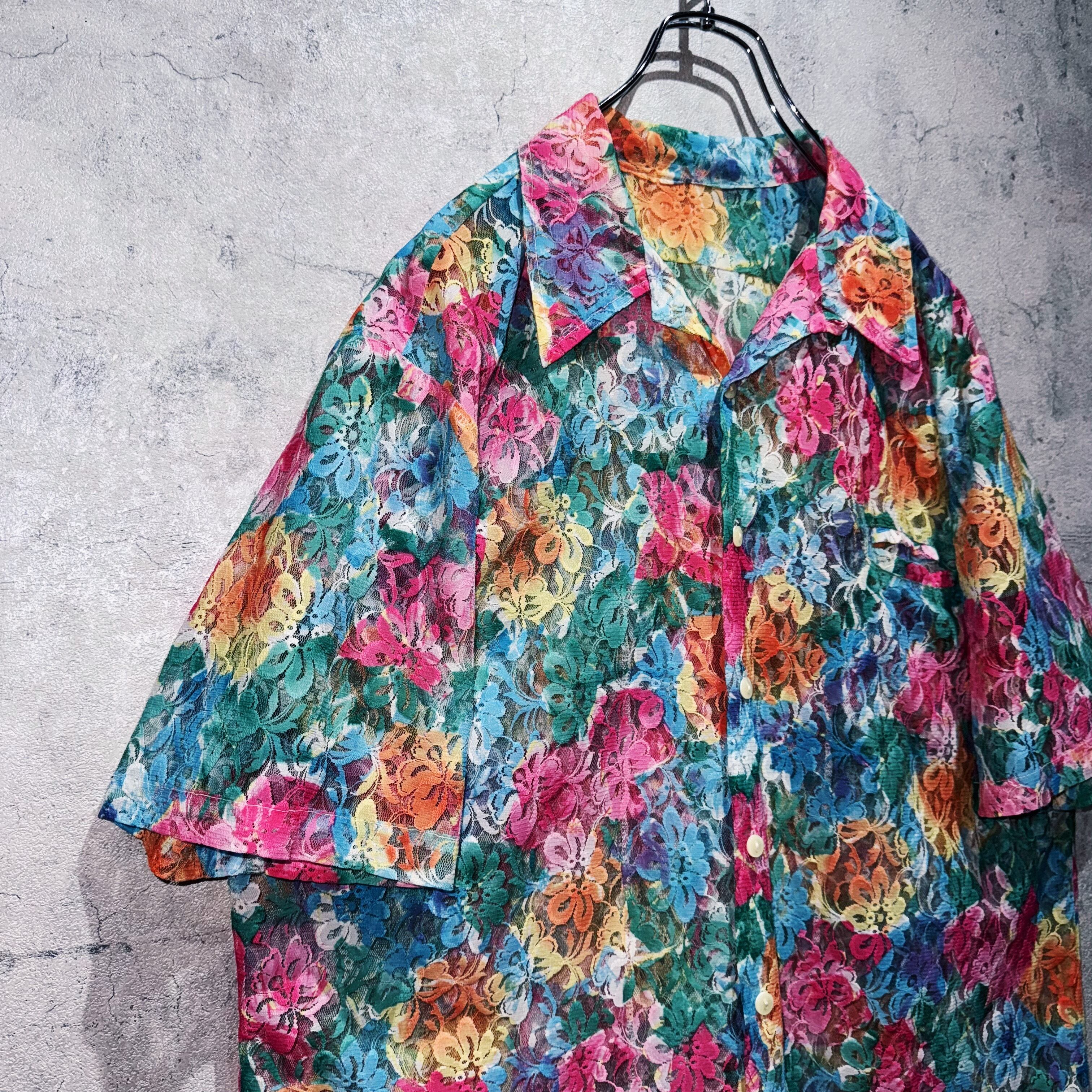 ビューティフルカラーリングフラワーパターンデザインショートスリーブシアーシャツ