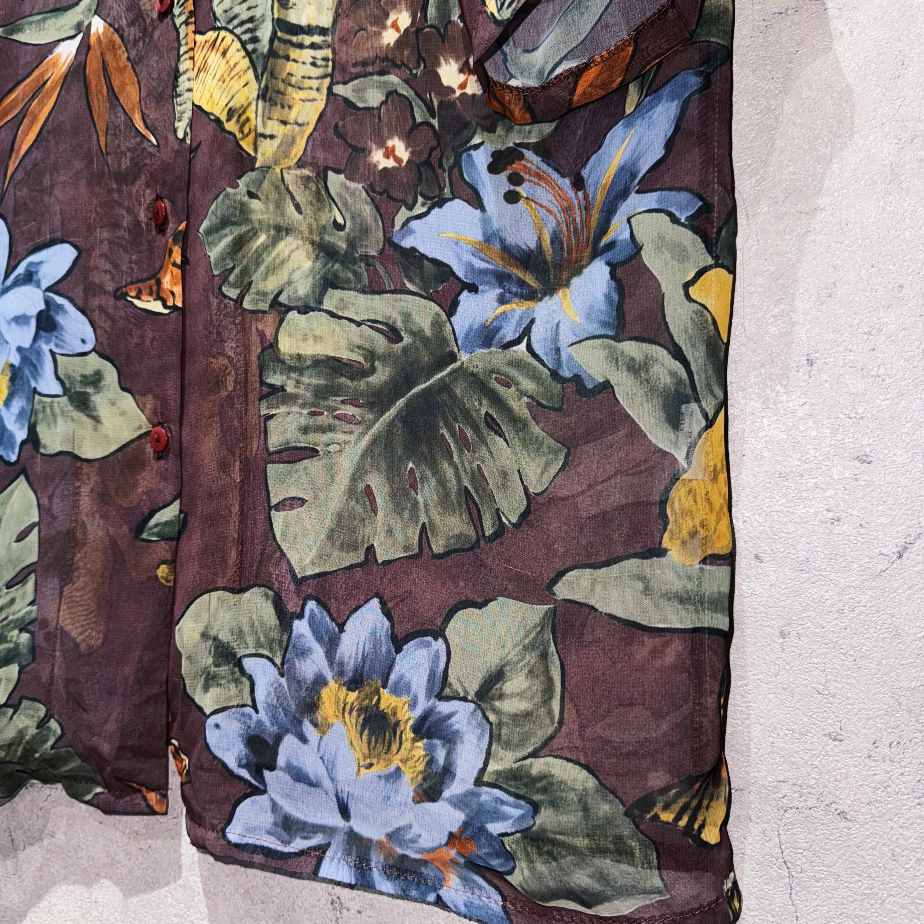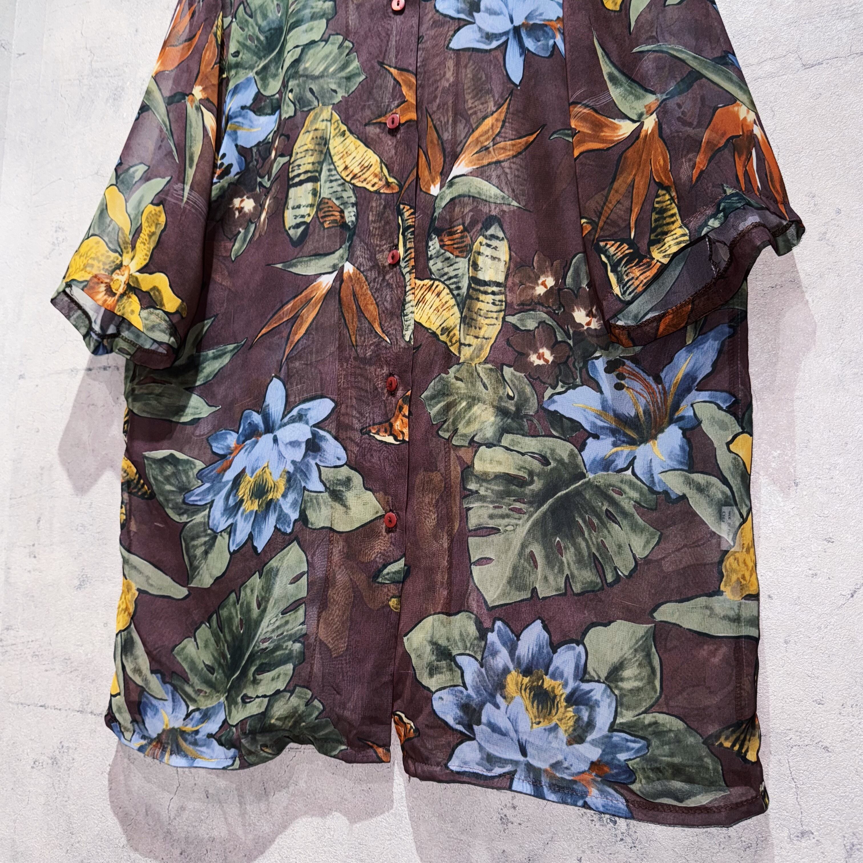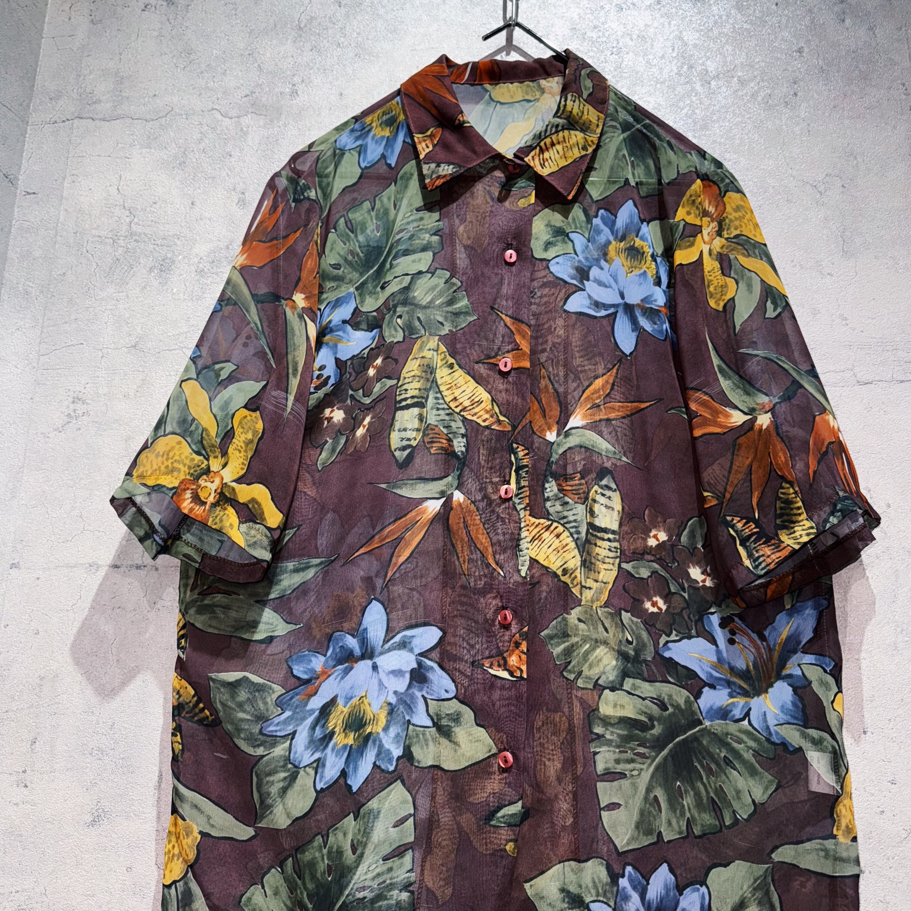 ヴィンテージアートグラフィックフラワーパターンショートスリーブシアーシャツ