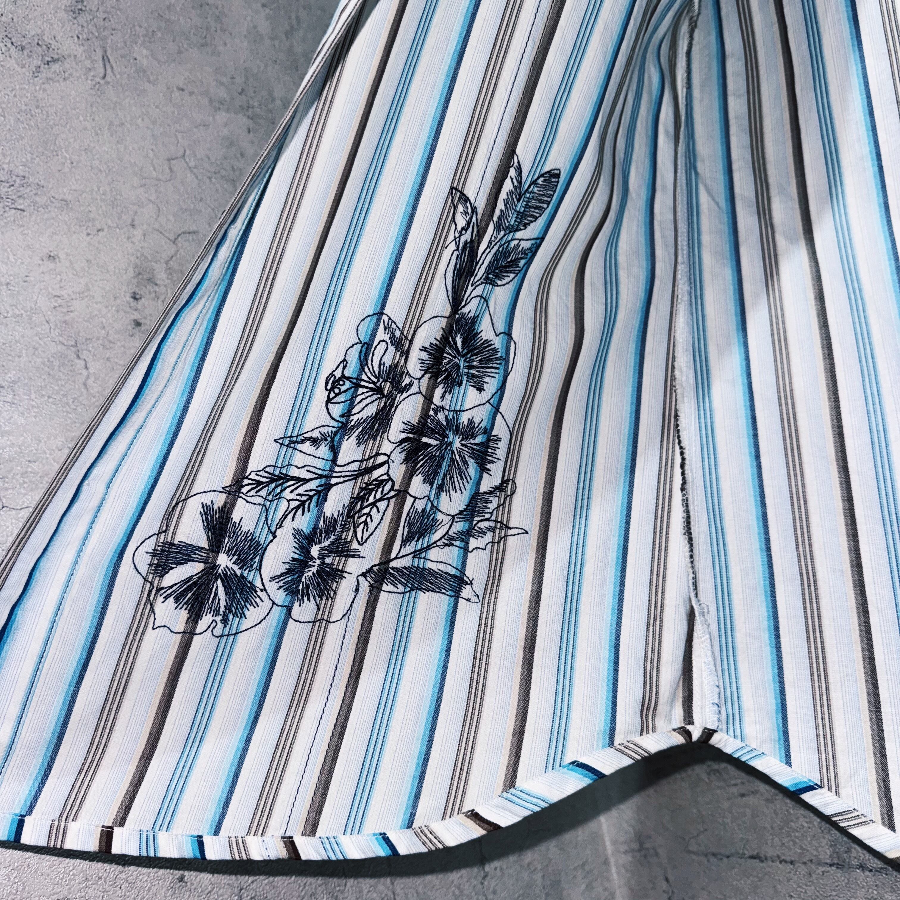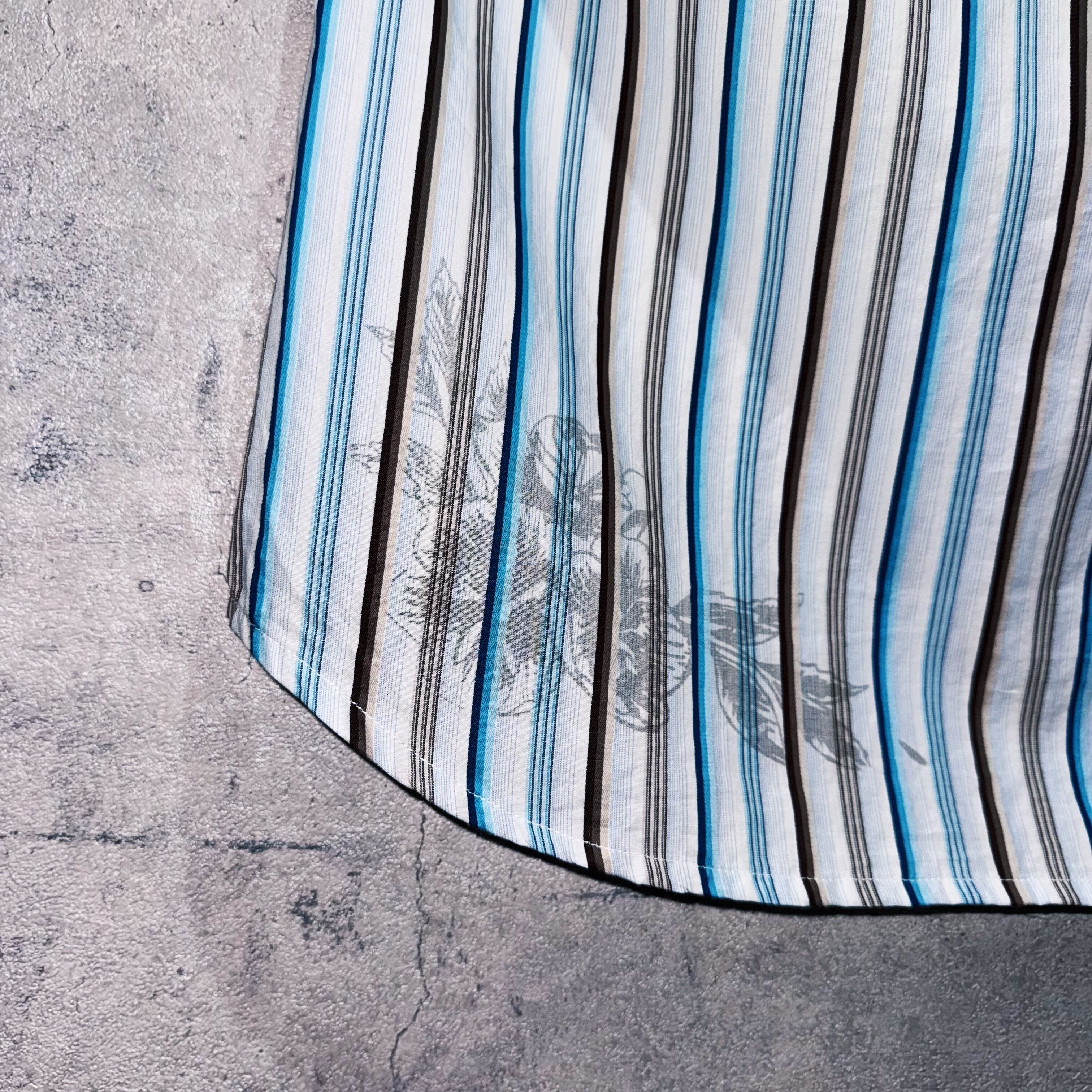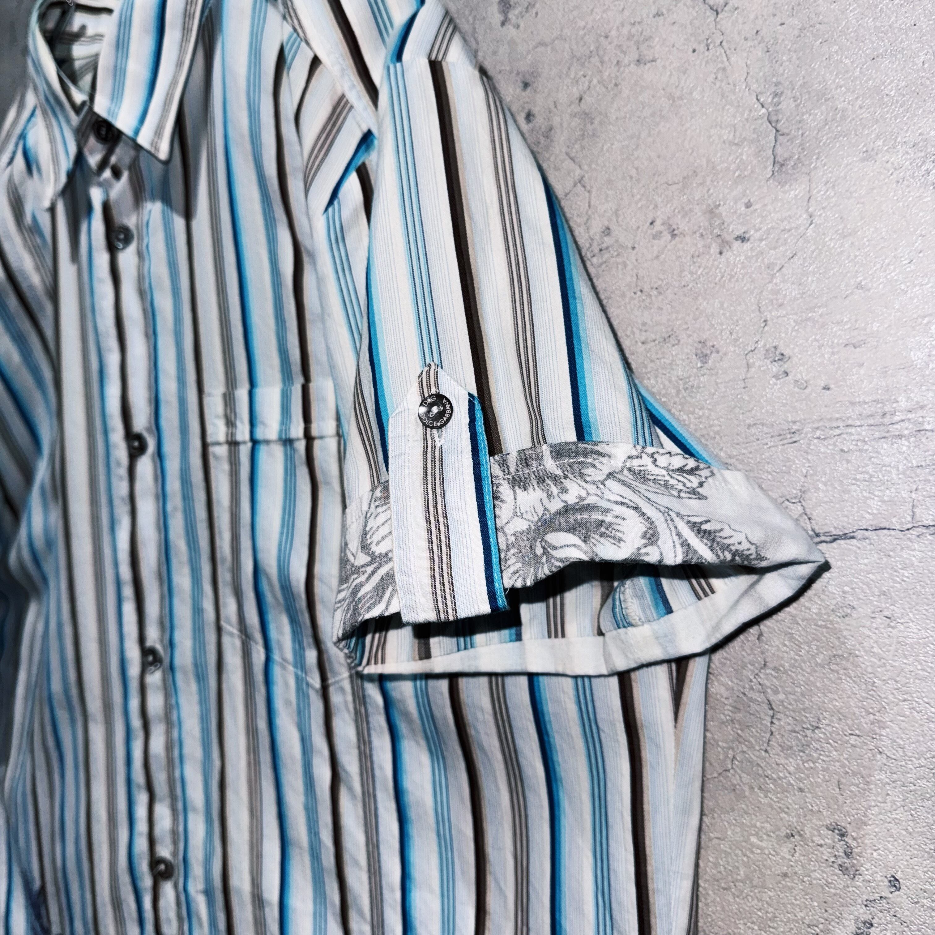 ボディ全体にクラシカルなストライプを載せた色合いも素晴らしい高級感のあるシャツ。アロハテイストの花柄を裏地にあしらったハイブランドの余裕感じるデザイン。