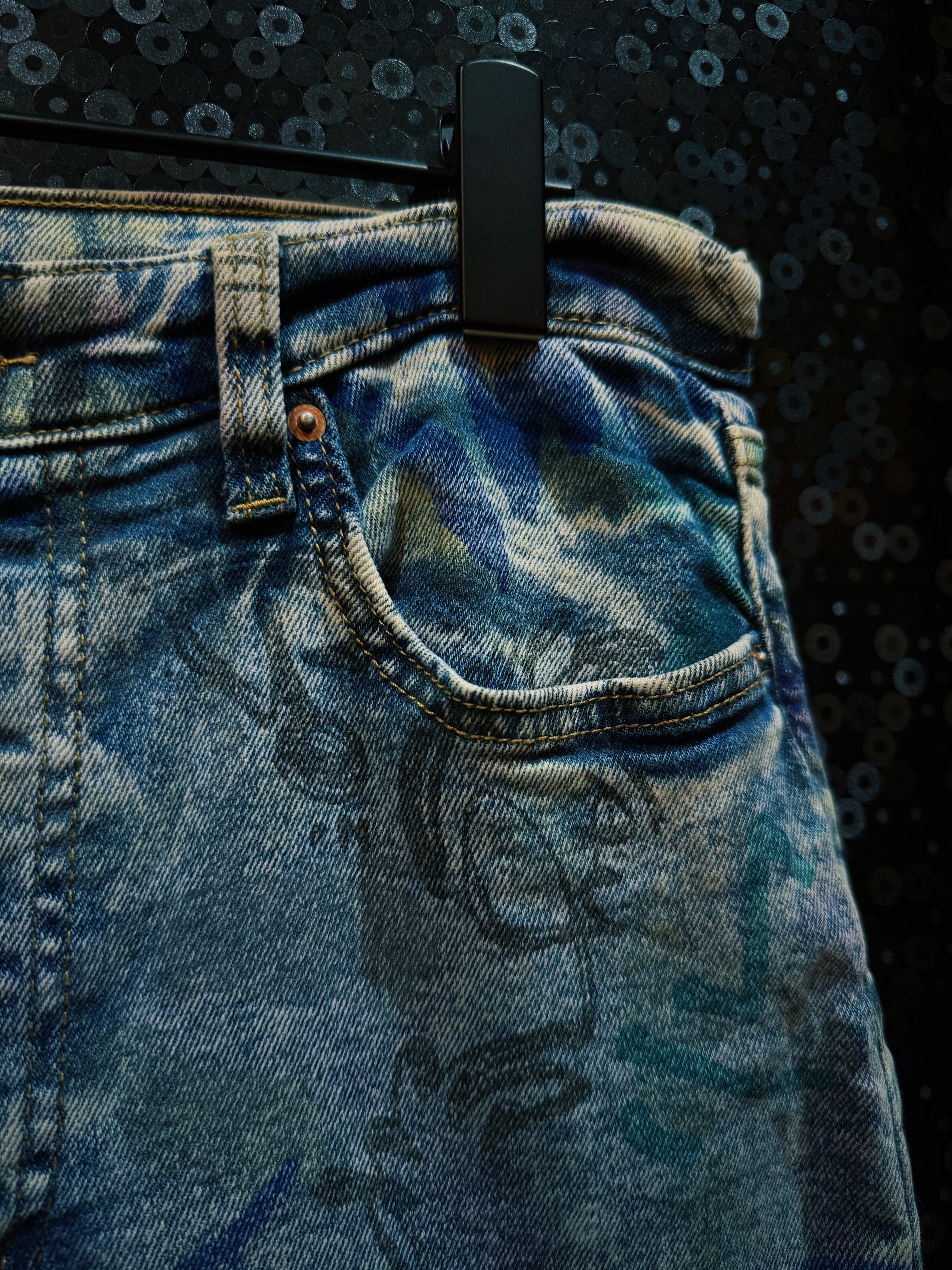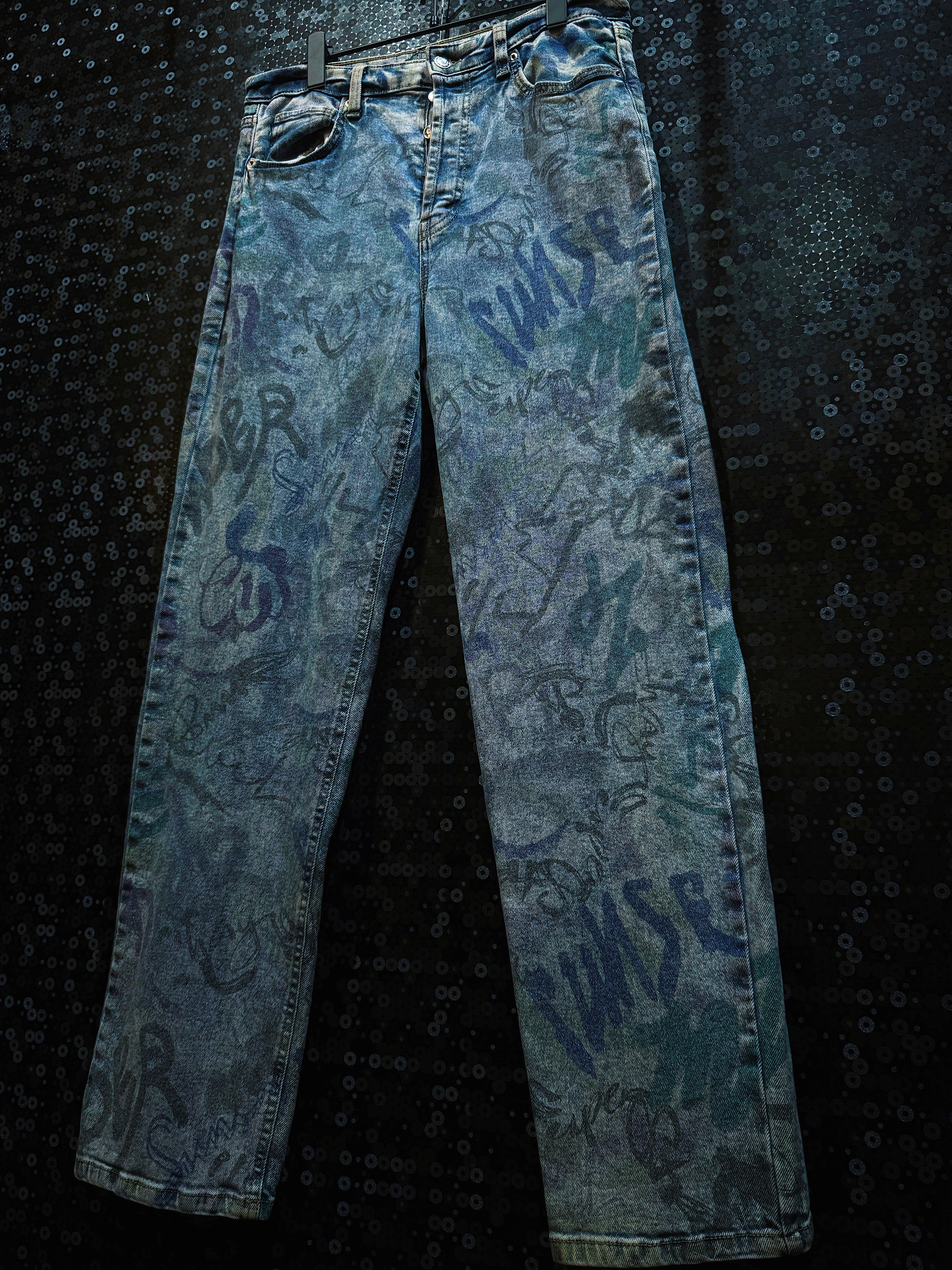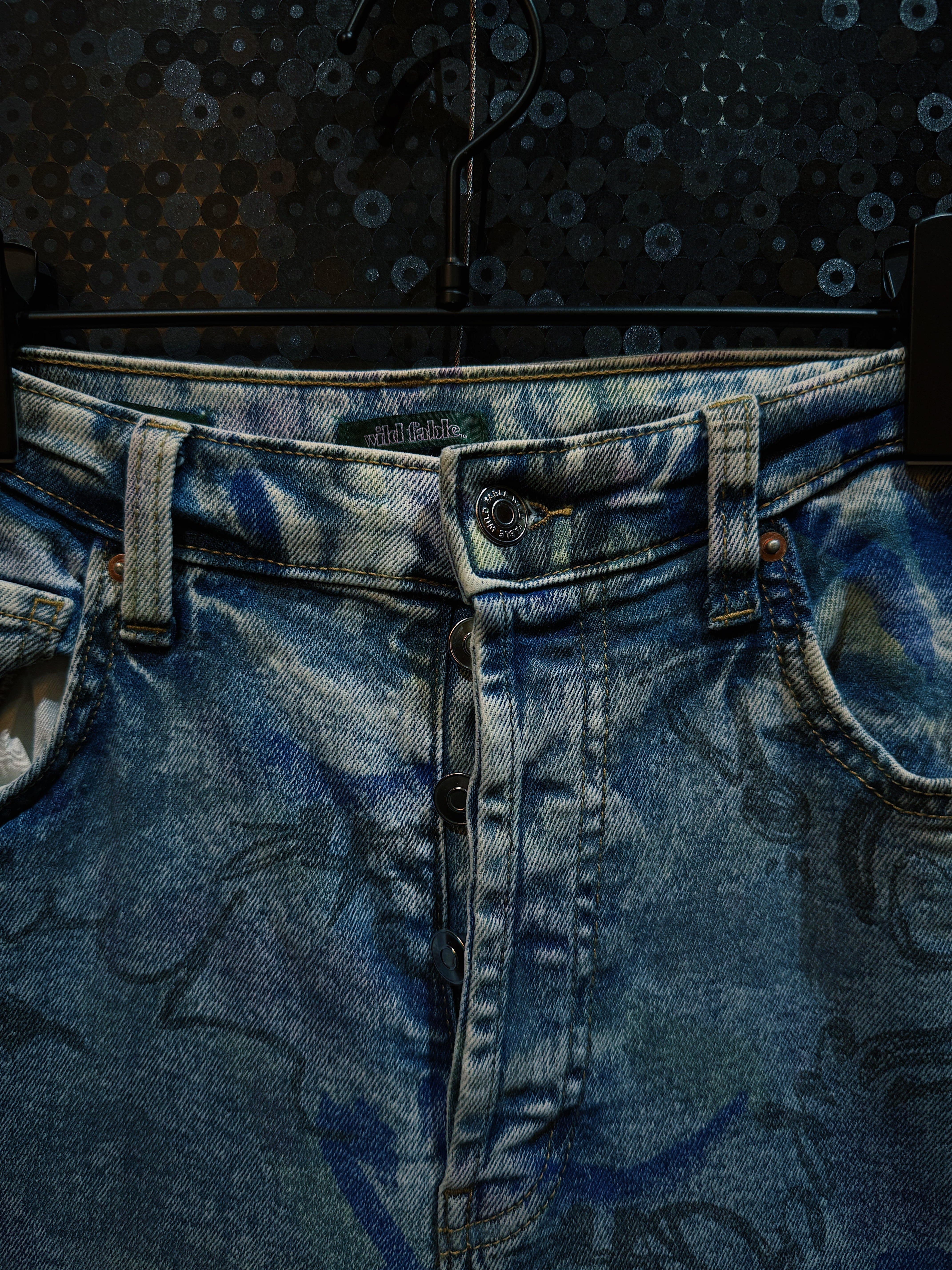 Wild Fableが手掛けるこのデニムパンツは、90年代のグラフィティカルチャーのような総柄プリントが特徴。