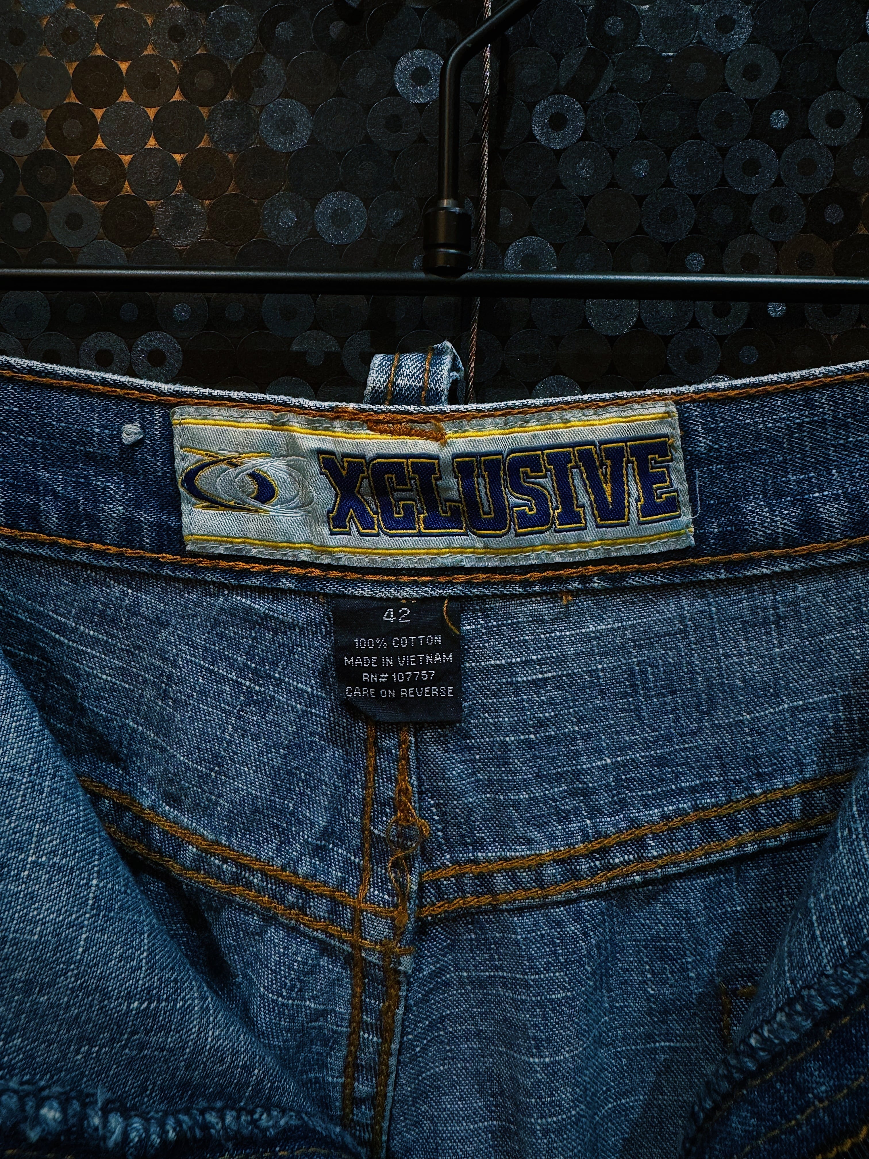 ブランドのXCLUSIVEは、2000年代初頭のヒップホップカルチャーやストリートウェアの影響を強く受けたデザインを特徴としており、ルーズ&ワイドシルエットのデニムを多く展開していた。このパンツもまさにそのテイストを踏襲しており、当時のバギーデニムブームを感じさせるオーラを放つ。