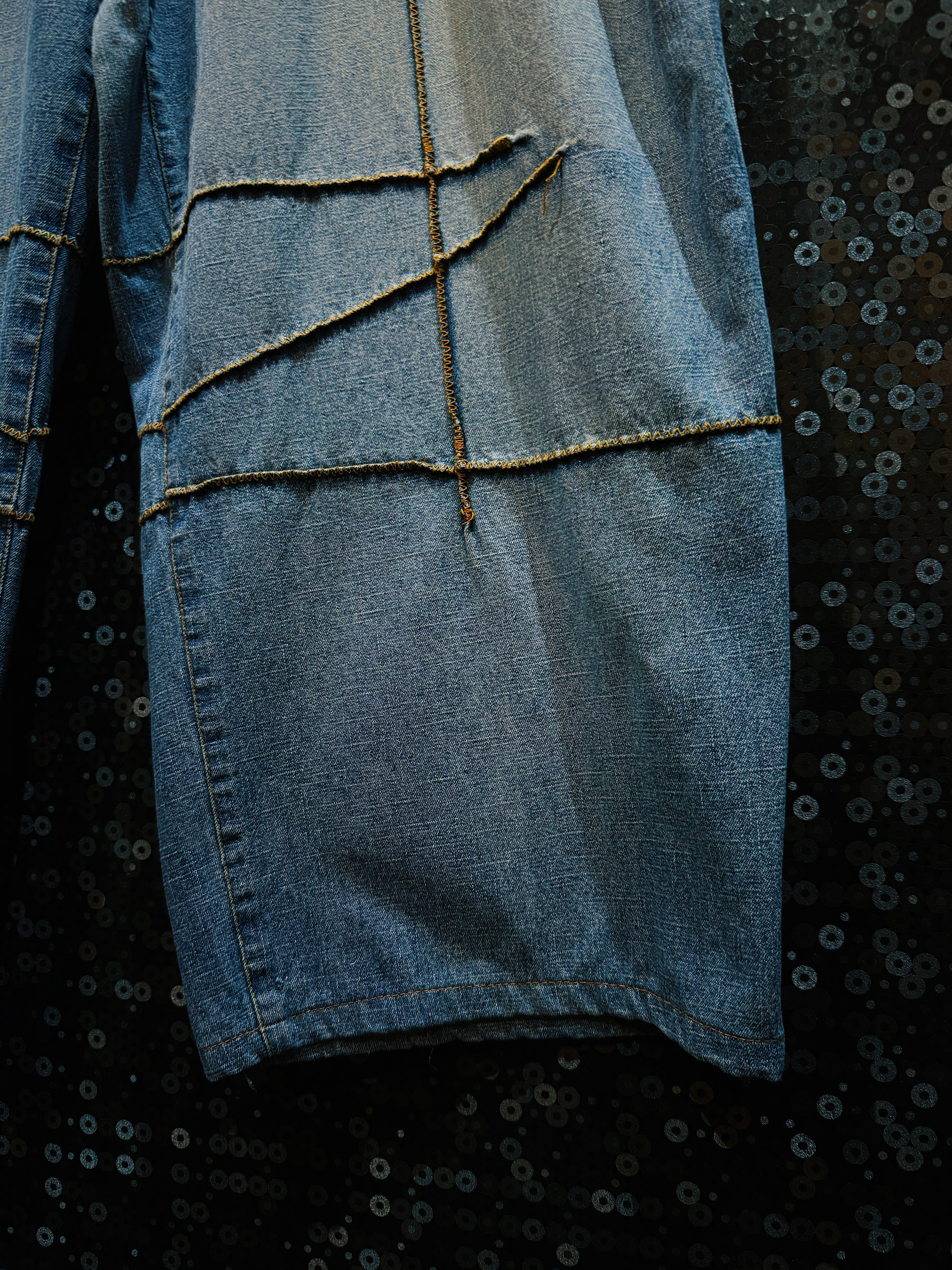 ワイドシルエットをベースに、フロントから裾にかけて斜めに走るカットオフ風のステッチラインが立体感を生み出していて、アーティスティックな解体リメイクのような雰囲気を持っている。生地は100%コットンで、適度な厚みと柔らかい色落ち感がヴィンテージライクな風合いを際立たせている。