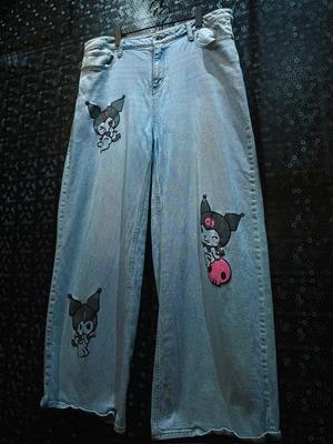 サンリオの人気キャラクター「クロミ」を大胆にペイントしたカスタムデニムパンツ。ライトブルーのデニムをベースに、クロミがドーナツやドクロボールと一緒に描かれたポップなデザインが印象的。