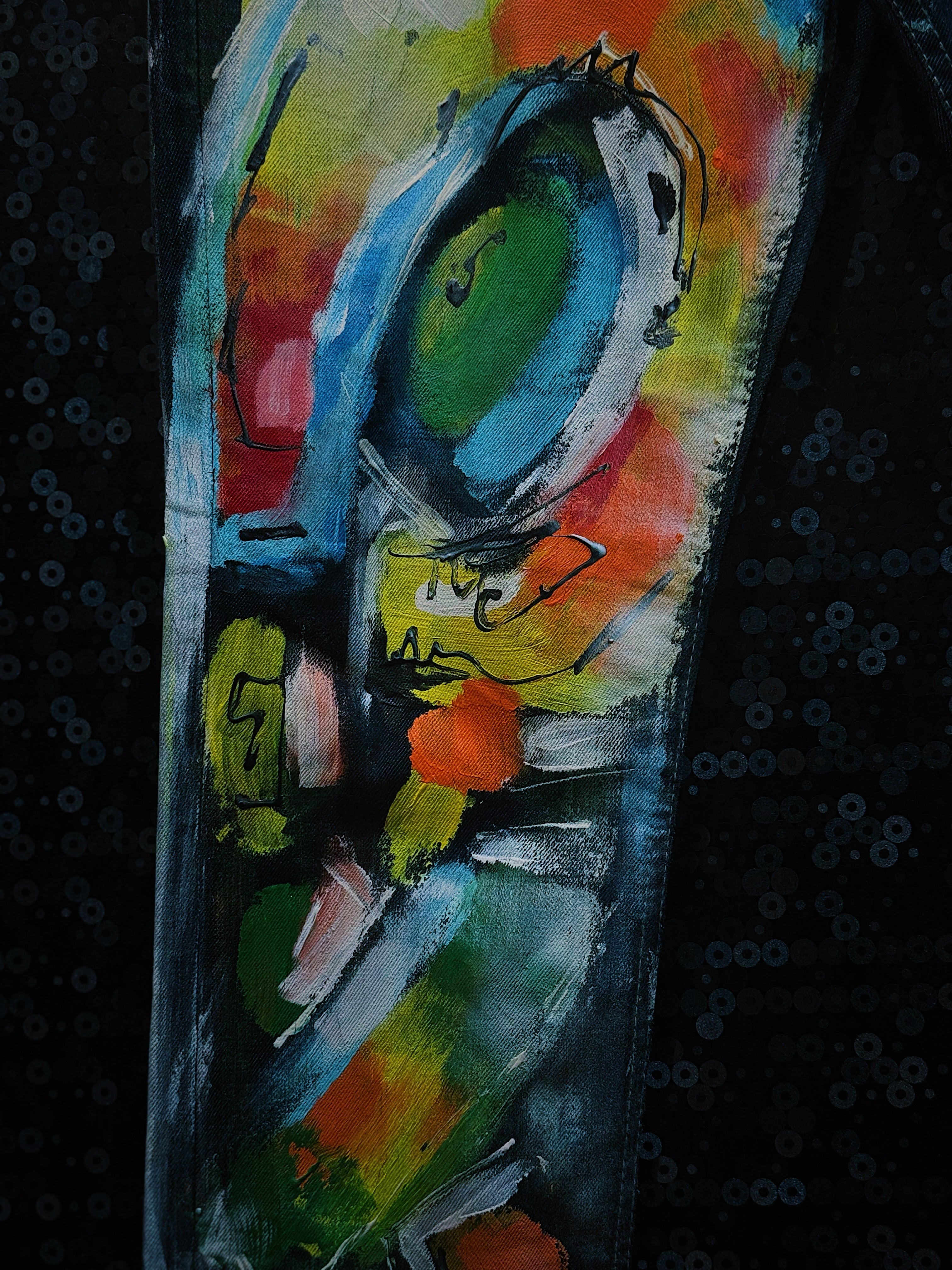 全体に激しい筆跡と色彩をぶつけた、唯一無二のアートデニムパンツ。赤・黄・緑・青などの原色を無造作に塗り重ねたデザインは、ストリートとアートの中間をいく存在感を放つ。