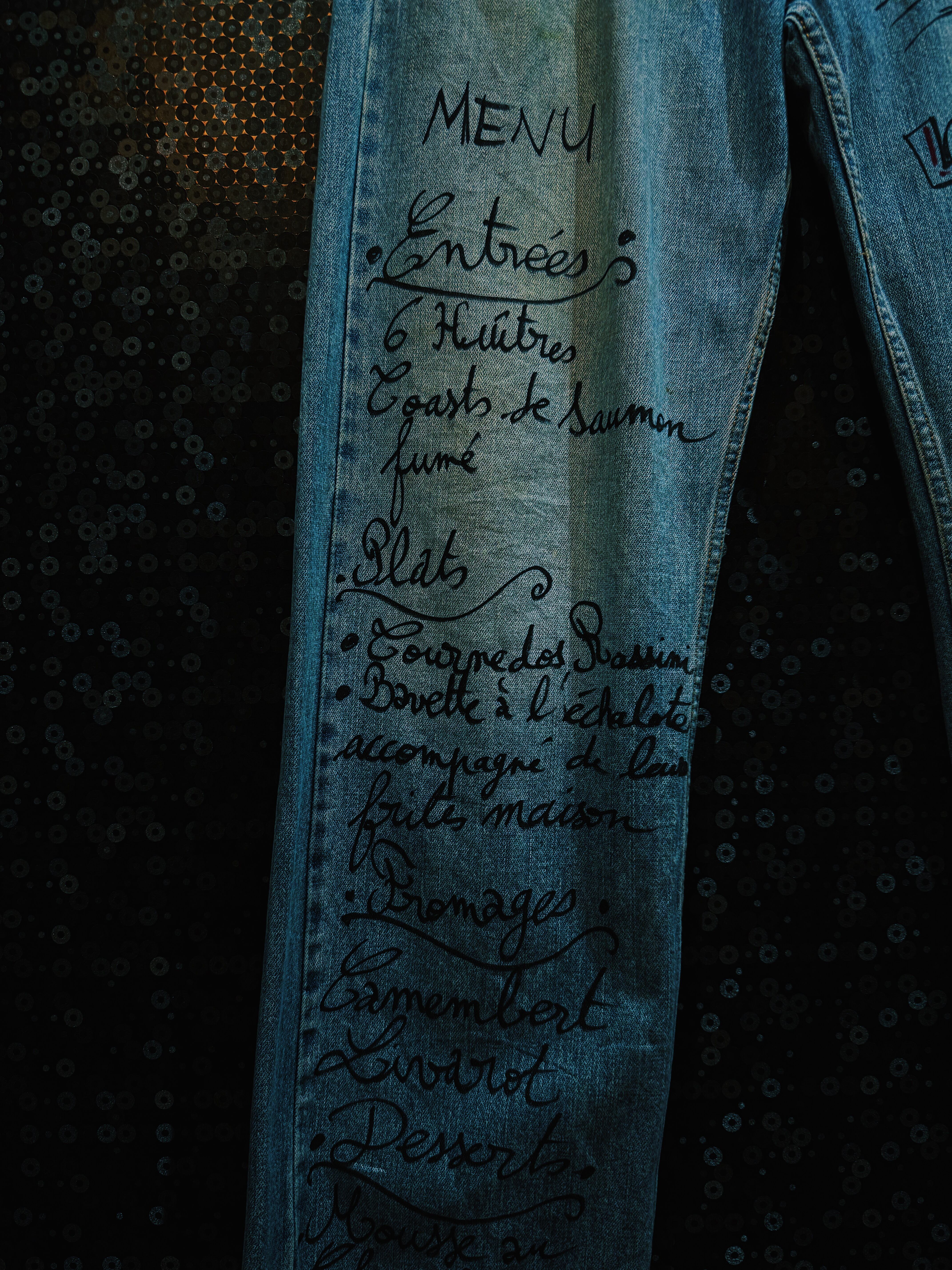 左脚にはフランス語のメニュー調のタイポグラフィがハンドペイントされ、アートピースのような独特の個性を放つ一着。