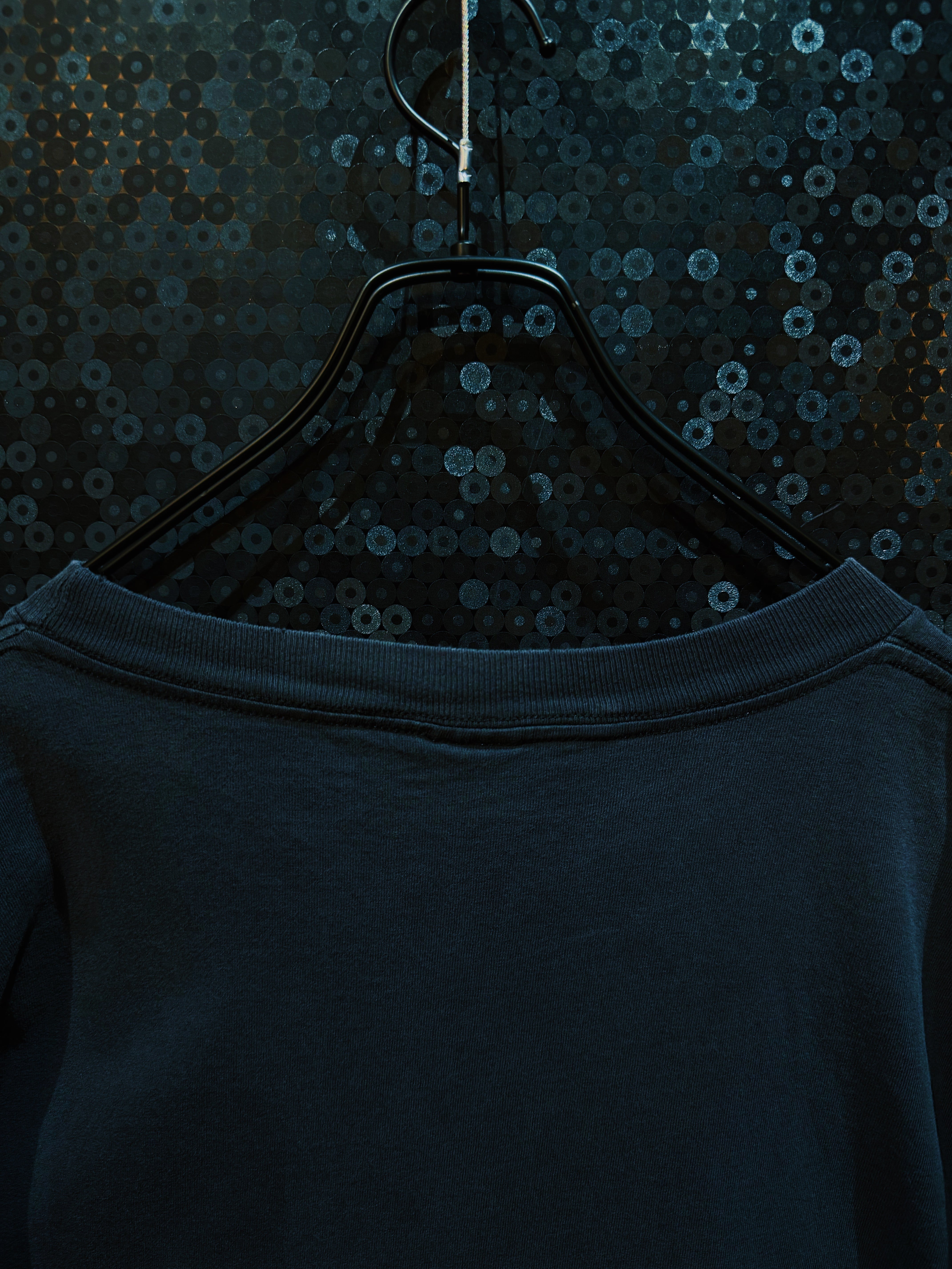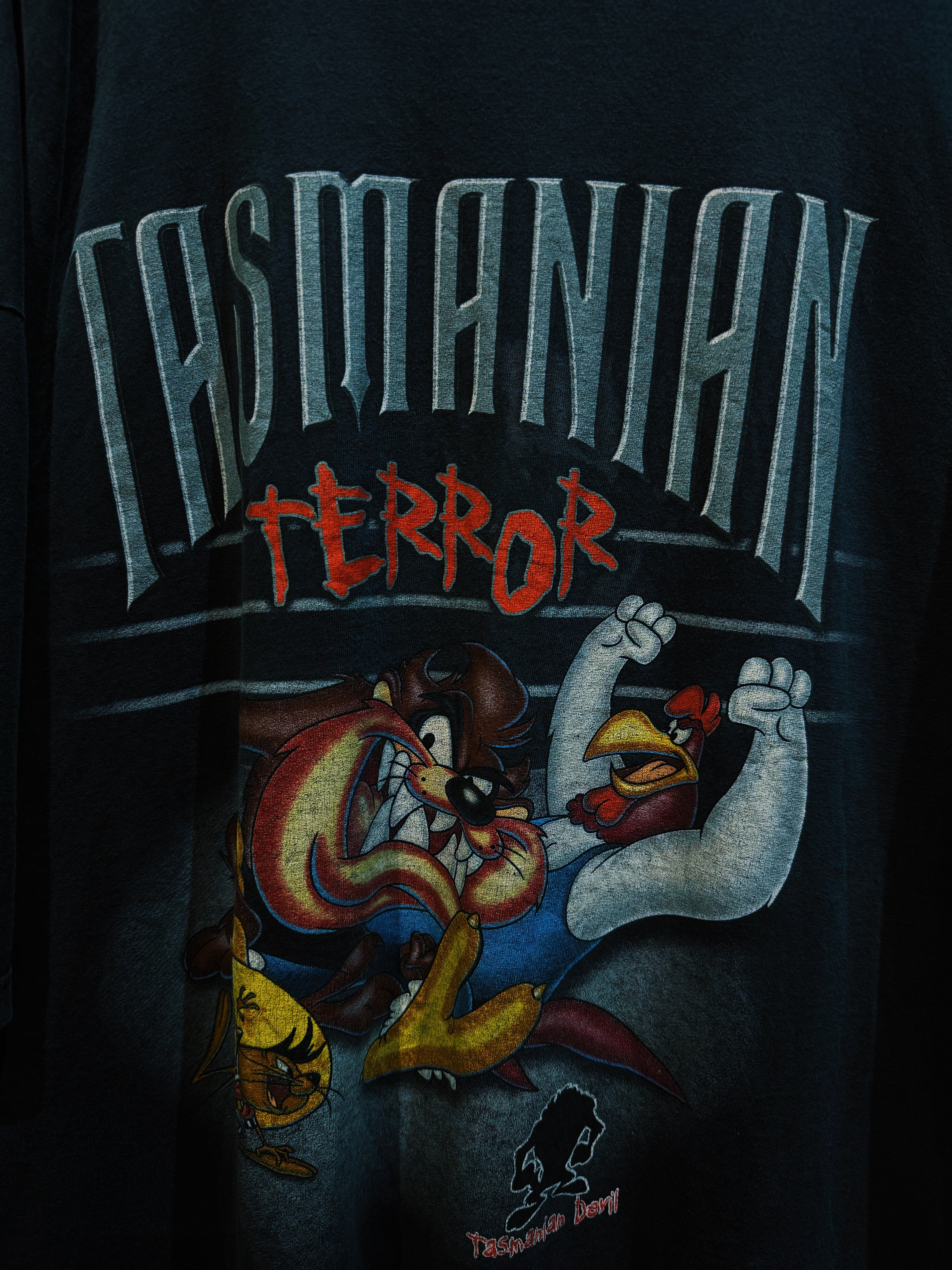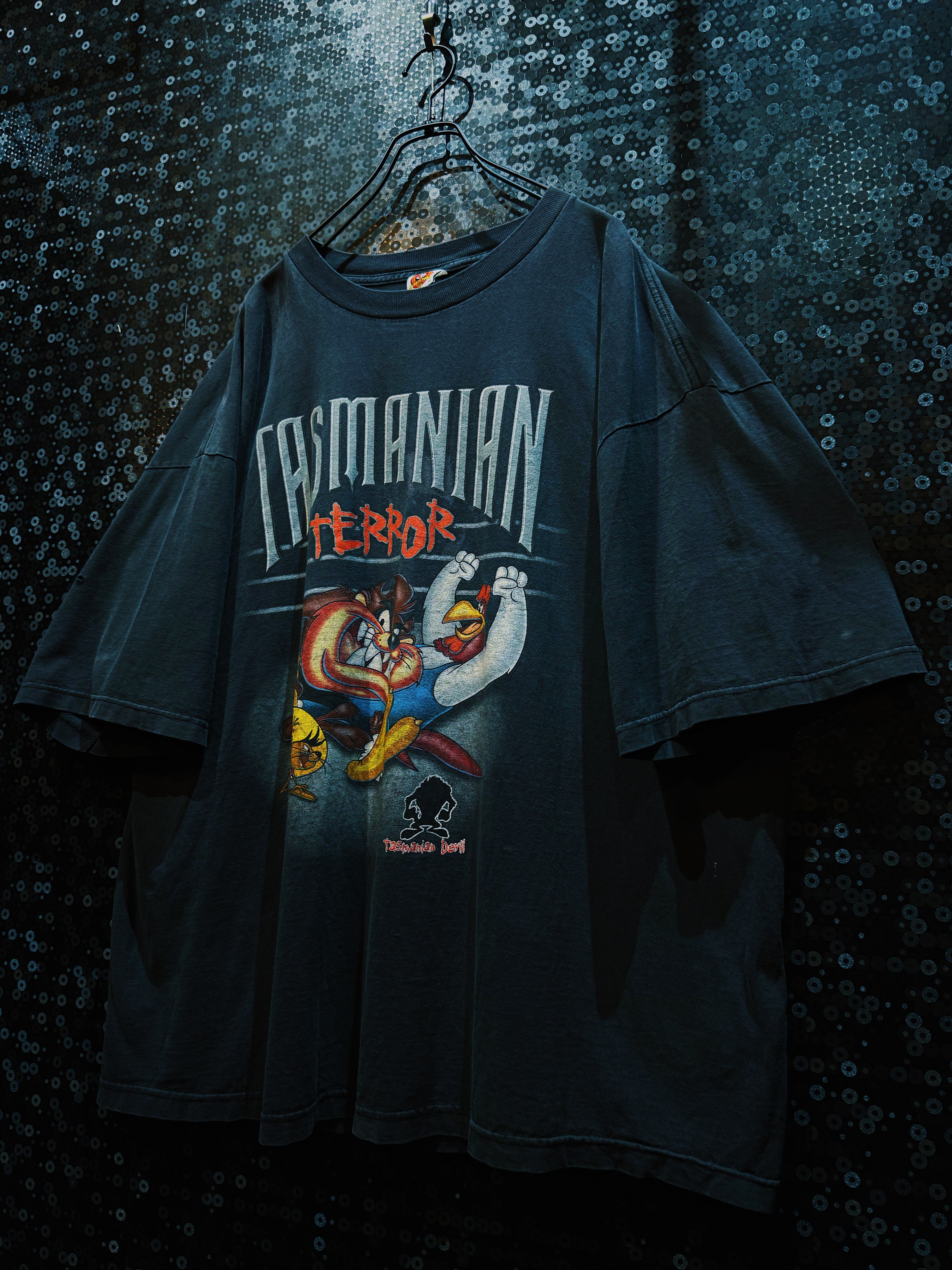「TASMANIAN TERROR」の文字がプリントされ、タズが得意のスピンと破天荒なエネルギーで仲間たちと絡むユーモラスなイラストが描かれていて、ボディはヴィンテージ特有の色褪せ感を持つブラックで、ロゴやキャラクターの発色が逆に際立ち、存在感抜群。