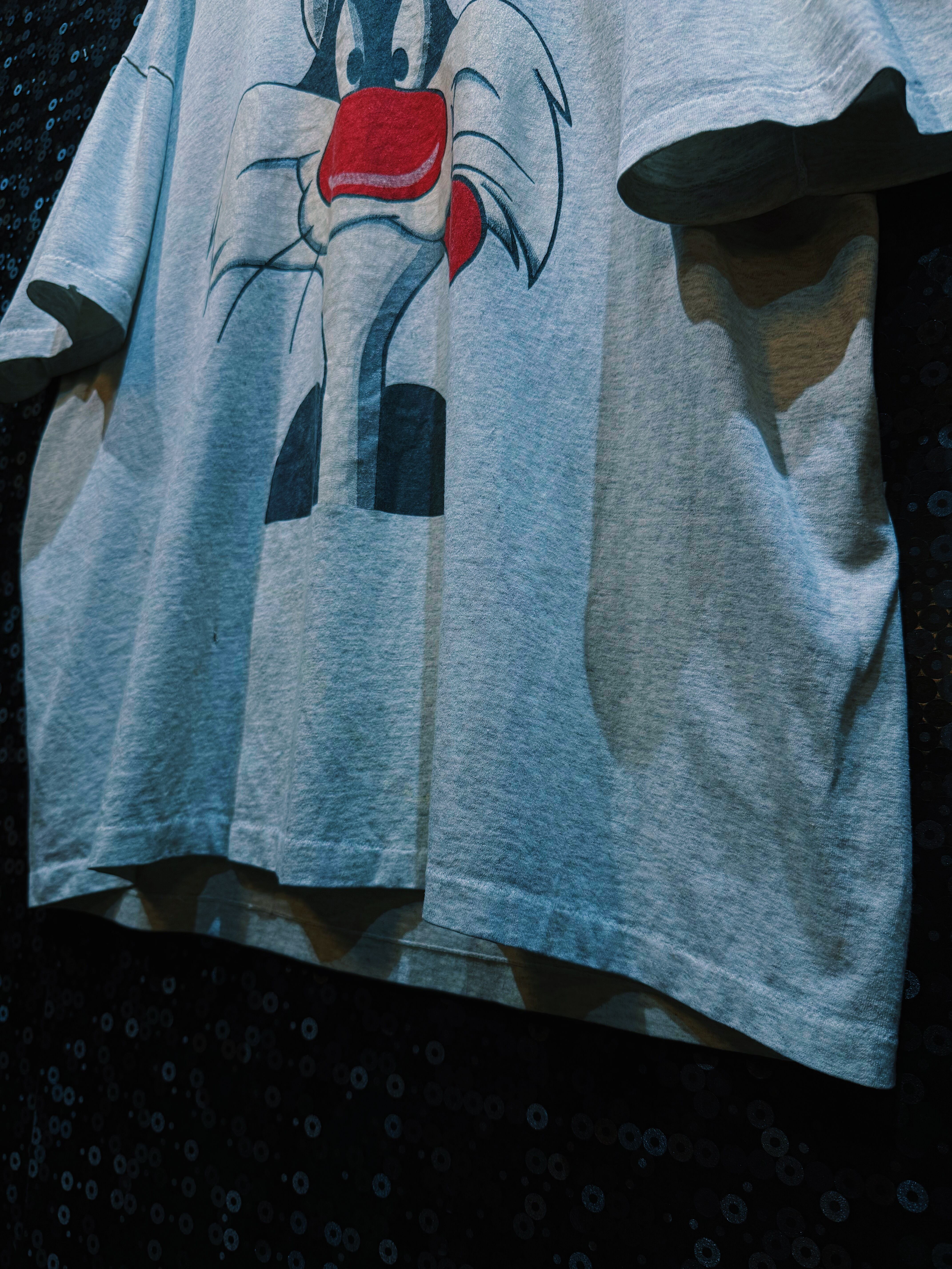 Looney Tunes(ルーニー・テューンズ)でお馴染みの人気キャラクター「シルベスター・キャット(Sylvester the Cat)」が大きくプリントされたユニークな一枚。シンプルなグレーのボディに特徴的な鼻が印象的なキャラクターでもあるシルベスターのデザインがブッ刺さってる逸品。