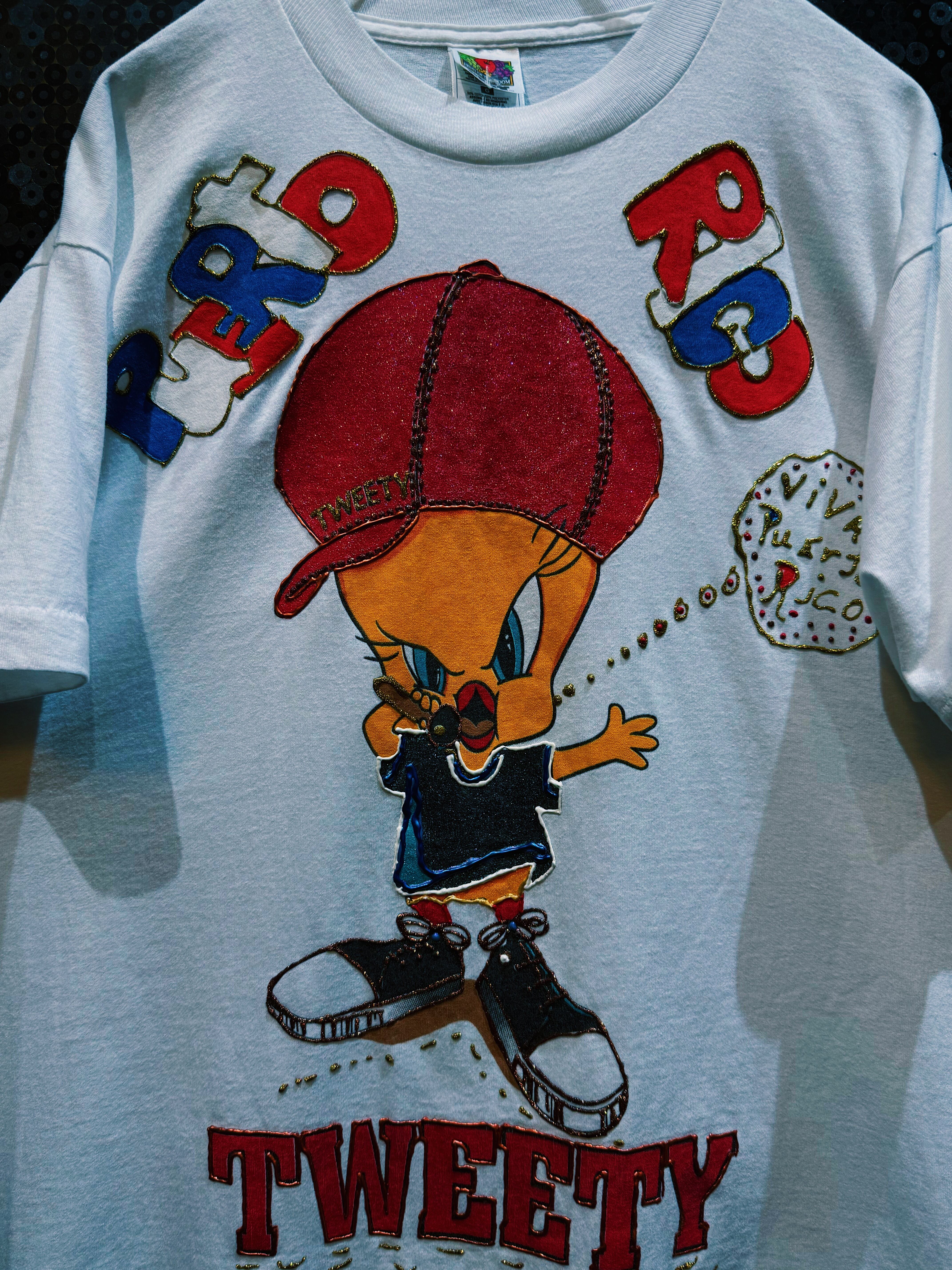 当店で大人気のルーニーチューンズシリーズの一つで、90年代カルチャーの空気をそのまま閉じ込めた、ヒップホップテイスト全開のトゥイーティーTシャツ。