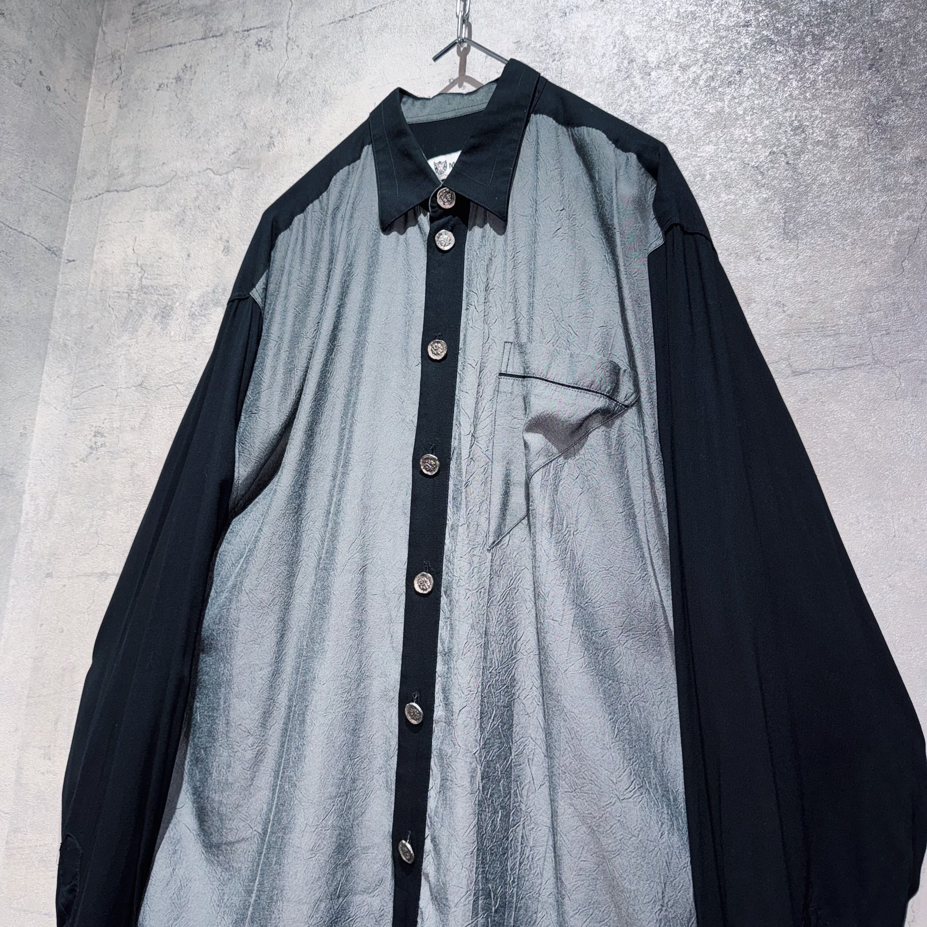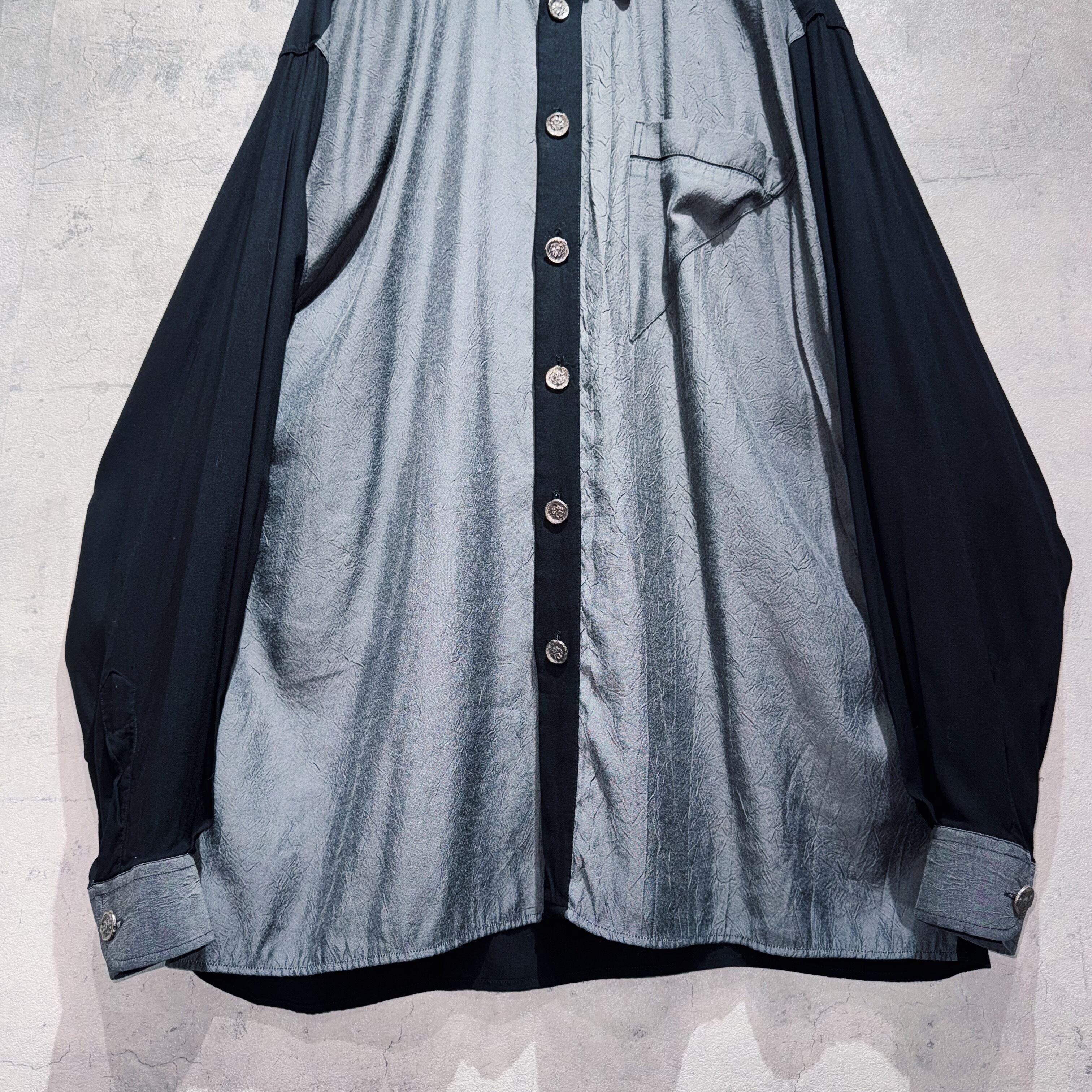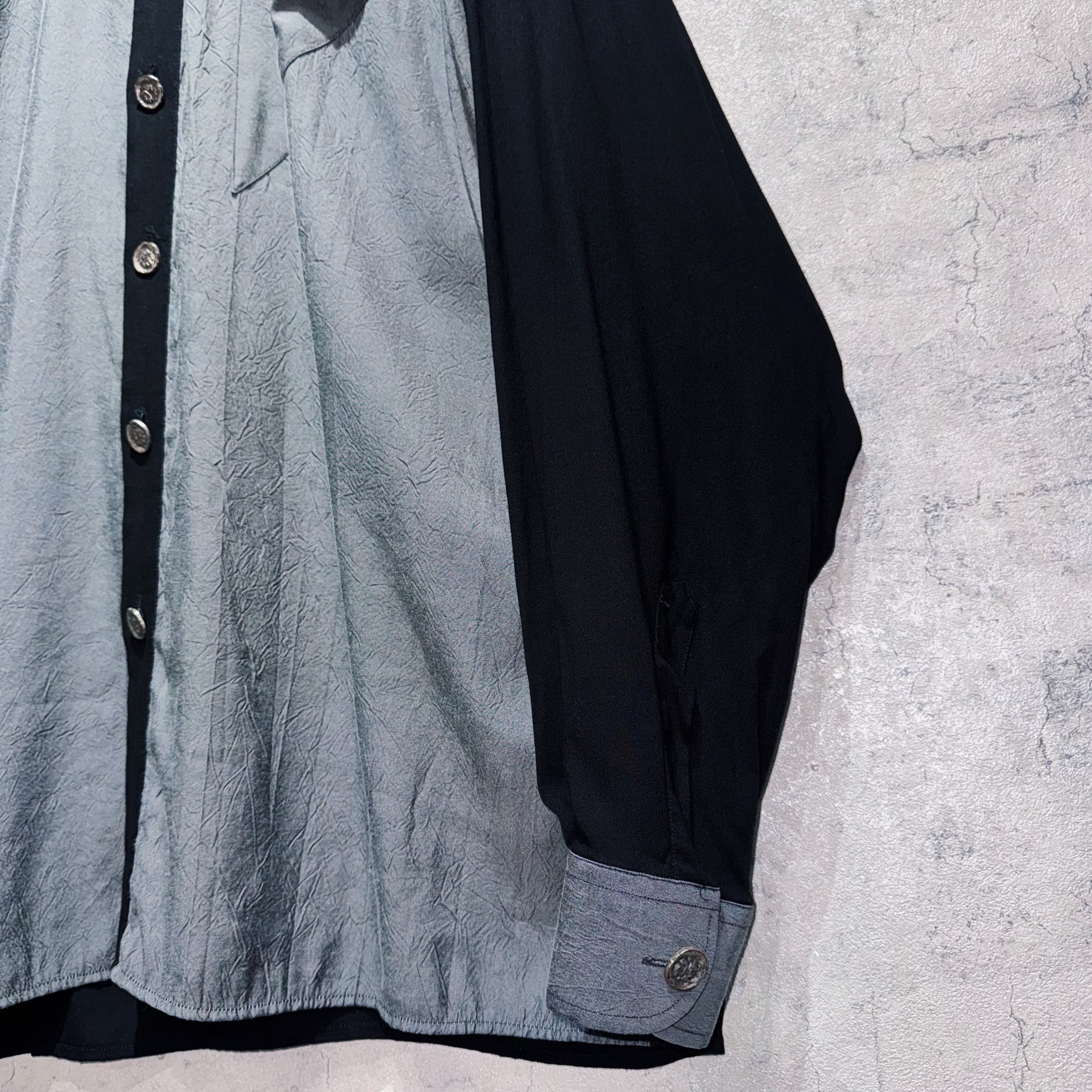 フロントや袖などが異素材にスイッチングしたハイモードな佇まいのデザインシャツ。ブラックと光沢感のあるグレーのスイッチングは高級感を演出しています。