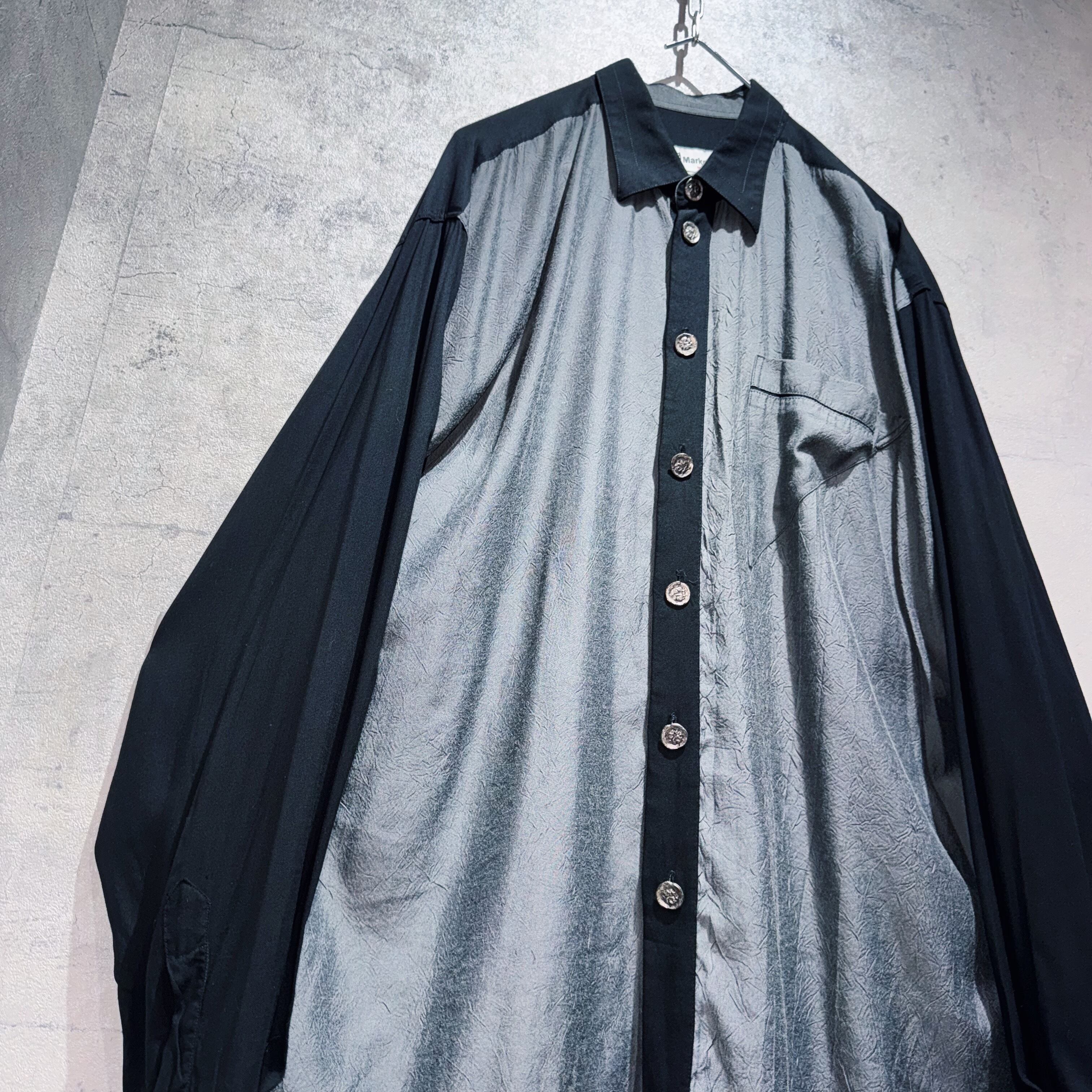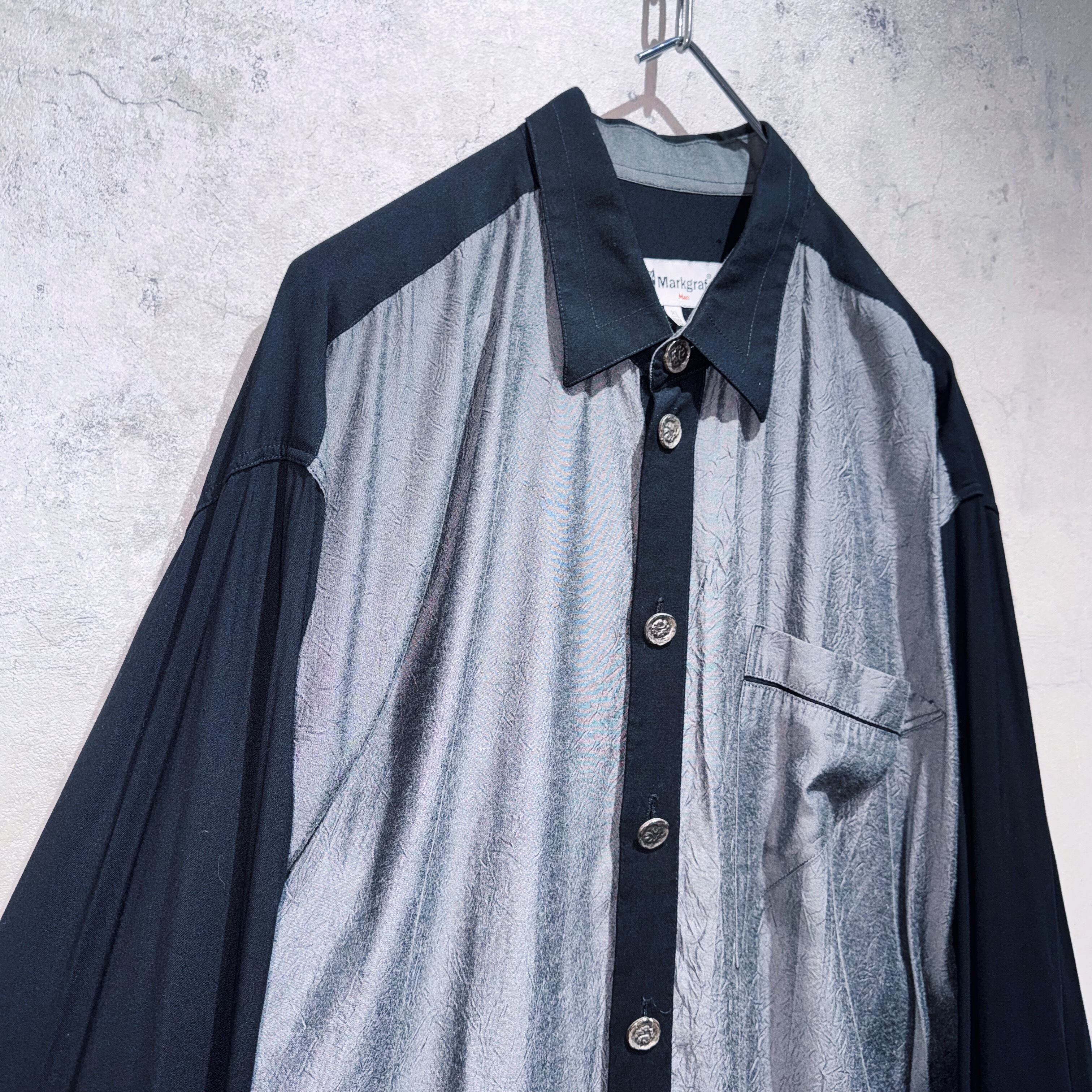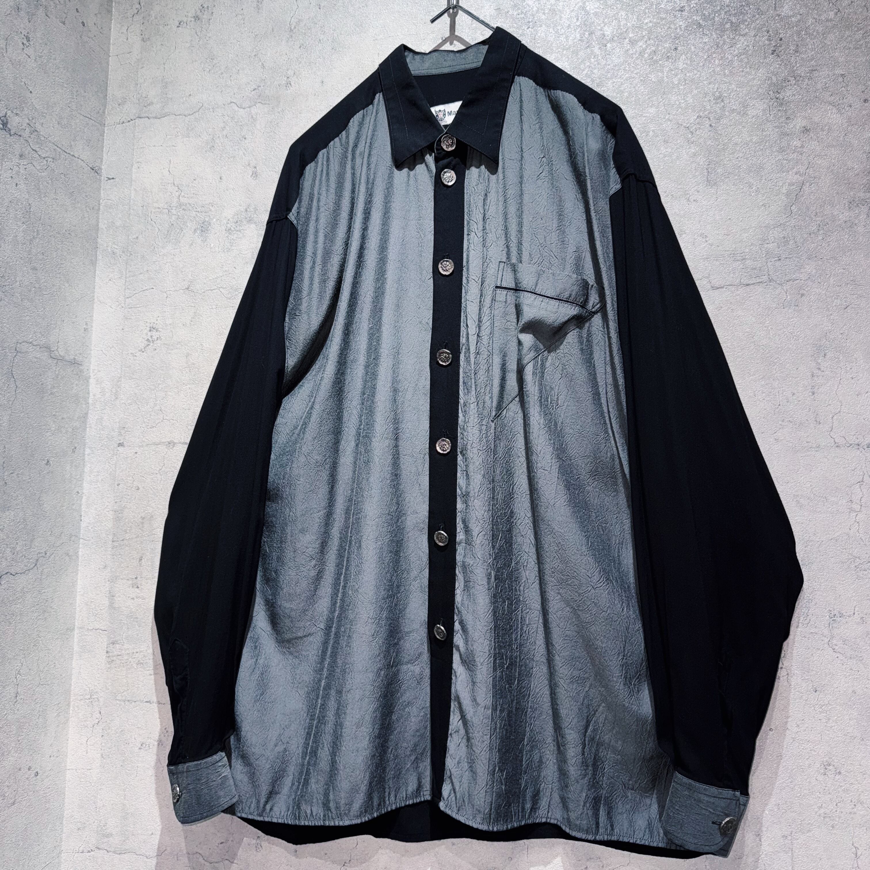 フロントや袖などが異素材にスイッチングしたハイモードな佇まいのデザインシャツ。ブラックと光沢感のあるグレーのスイッチングは高級感を演出しています。